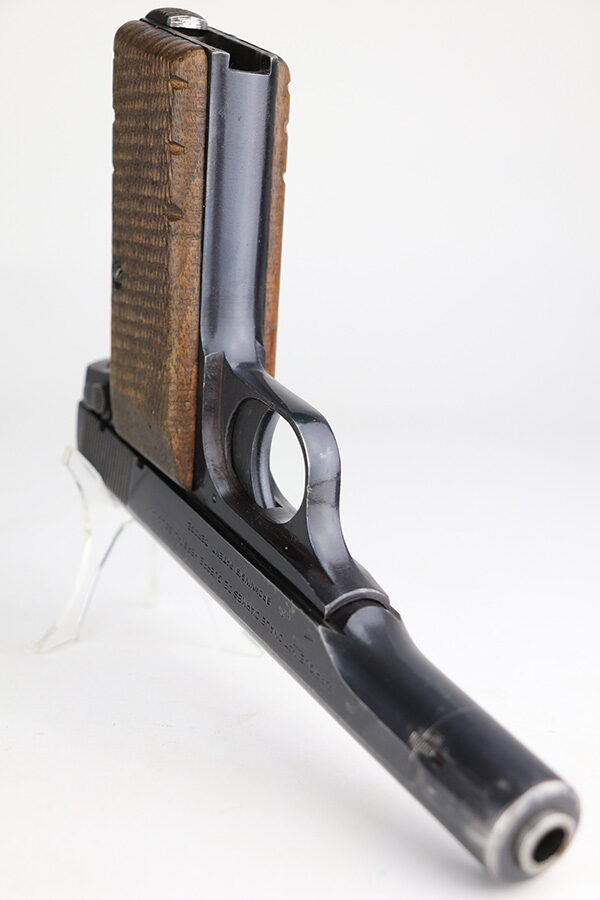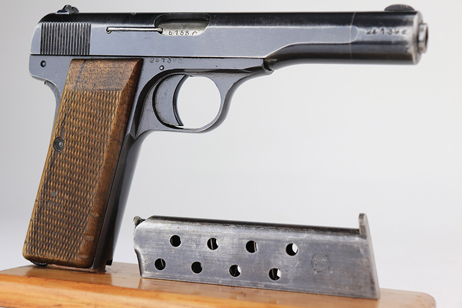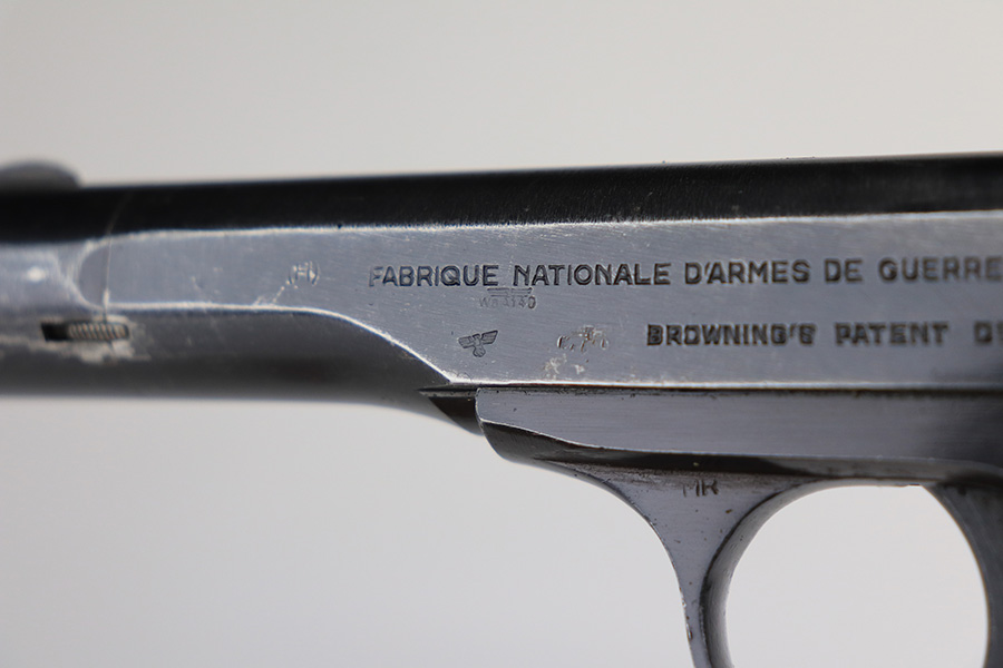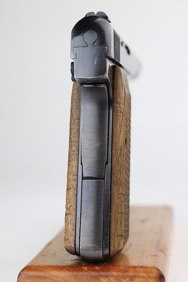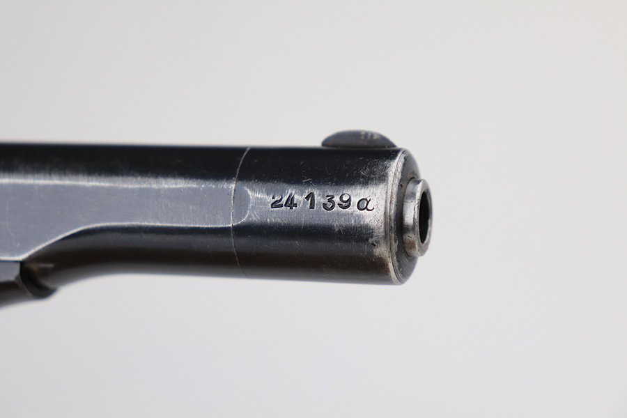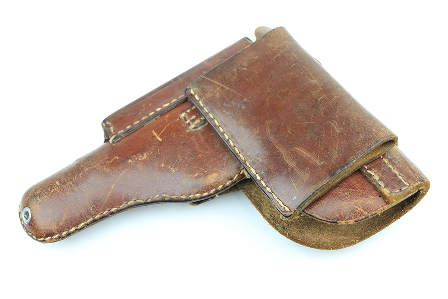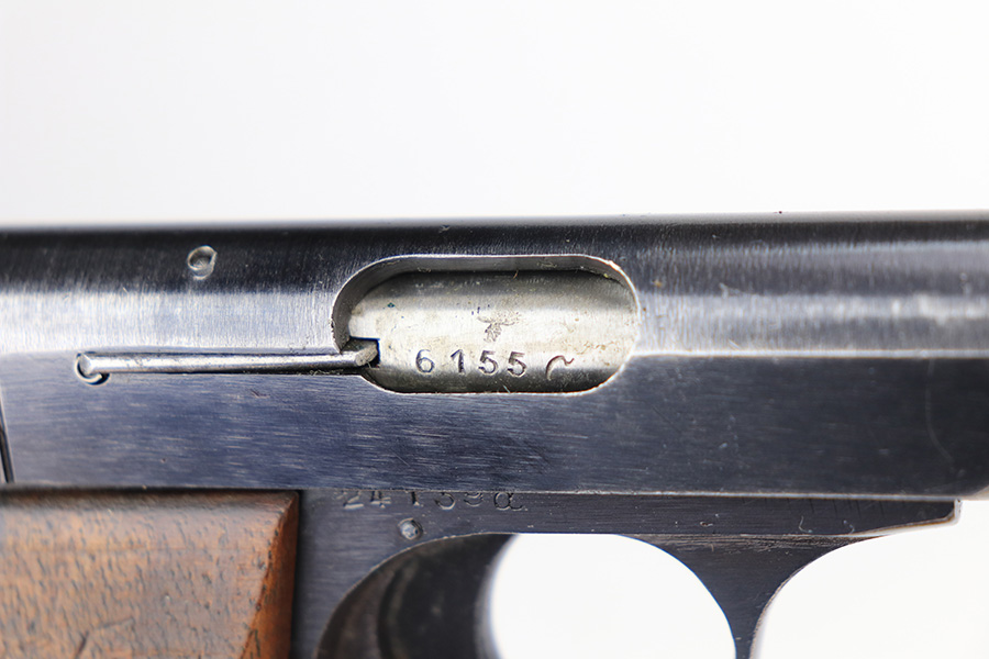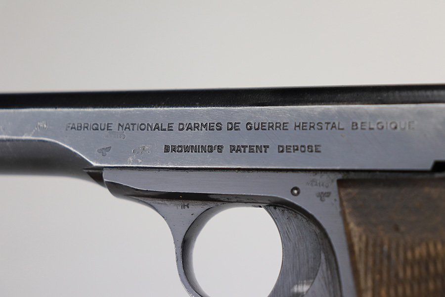 1/12/22 – This is a very nice example of an FN Browning Model 1922 issued to the Nazi military during WW2. It is all matching, except for the barrel, and has the proper “Waffen 140” Nazi military acceptance proofs. It comes as a rig with a nice period-correct tan leather holster and two period-correct magazines (one is “Waffen 140” proofed). The gun has retained about 93-94% of its original finish. Generally, there is minor wear along the high edges of the slide and around the muzzle. There are some light scratches around the muzzle as well. A few tiny dots of discoloration on the left side of the slide. Hints of thinning on the top of the slide. Comes with nice period-correct wood grips that have notches on both sides. The bore is near-mint.