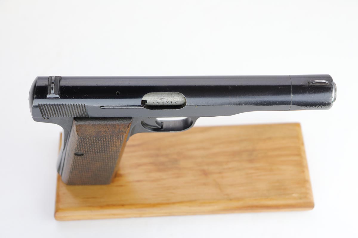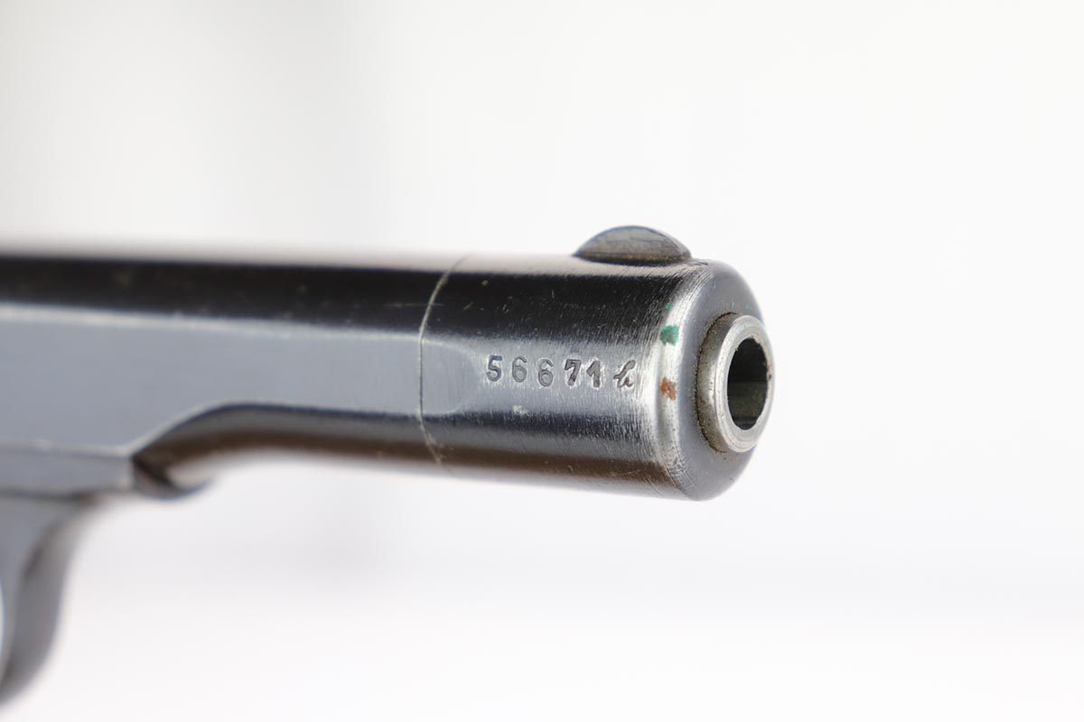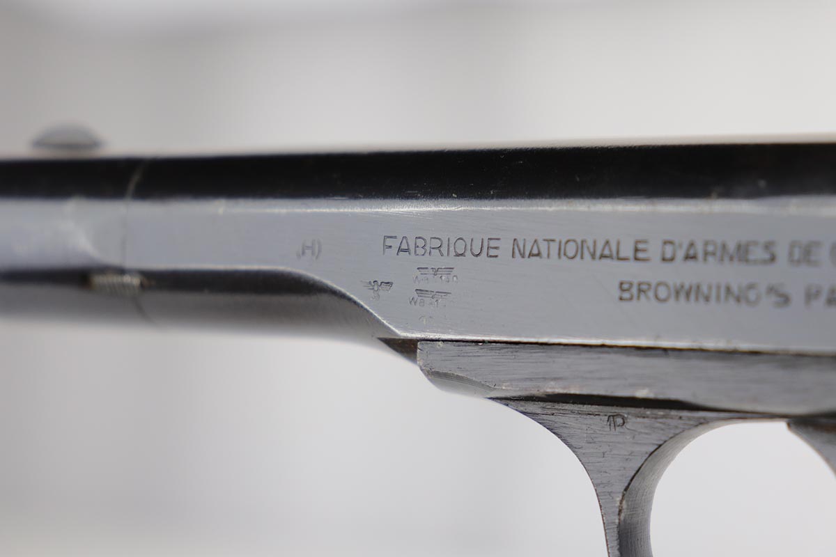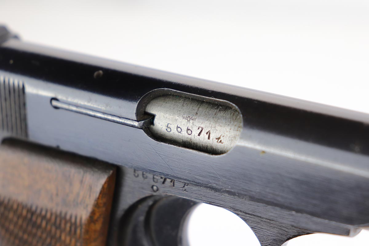 2/20/20 – This is a nice, original FN Browning M1922 that was issued to the Nazi Army late in the war. It has a very nice profile view with mostly standard muzzle wear, but the majority of the finish loss is on the back strap/grip safety. All matching parts with original wood grips that show some smoothing and handling wear. Minty bore. Note that the slide stop needs to be held in place to keep slide back, which is extremely common on these pistols. Likely just a weak spring.