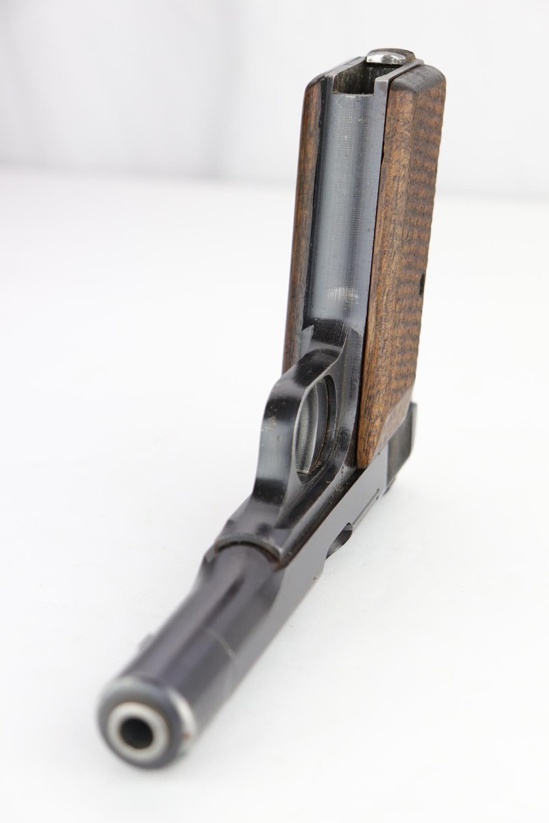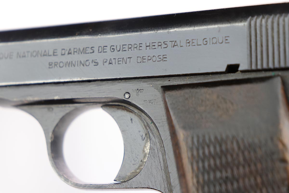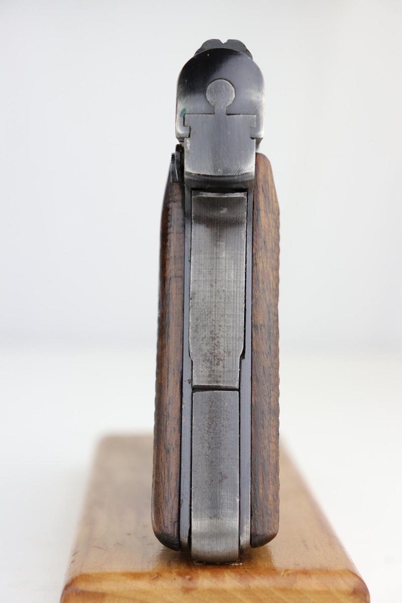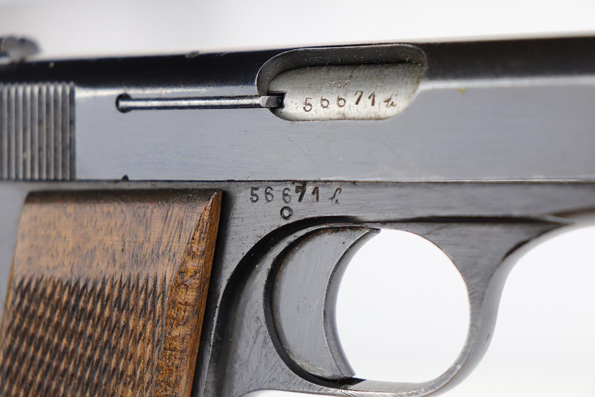 2/20/20 – This is a nice, original FN Browning M1922 that was issued to the Nazi Army late in the war. It has a very nice profile view with mostly standard muzzle wear, but the majority of the finish loss is on the back strap/grip safety. All matching parts with original wood grips that show some smoothing and handling wear. Minty bore. Note that the slide stop needs to be held in place to keep slide back, which is extremely common on these pistols. Likely just a weak spring.