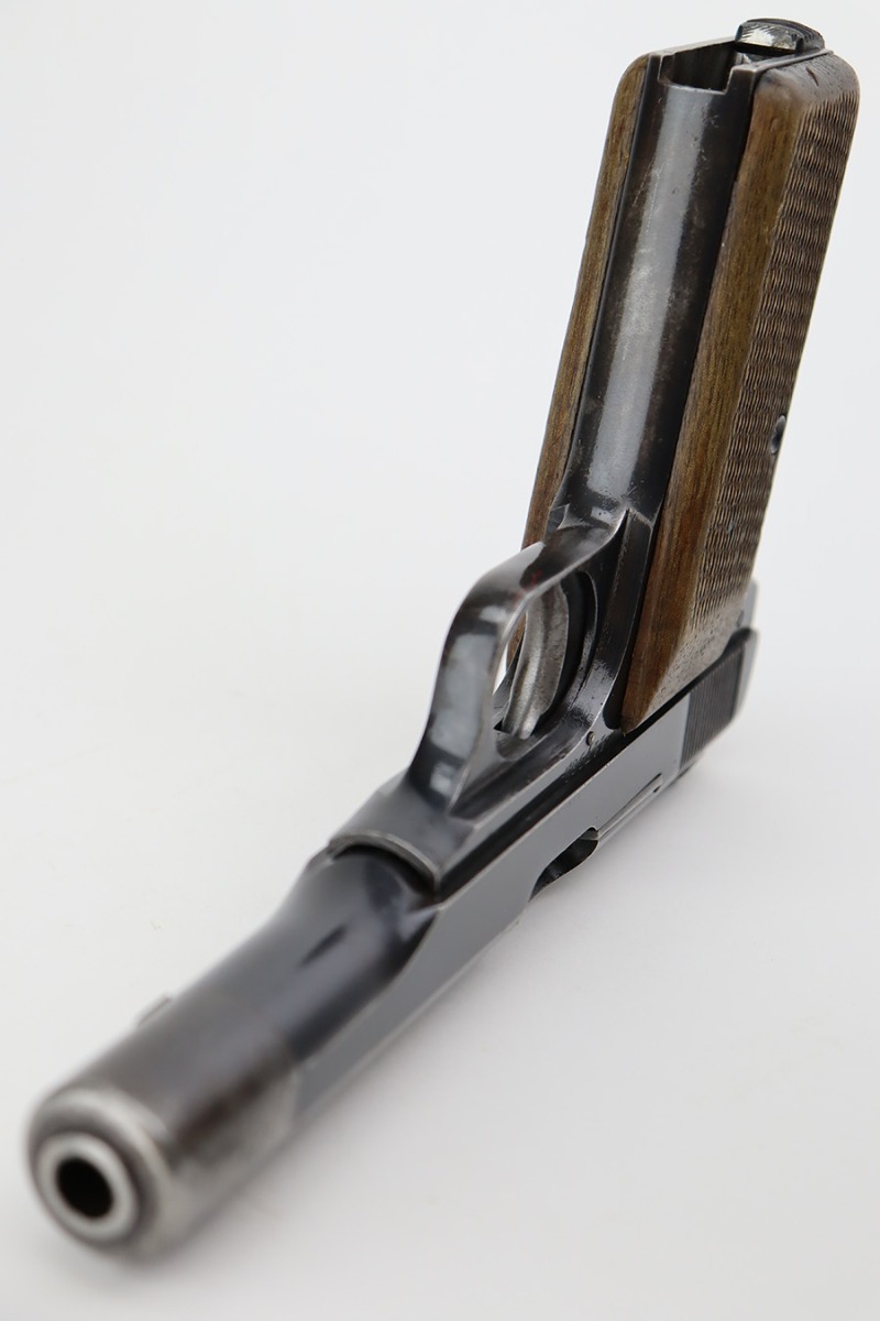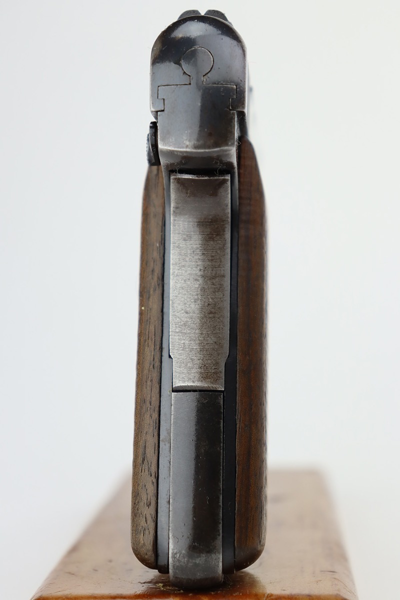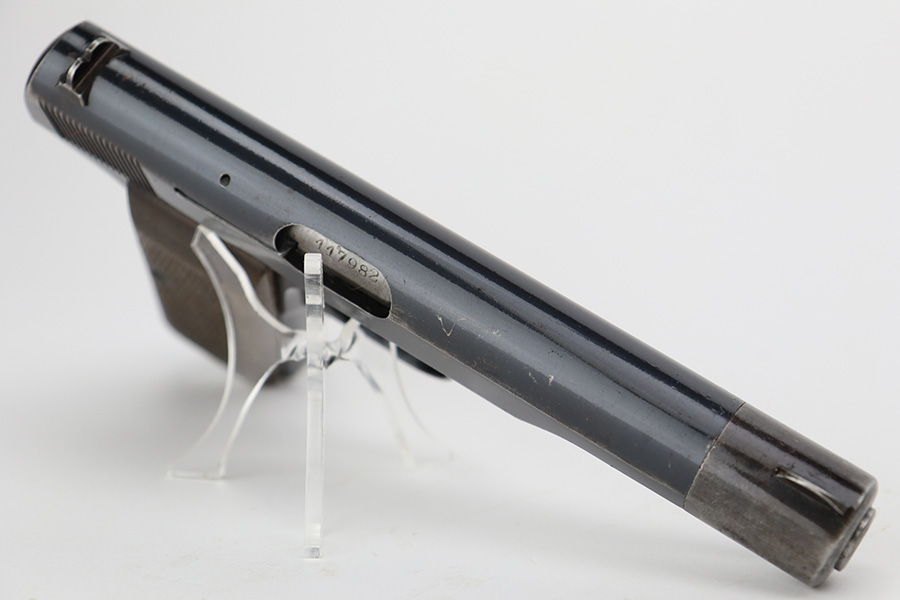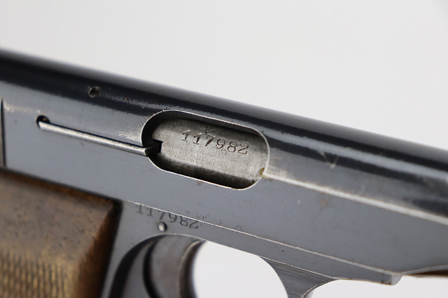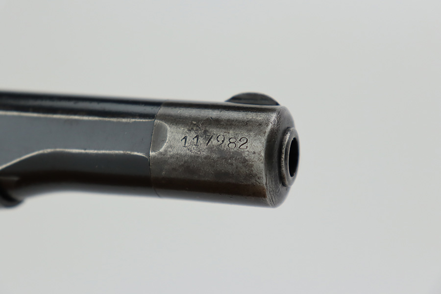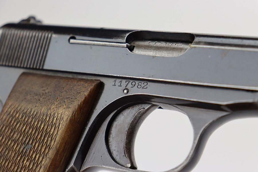 8/1/23 – This is a nice example of an FN Browning Model 1922 issued to the Nazi military during WW2. It is all matching and has the proper “Waffen 140” military acceptance proofs. It has retained roughly 75% of its original finish. The majority of the wear is around the muzzle and on the grip straps, and there is some light spotty oxidation along the left side of the slide. Fitted with nice period-correct wood grips. Comes with one proper magazine. The bore has strong rifling, but there is some light spotty oxidation here and there.