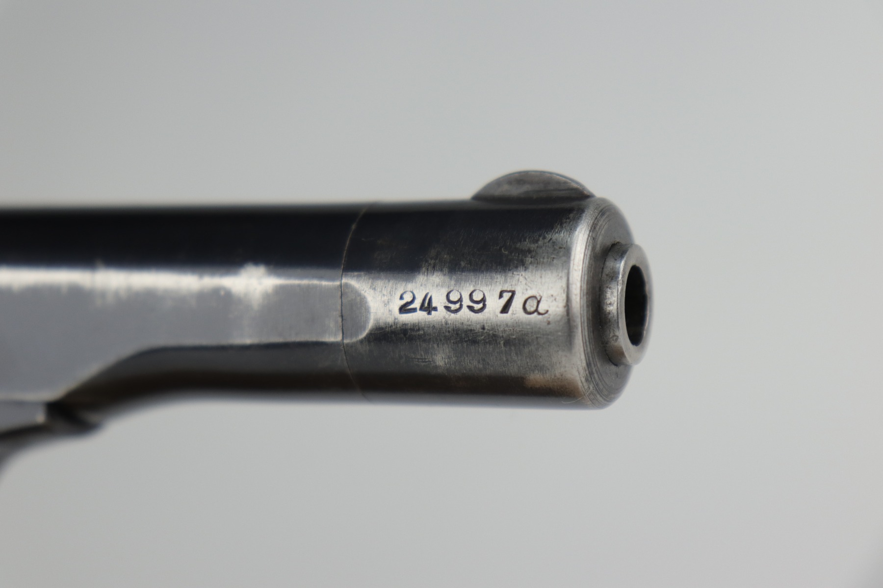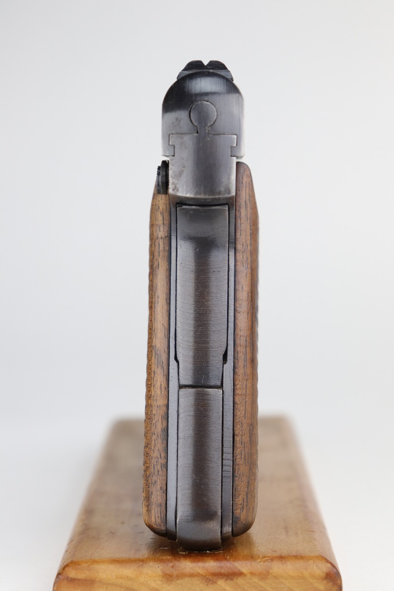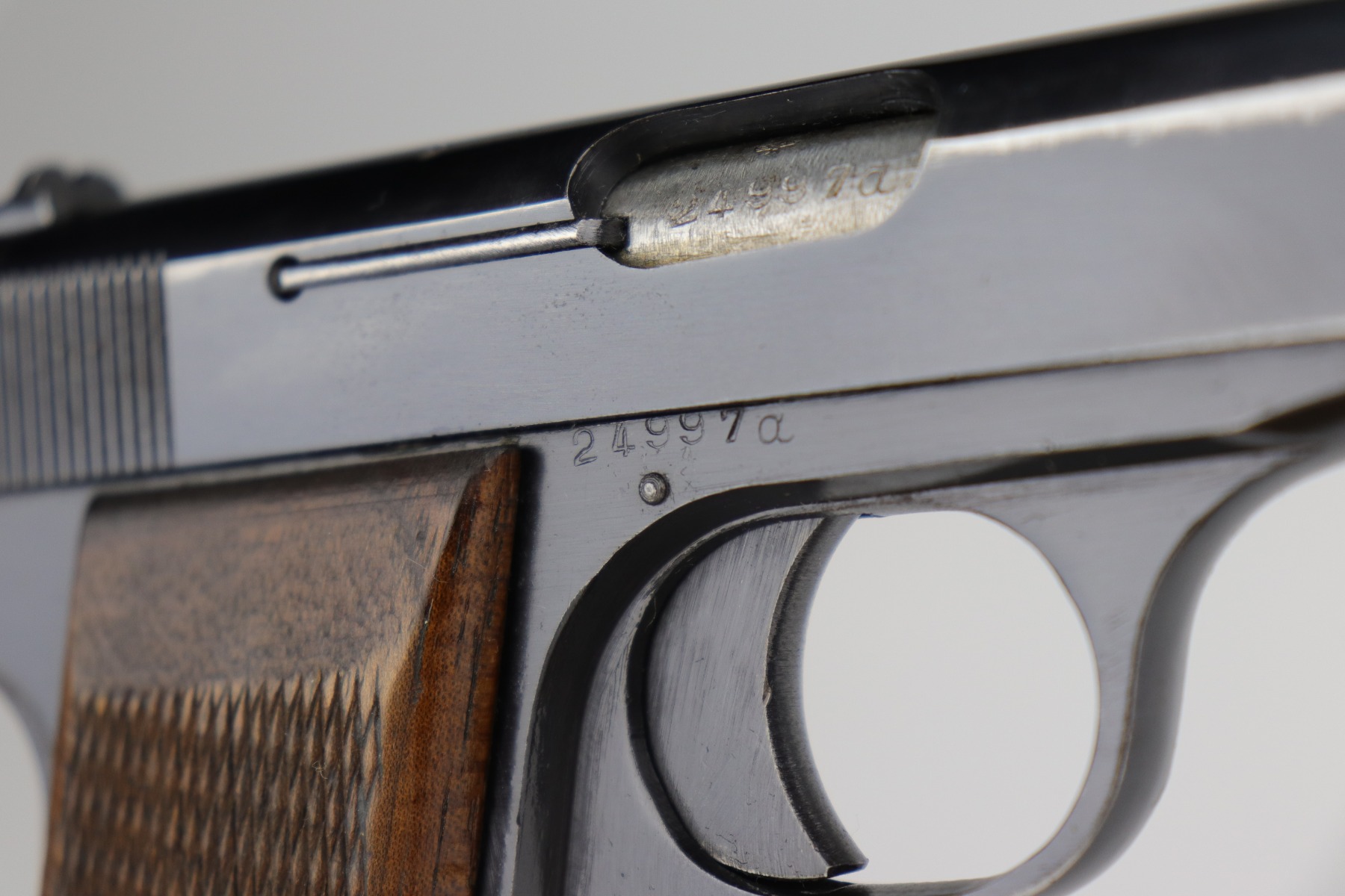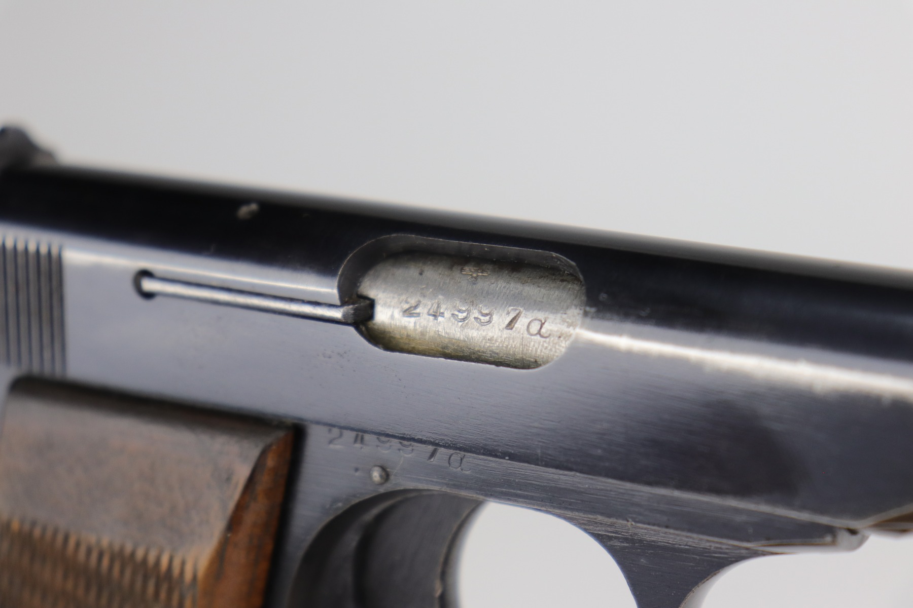 12/15/20 – This is a nice example of a FN Browning Model 1922 issued to the Nazi military during WW2. It is all matching and has the proper “Eagle 140” Nazi military acceptance proofs. It has retained about 90% of its bluing. While there isn’t much actual finish loss, the front half of the slide has minor discoloration. There is wear around the muzzle and on the high edges of the slide. Excellent grips and a period-correct magazine. The bore is excellent – shiny with strong rifling.