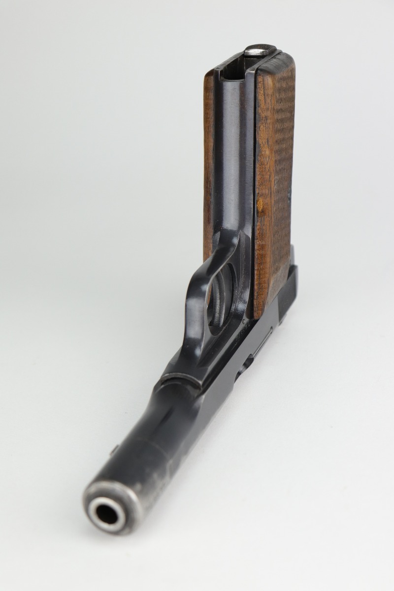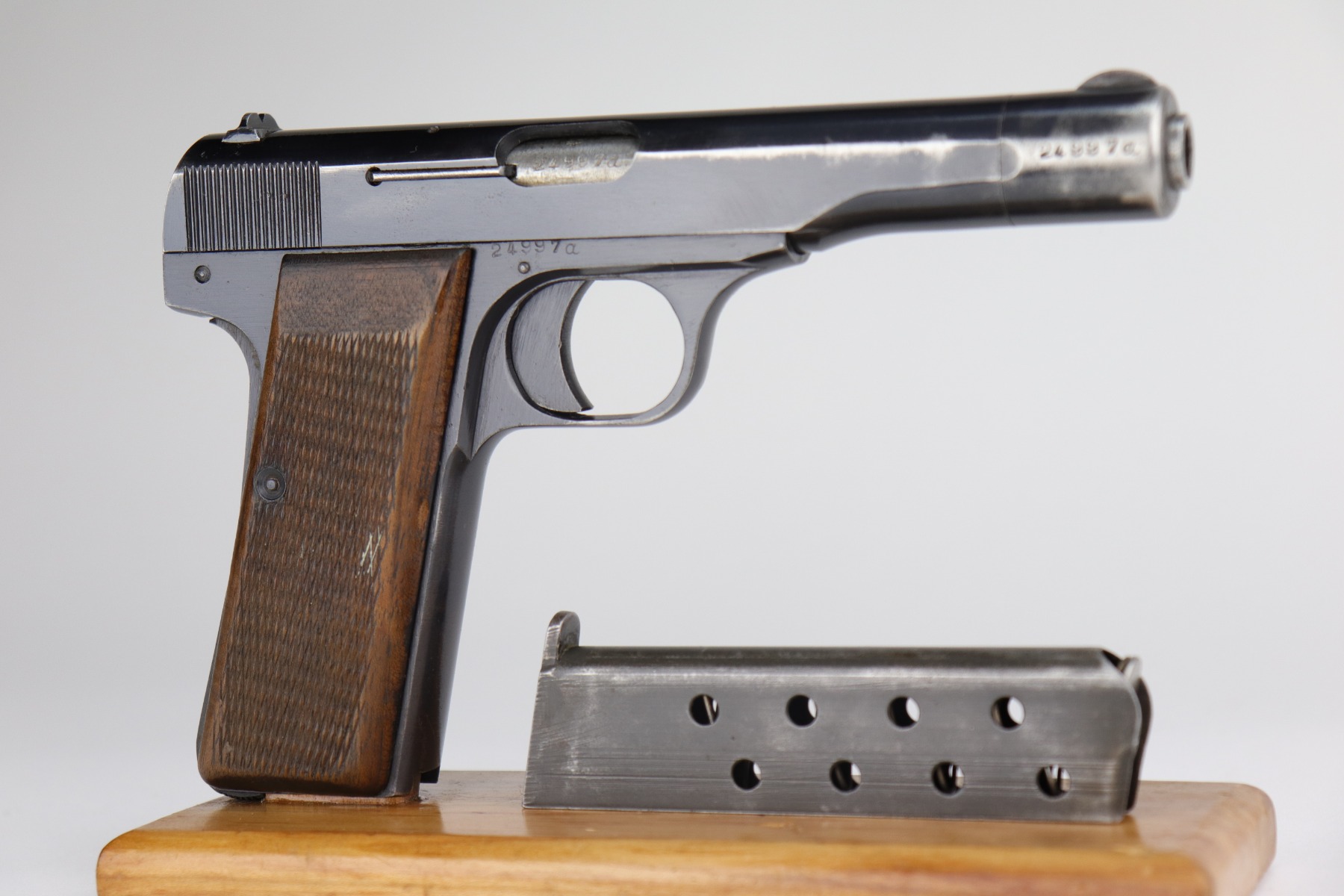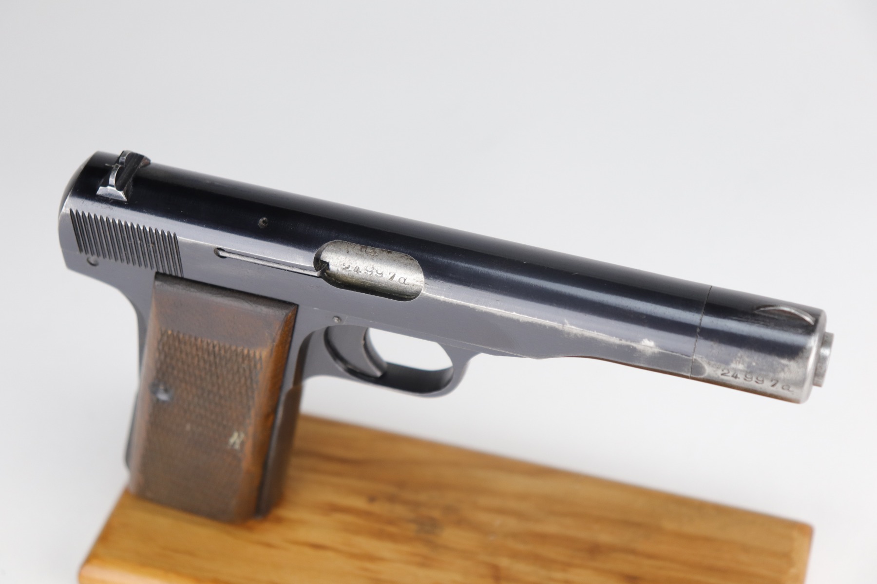 12/15/20 – This is a nice example of a FN Browning Model 1922 issued to the Nazi military during WW2. It is all matching and has the proper “Eagle 140” Nazi military acceptance proofs. It has retained about 90% of its bluing. While there isn’t much actual finish loss, the front half of the slide has minor discoloration. There is wear around the muzzle and on the high edges of the slide. Excellent grips and a period-correct magazine. The bore is excellent – shiny with strong rifling.