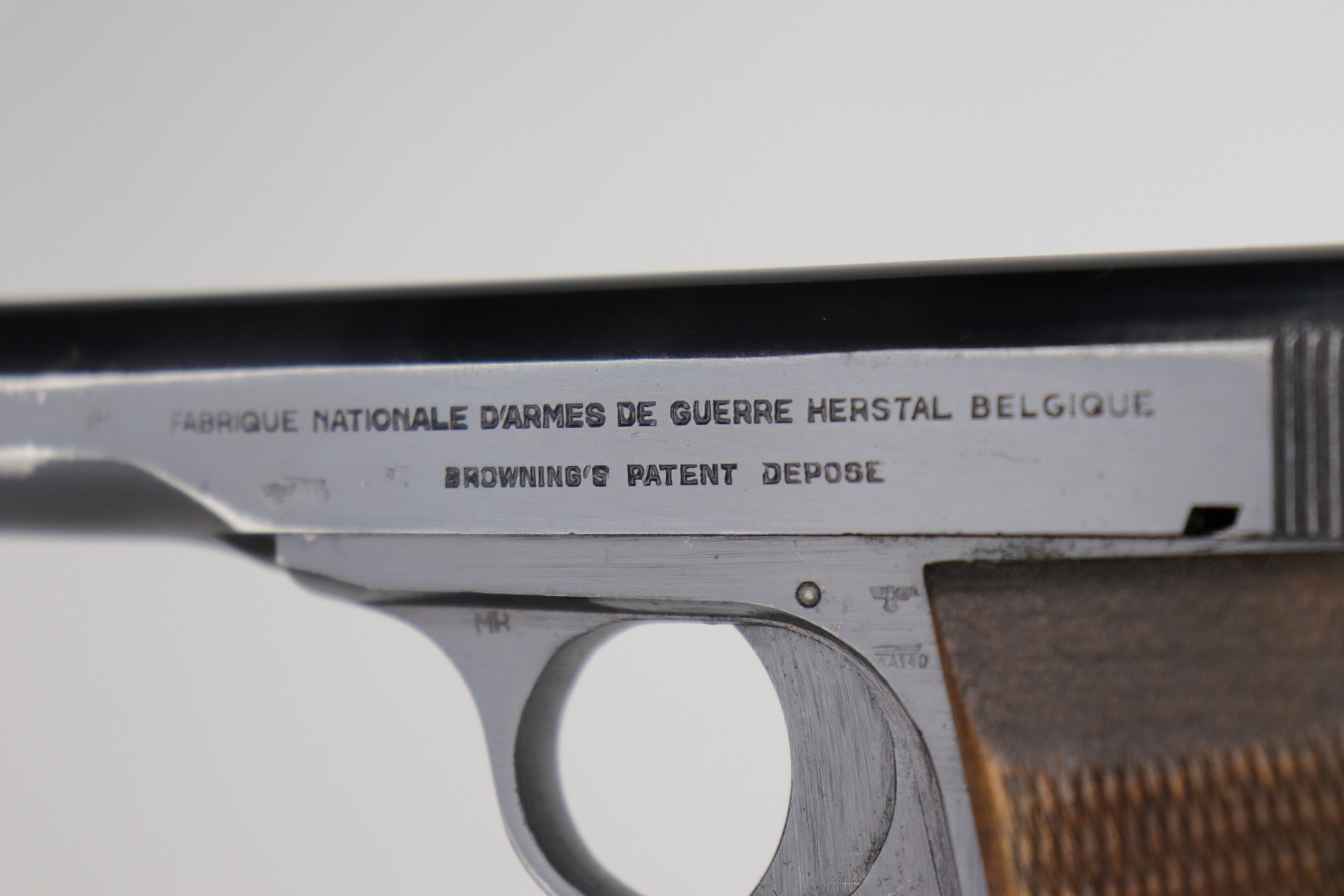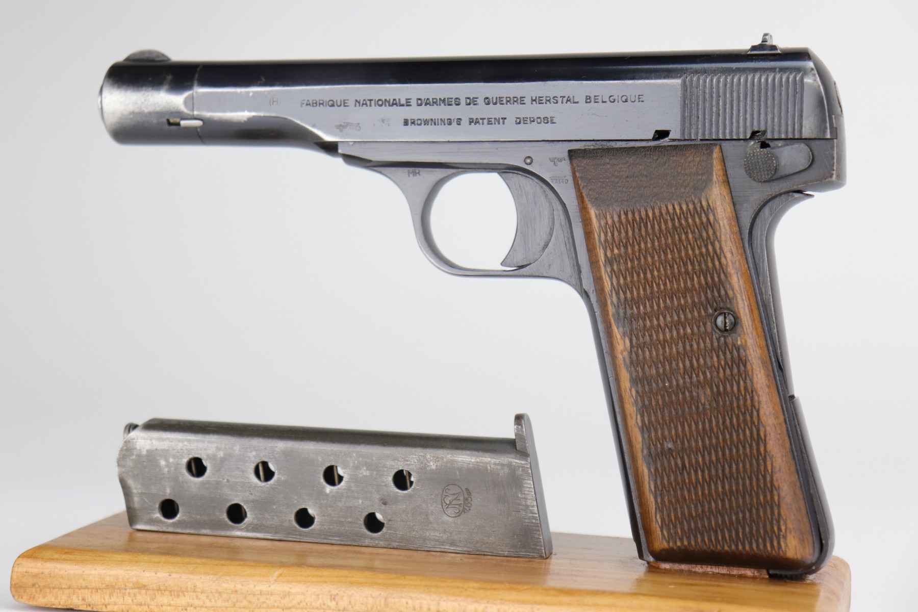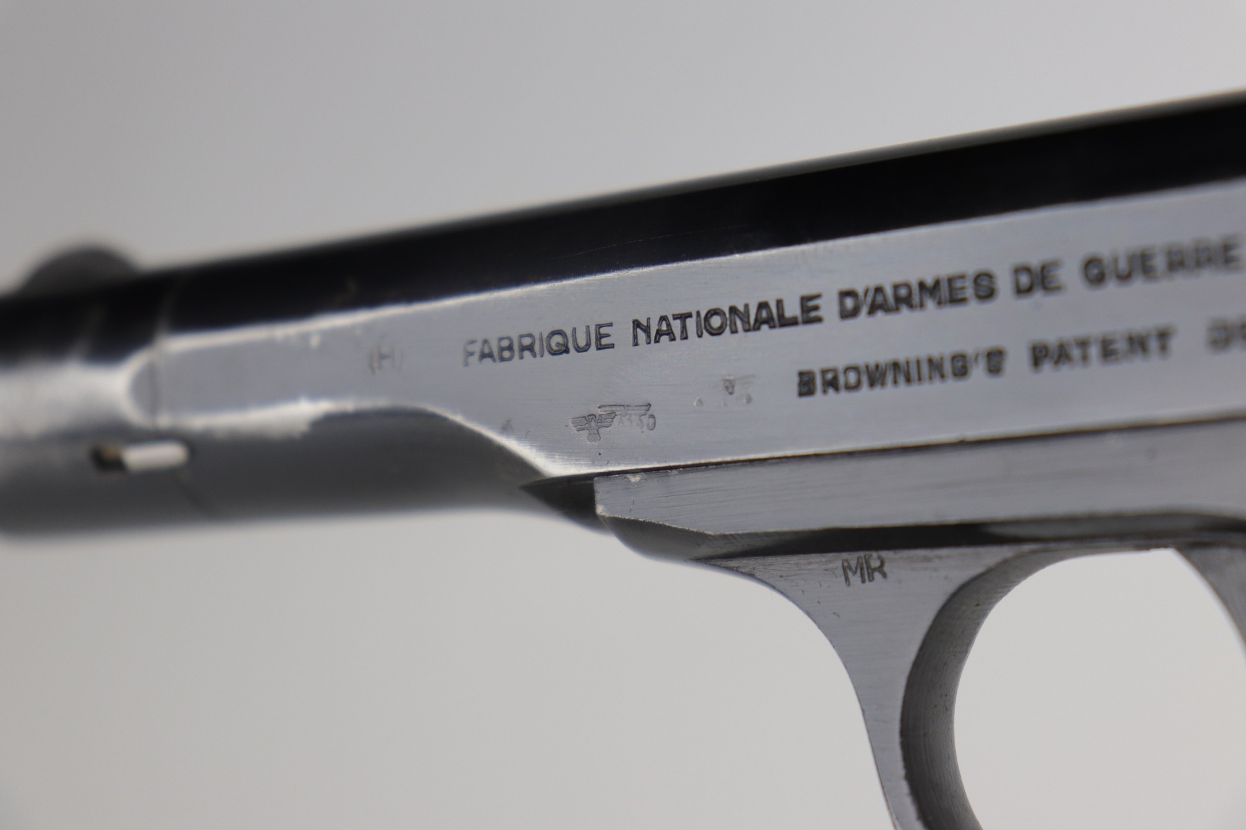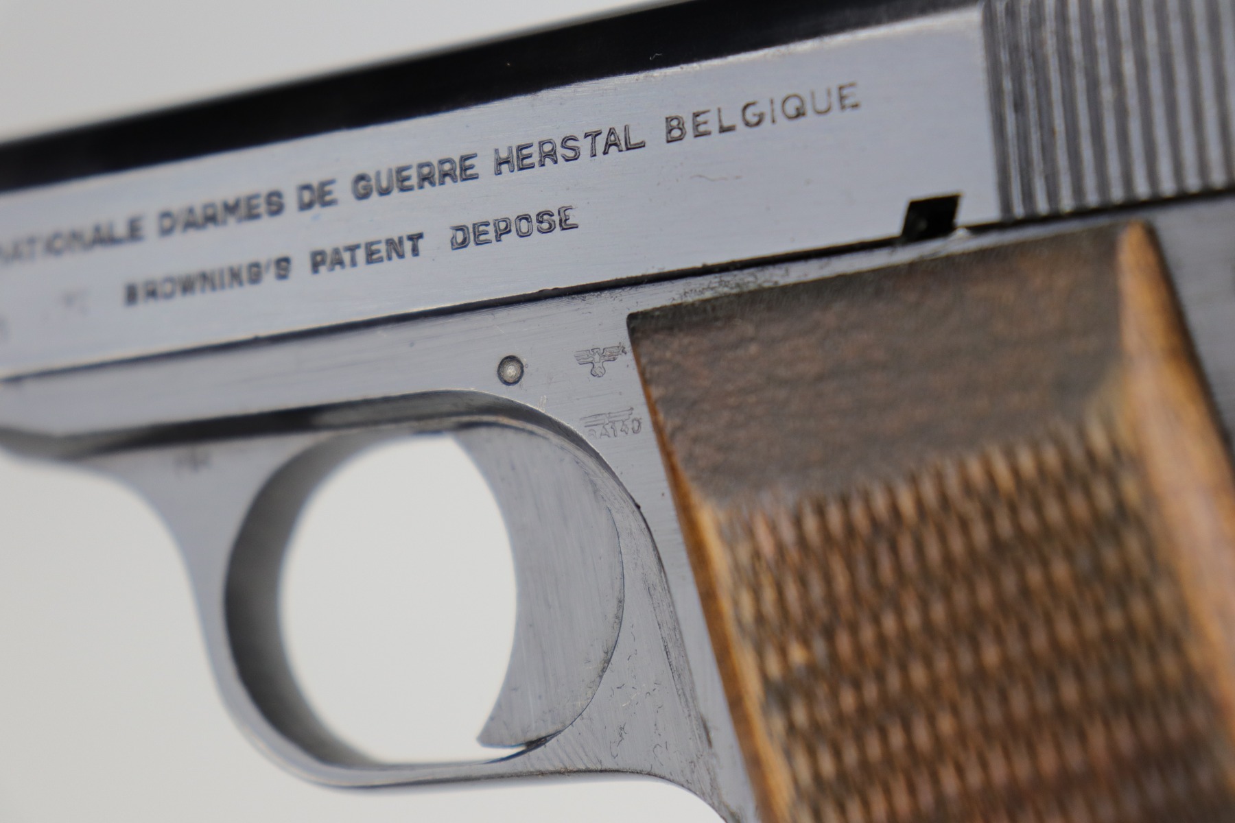 12/15/20 – This is a nice example of a FN Browning Model 1922 issued to the Nazi military during WW2. It is all matching and has the proper “Eagle 140” Nazi military acceptance proofs. It has retained about 90% of its bluing. While there isn’t much actual finish loss, the front half of the slide has minor discoloration. There is wear around the muzzle and on the high edges of the slide. Excellent grips and a period-correct magazine. The bore is excellent – shiny with strong rifling.
