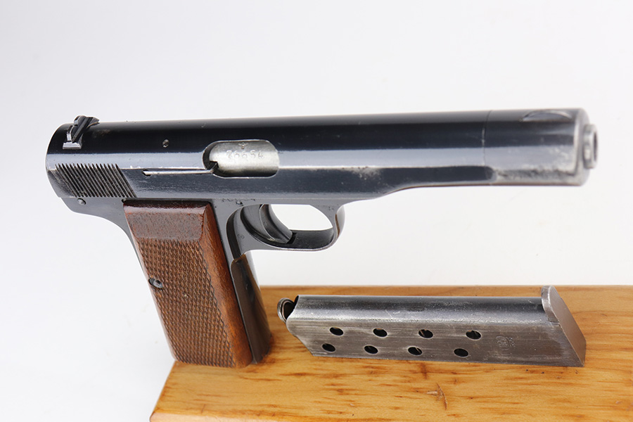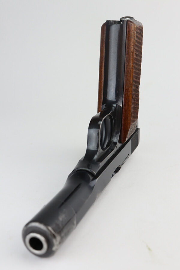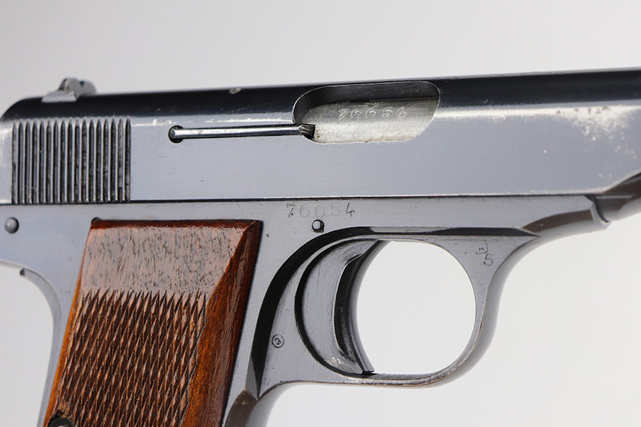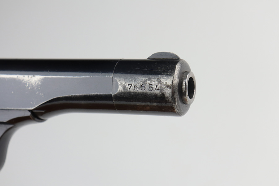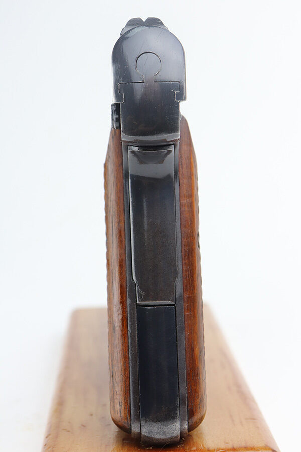 6/14/21 – This is a very nice example of an FN Browning Model 1922 issued to the Nazi military during WW2. It is all matching and has the proper “Waffen 140” military proofs. It has retained about 93% of its original finish. There is wear around the muzzle, minor wear on the high edges of the slide, and small spots of wear on the right side and top of the slide. Spotty oxidation around the muzzle. Very minor pin-pricking on the straps. Comes with excellent wood grips and a period-correct magazine. Mint bore.