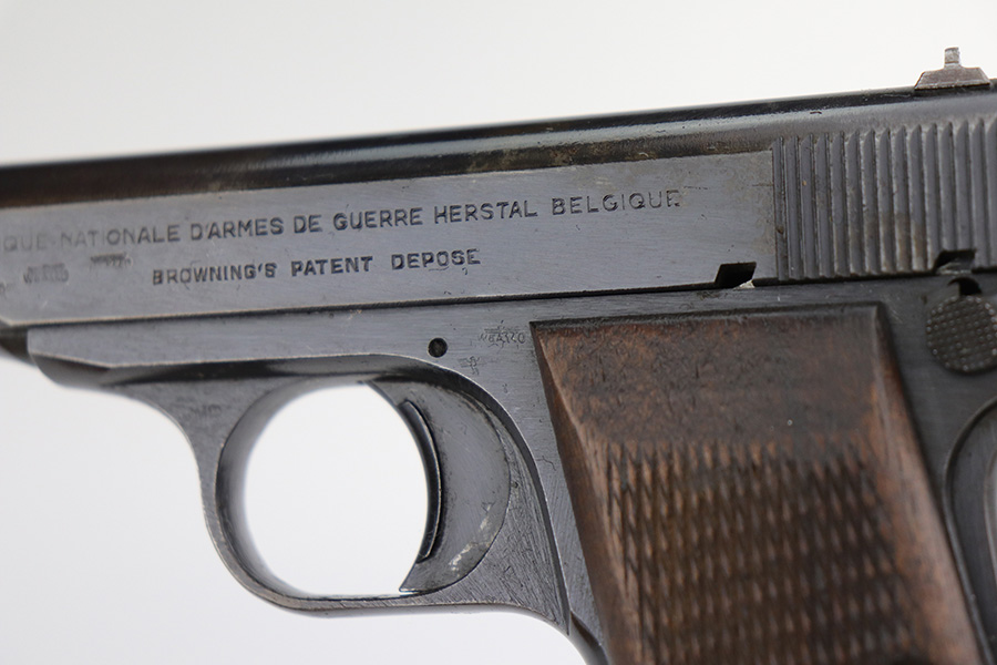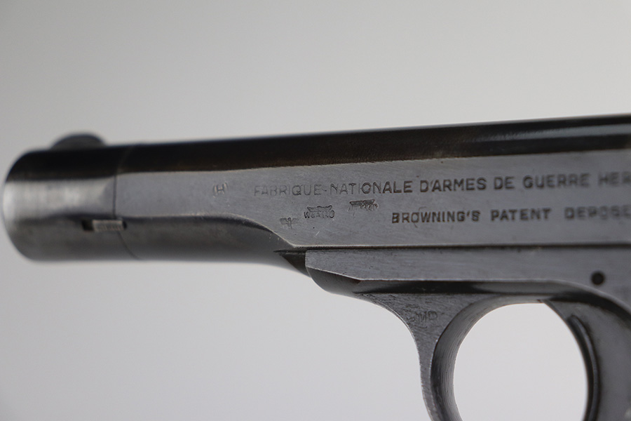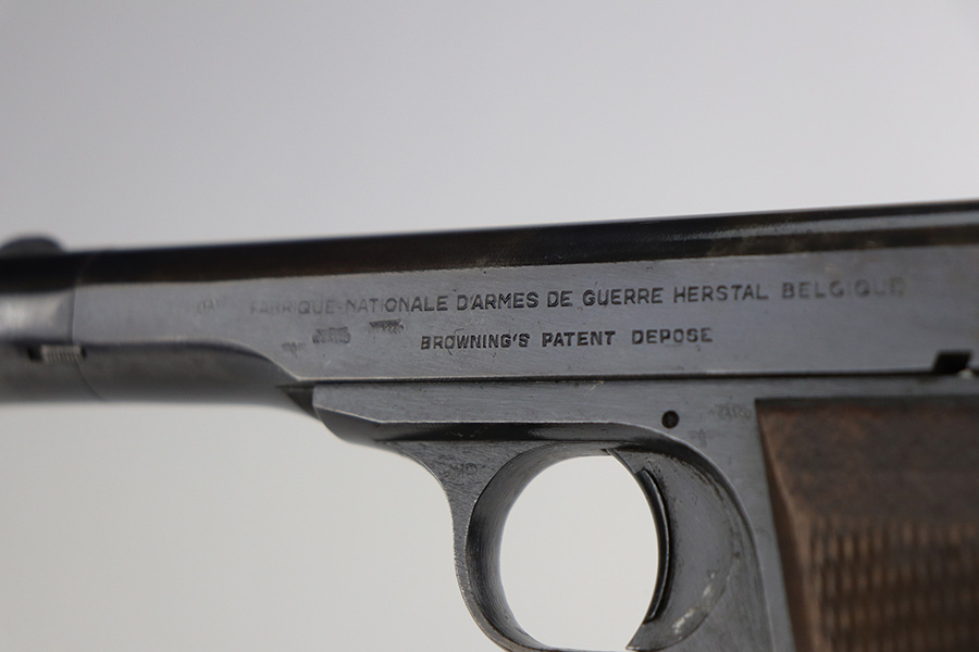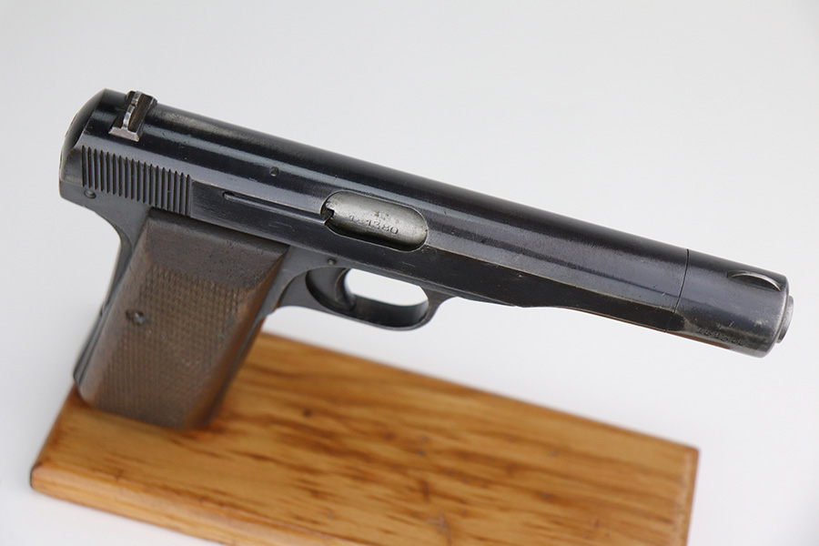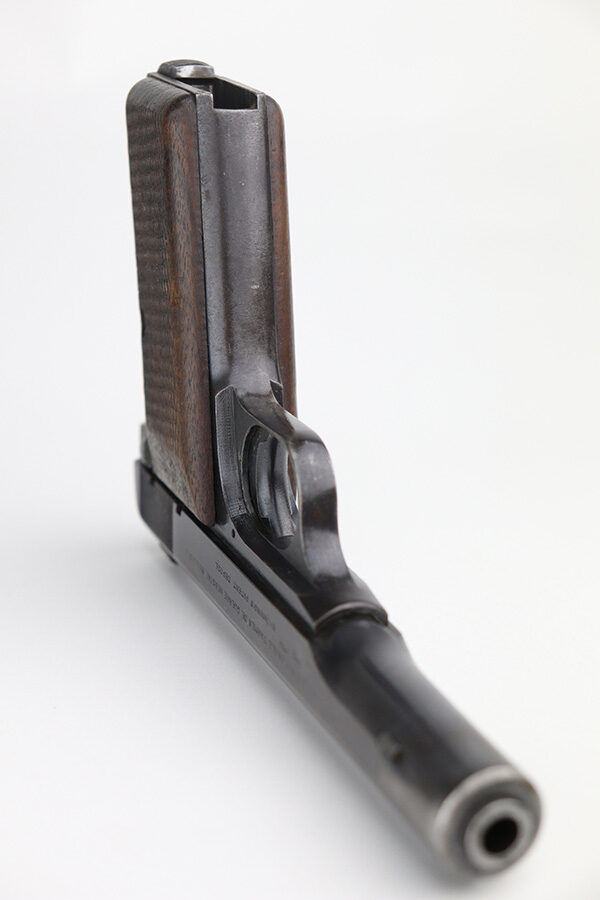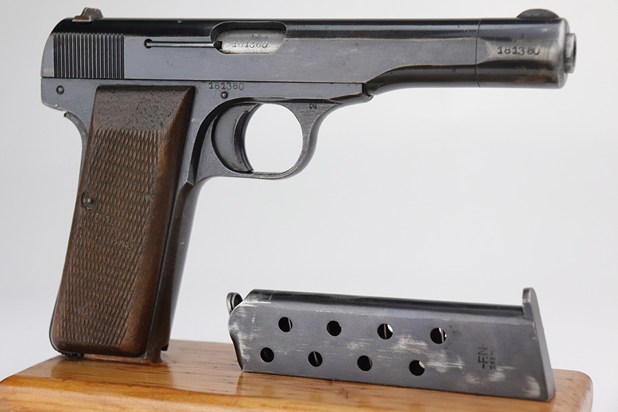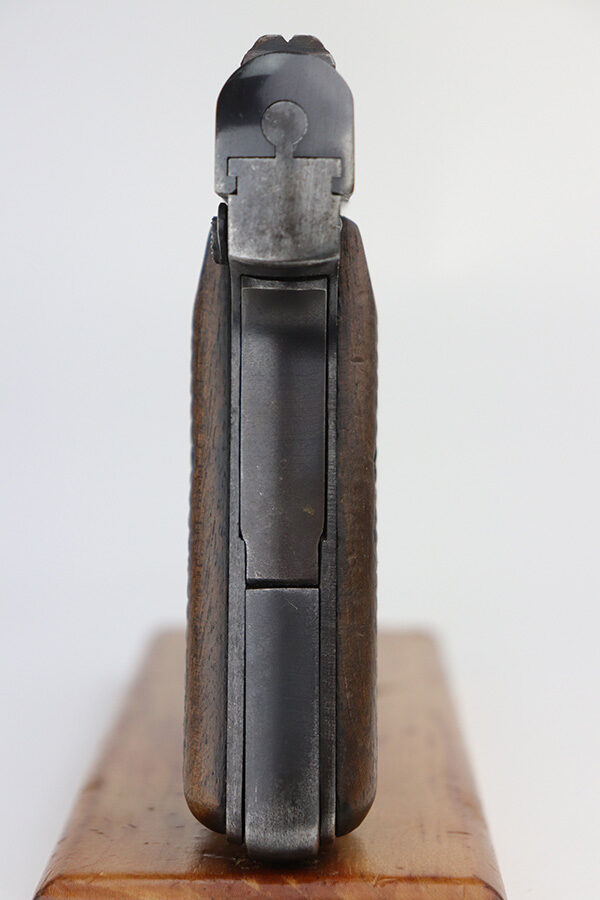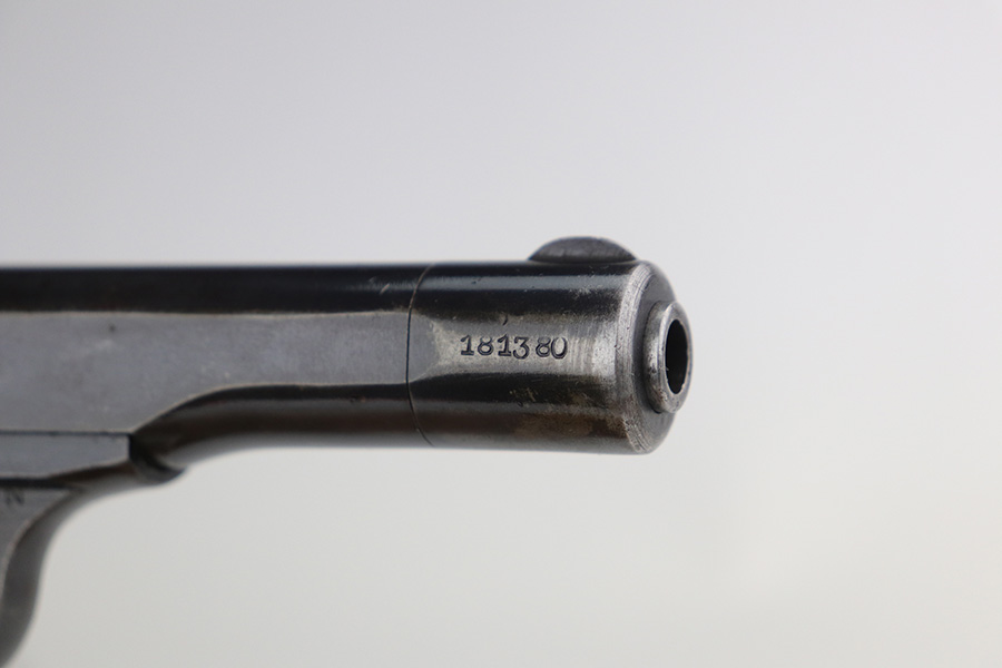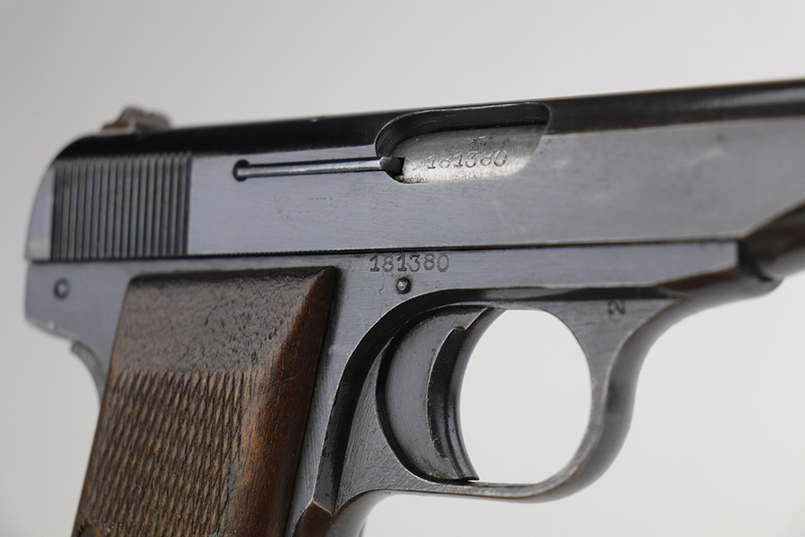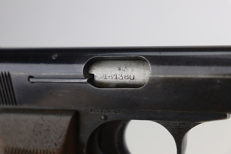9/17/21 – This is a nice example of an FN Browning Model 1922 issued to the Nazi military during WW2. It is all matching and has the proper “Waffen 140” military acceptance proofs. It has retained roughly 80% of its original finish. There is spotty wear and discoloration throughout, concentrated around the high edges of the slide and around the muzzle. There is spotty oxidation and dark patina on the straps. Comes with excellent wood grips and a period-correct magazine. The bore has decent rifling with very minor pin-pricking throughout.