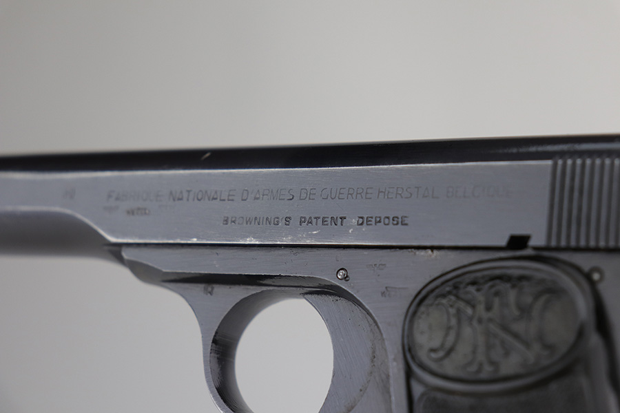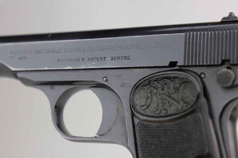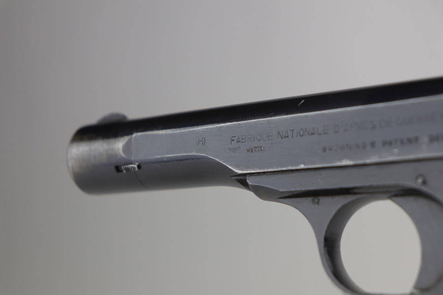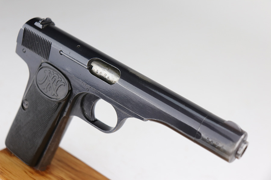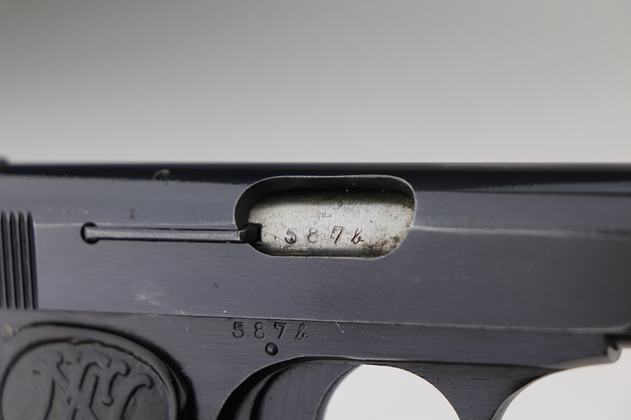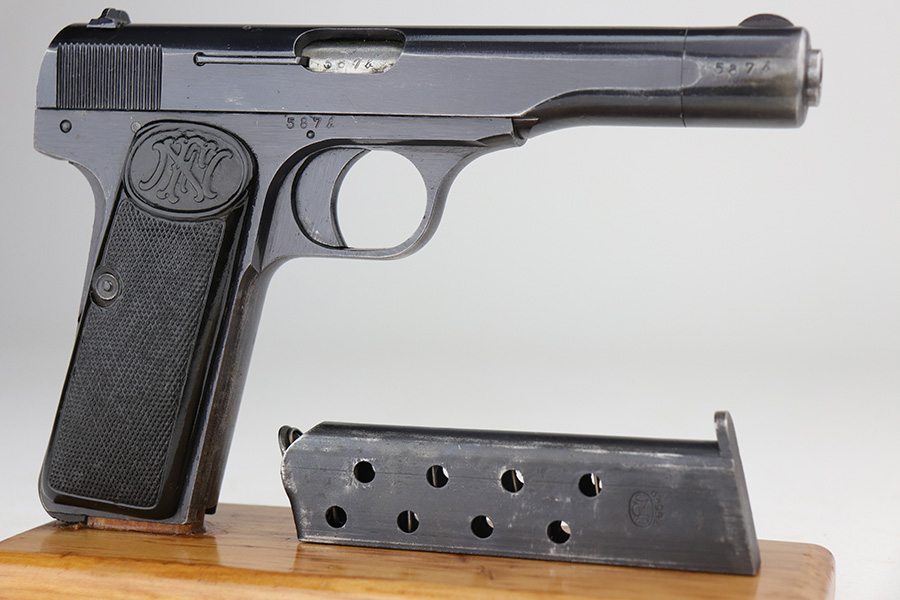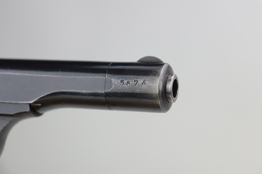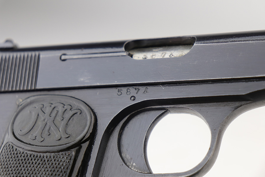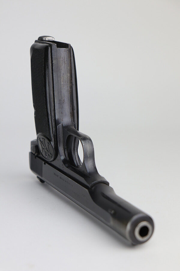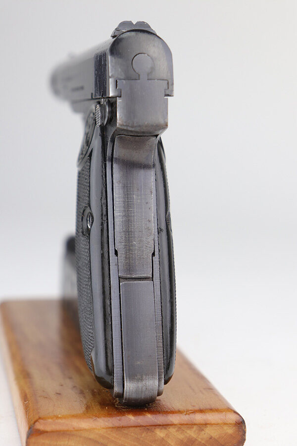 10/20/21 – This is a very nice example of an FN Browning Model 1922 issued to the Nazi military during WW2. It is all matching and has the proper “Waffen 140” Nazi military proofs on the left side of the slide and frame. It comes with one period-correct magazine. The gun has retained roughly 85% of its finish. Most of the wear is around the muzzle, but there is minor wear around the high edges of the slide, on underside of the trigger guard, and minor thinning on both straps. Comes with excellent period-correct black bakelite grips. The bore is mint – shiny with very strong rifling.