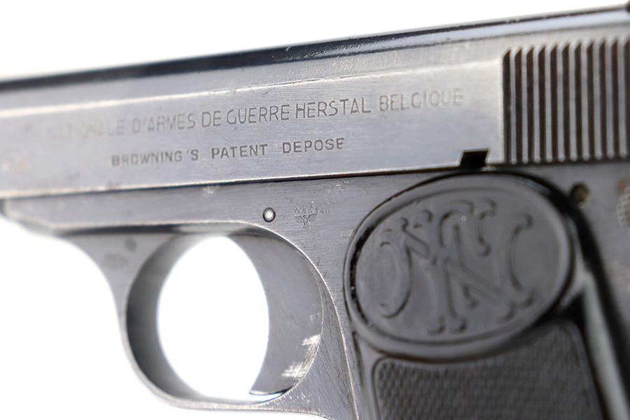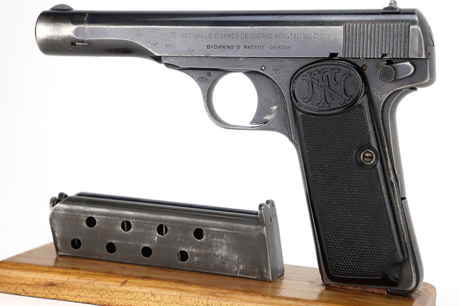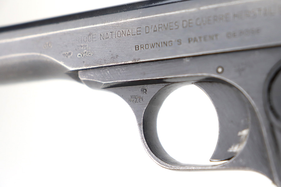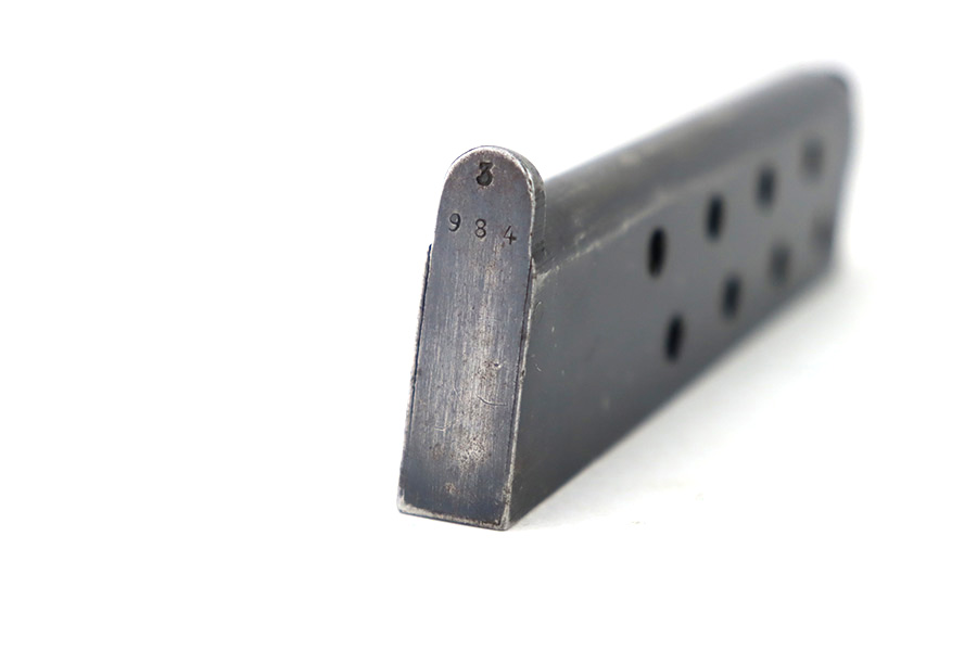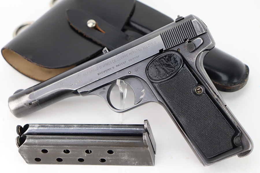 1/12/24 – This is a very nice example of an FN Browning Model 1922 issued to the Nazi military during WW2. It is all matching and has the proper “Waffen 140” German military acceptance proofs. Comes as a rig with two period-correct magazines (one magazine is numbered but mismatched) and a post-war black leather holster. The original finish rates roughly 85% with general high edge wear, thinning on the grip straps, and wear around the muzzle. Fitted with excellent black bakelite grips. The bore is shiny with great rifling, but there is some tiny pin-pricking in the grooves.