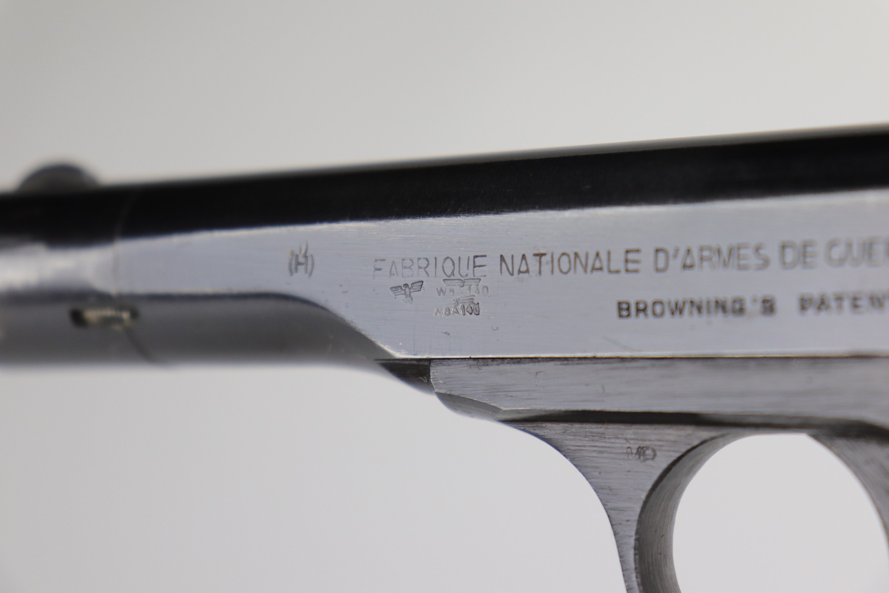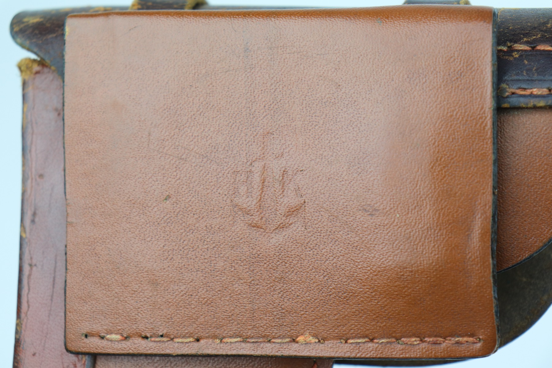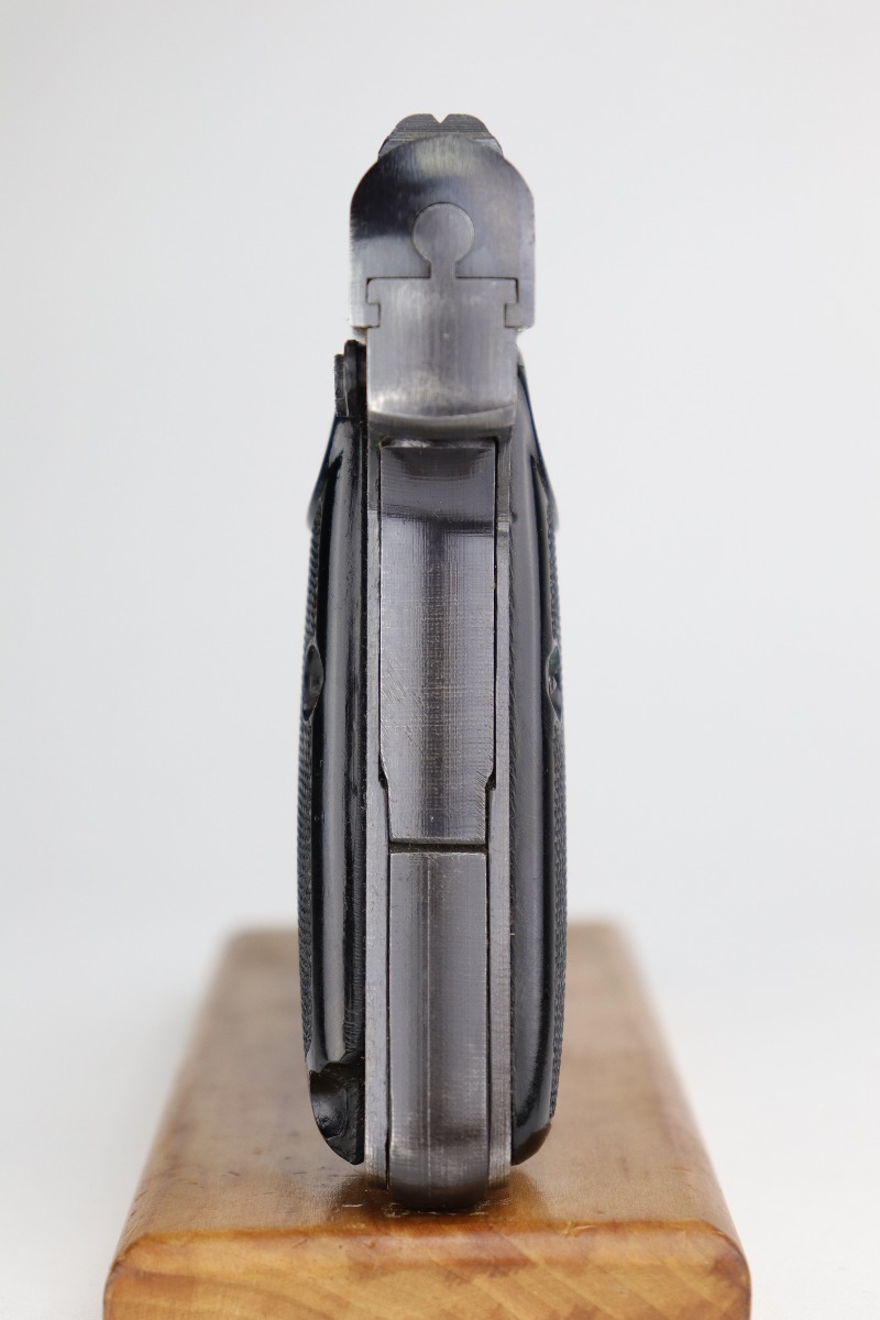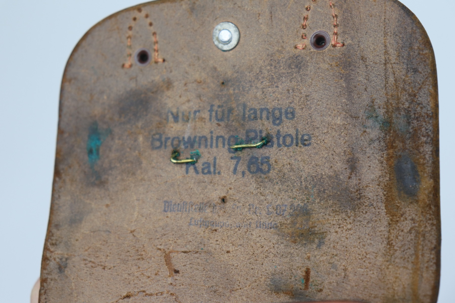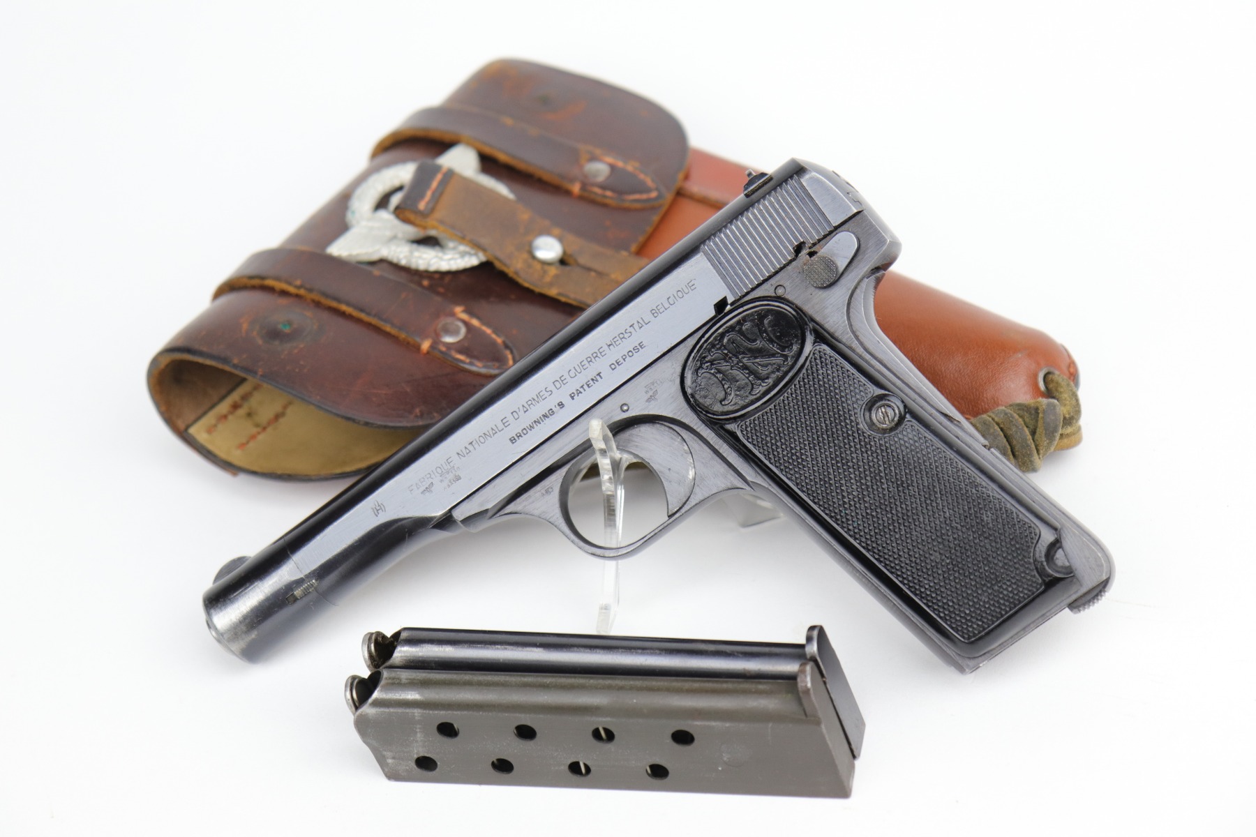10/8/20 – This is a very nice example of an FN Browning Model 1922 Rig issued to the Nazi military during WW2. It comes with a holster and two magazines. The gun is all matching and has the proper “Waffen 140” Nazi military proofs. It has retained somewhere between 85-90% of its original bluing. There is minor muzzle wear, hint of wear on the high edges of the slide, and very minor thinning on the straps. There a few very minor surface scratches here and there. The bore is minty. Excellent period correct grips. Both magazines are period-correct and one has a phosphate finish. The holster is “HK” marked, and a Nazi insignia has been added to the top flap. There are two holes in the top flap where an accessory has been removed. The ink stamp is still visible on the inside. There are a few stitches missing here and there.