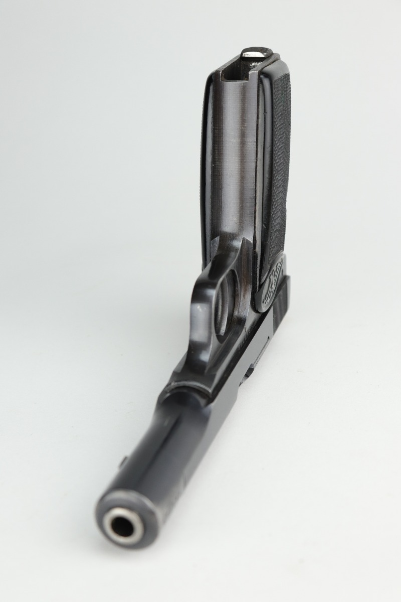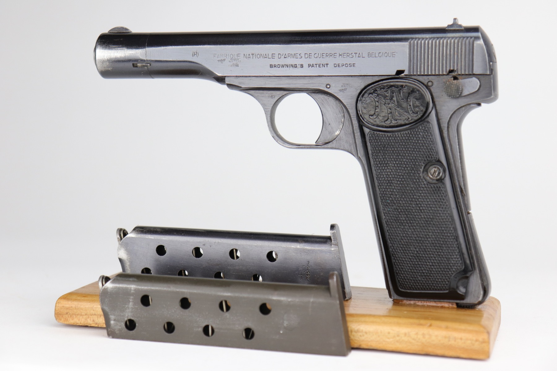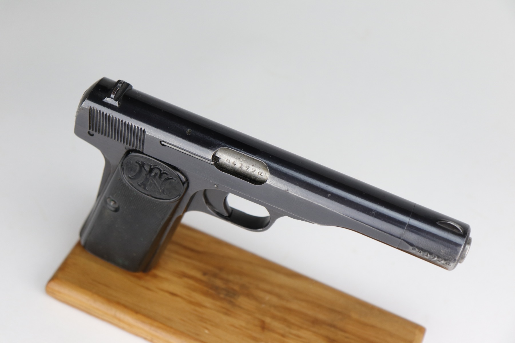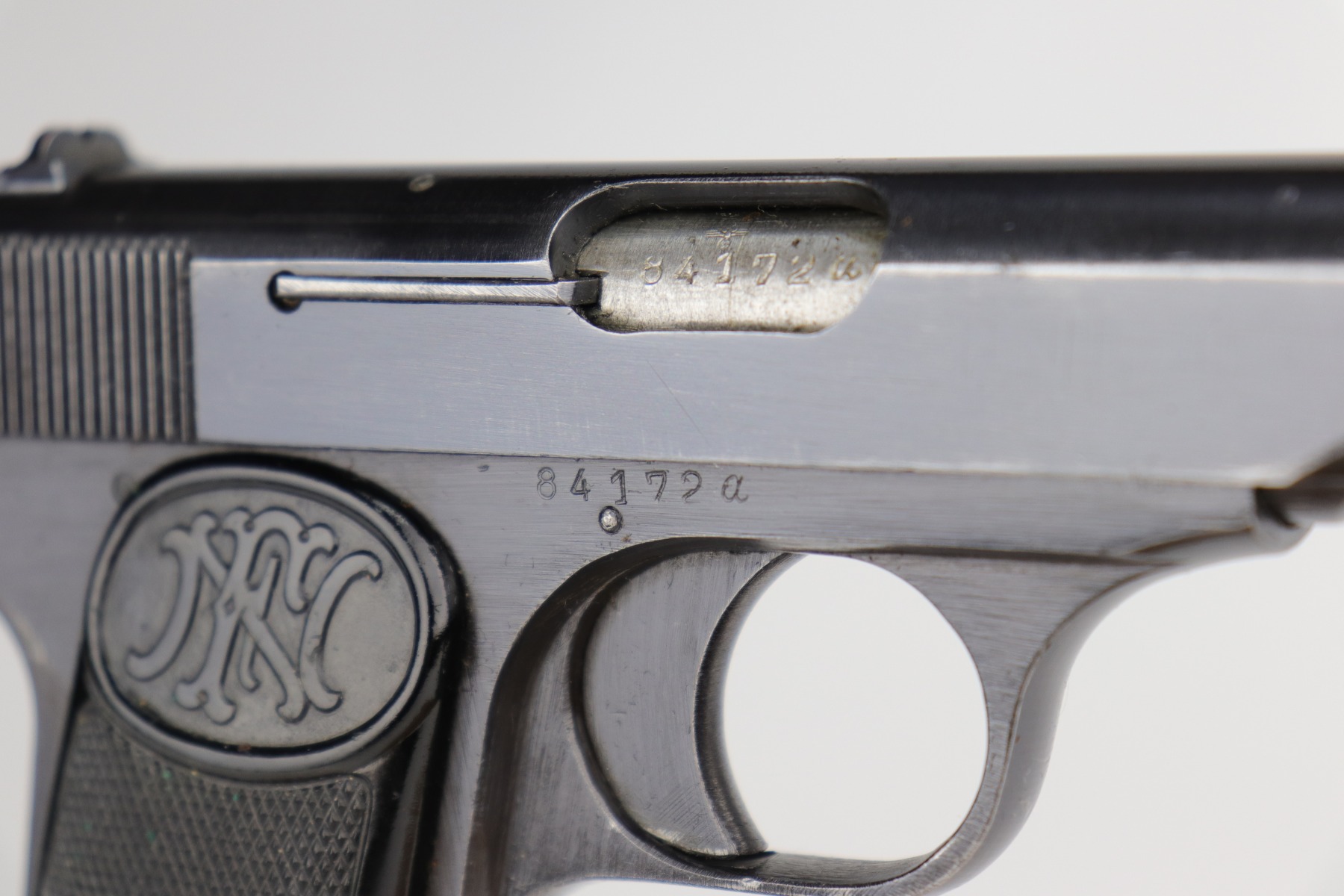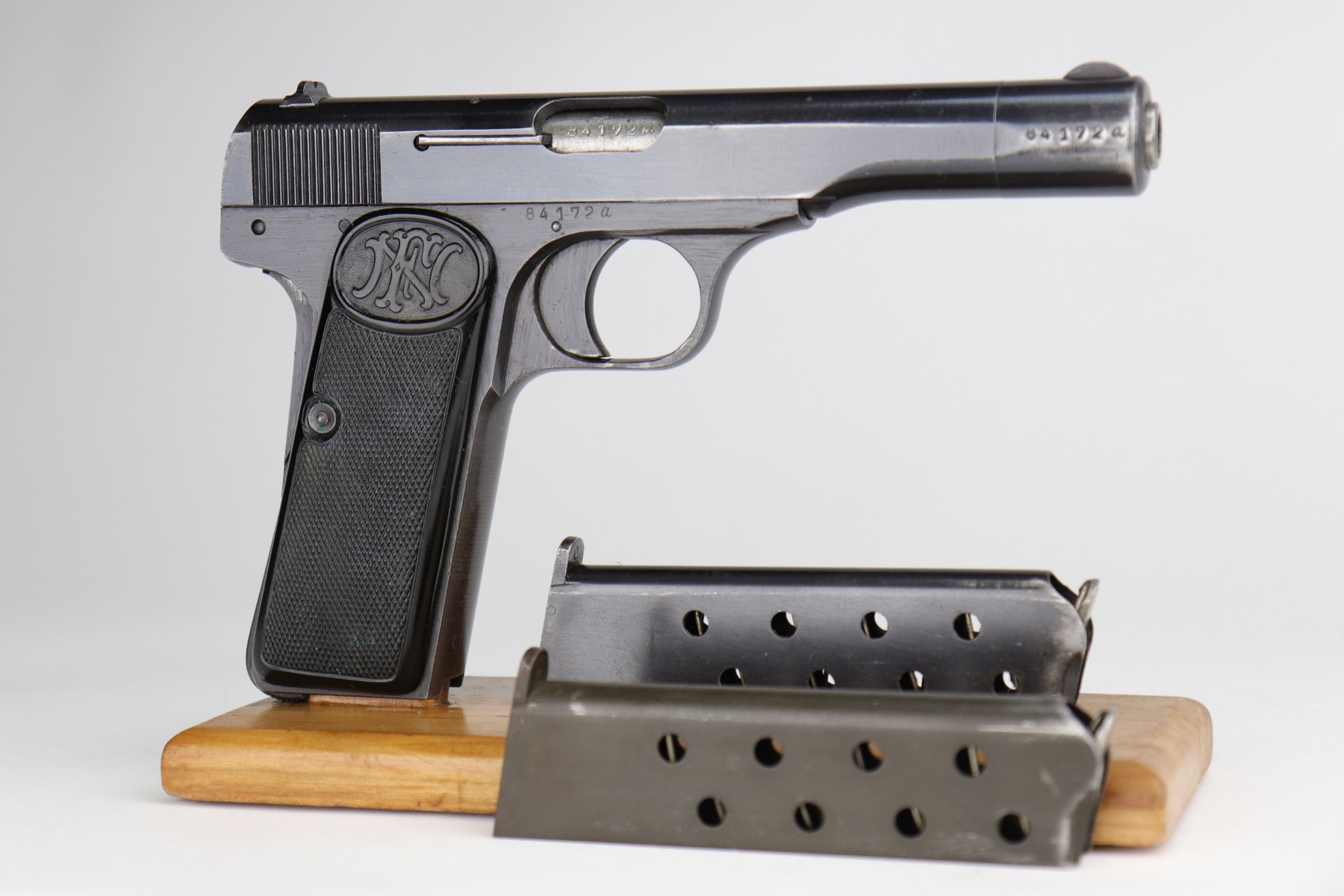 10/8/20 – This is a very nice example of an FN Browning Model 1922 Rig issued to the Nazi military during WW2. It comes with a holster and two magazines. The gun is all matching and has the proper “Waffen 140” Nazi military proofs. It has retained somewhere between 85-90% of its original bluing. There is minor muzzle wear, hint of wear on the high edges of the slide, and very minor thinning on the straps. There a few very minor surface scratches here and there. The bore is minty. Excellent period correct grips. Both magazines are period-correct and one has a phosphate finish. The holster is “HK” marked, and a Nazi insignia has been added to the top flap. There are two holes in the top flap where an accessory has been removed. The ink stamp is still visible on the inside. There are a few stitches missing here and there.