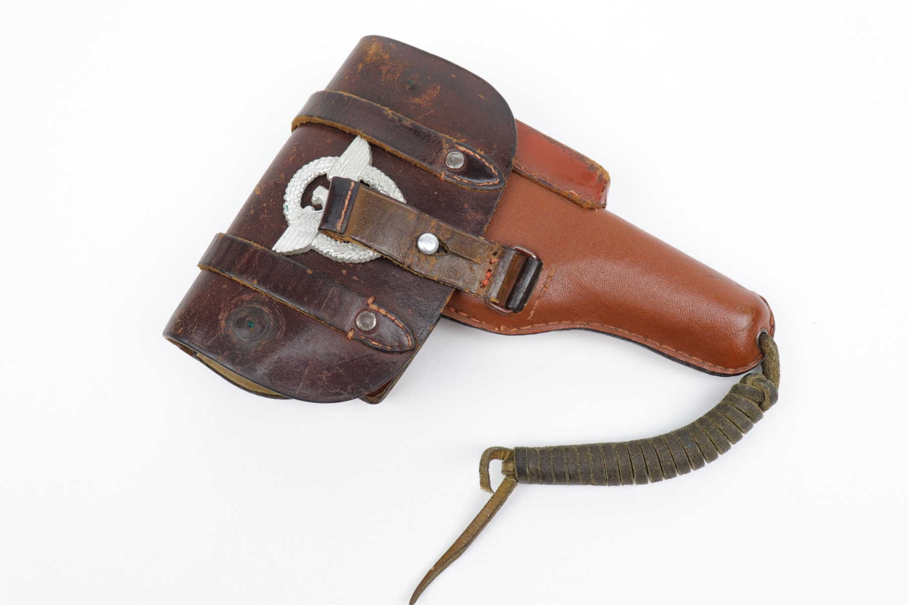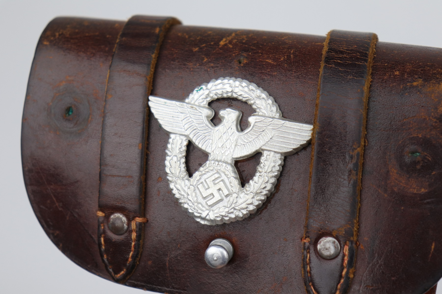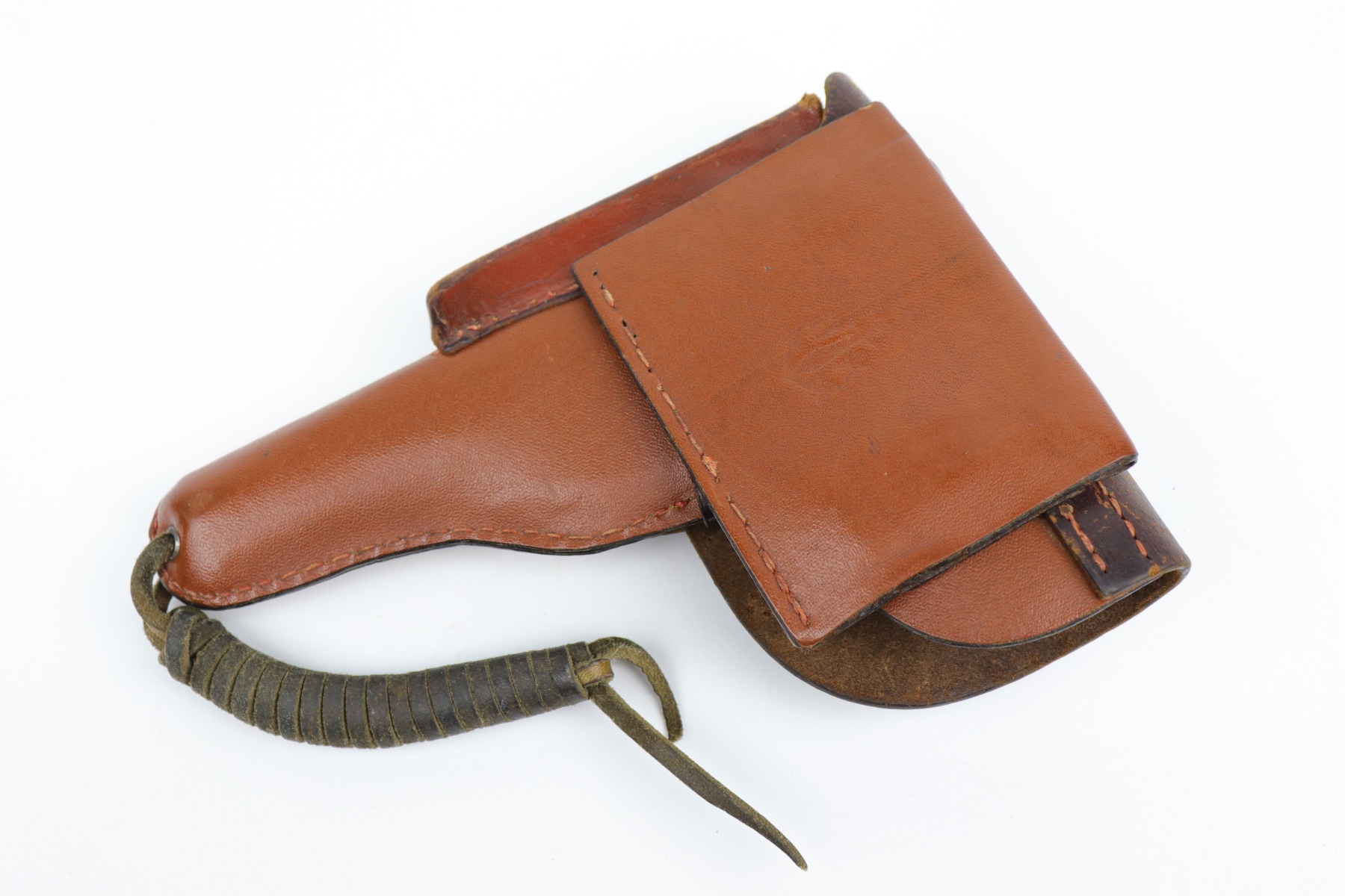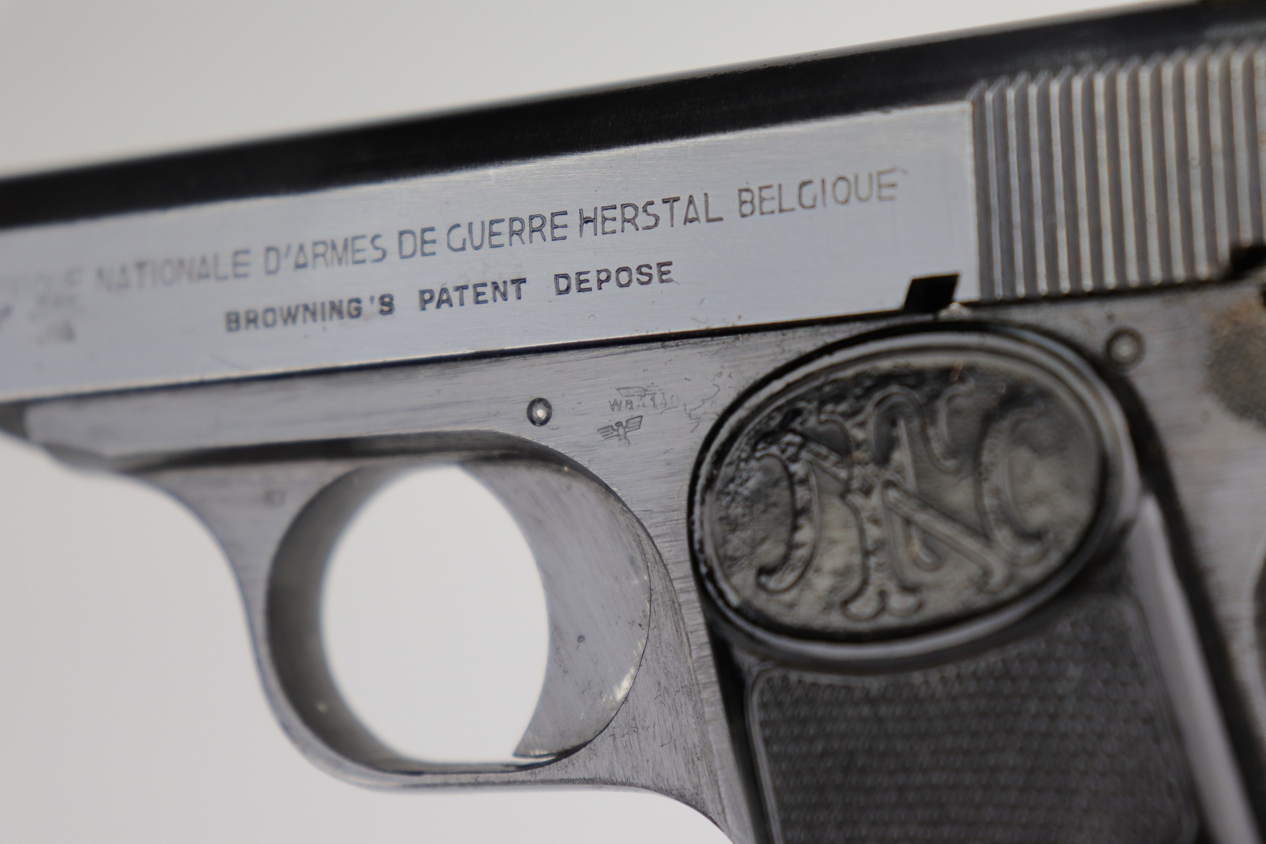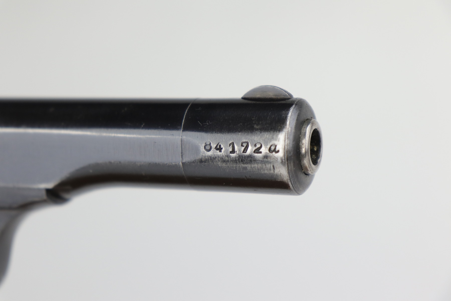 10/8/20 – This is a very nice example of an FN Browning Model 1922 Rig issued to the Nazi military during WW2. It comes with a holster and two magazines. The gun is all matching and has the proper “Waffen 140” Nazi military proofs. It has retained somewhere between 85-90% of its original bluing. There is minor muzzle wear, hint of wear on the high edges of the slide, and very minor thinning on the straps. There a few very minor surface scratches here and there. The bore is minty. Excellent period correct grips. Both magazines are period-correct and one has a phosphate finish. The holster is “HK” marked, and a Nazi insignia has been added to the top flap. There are two holes in the top flap where an accessory has been removed. The ink stamp is still visible on the inside. There are a few stitches missing here and there.