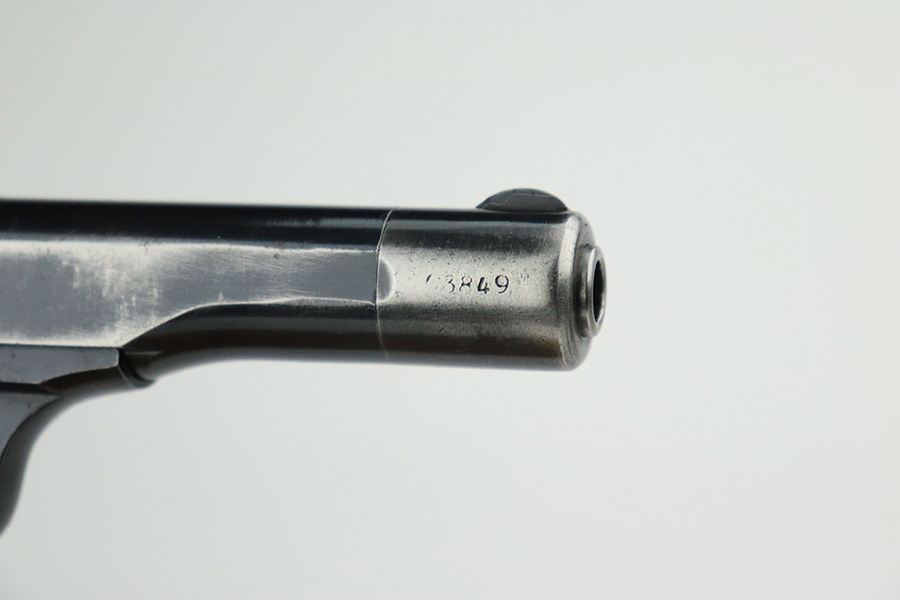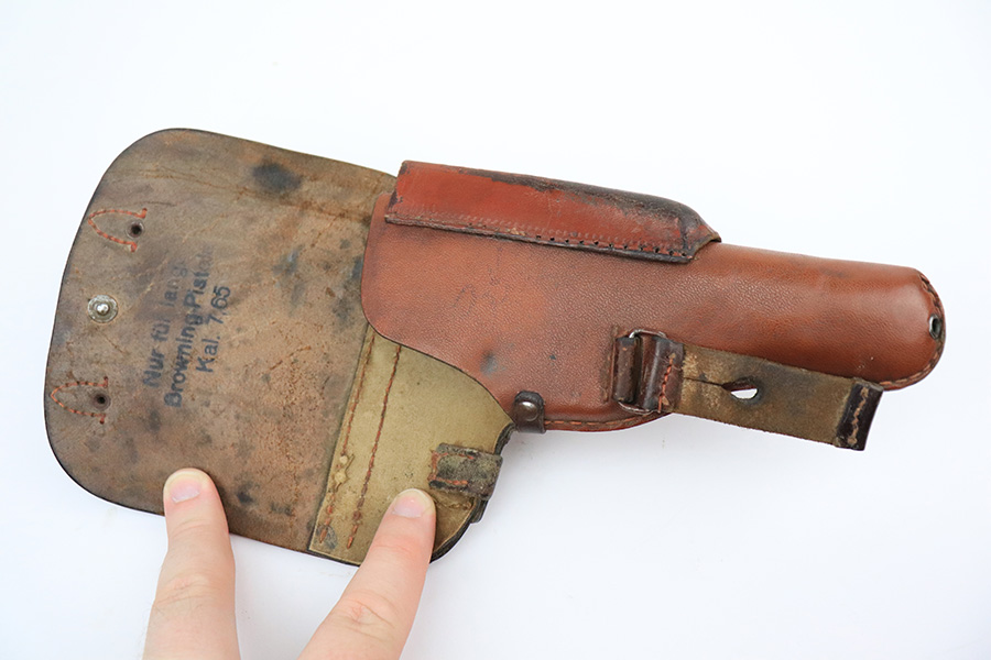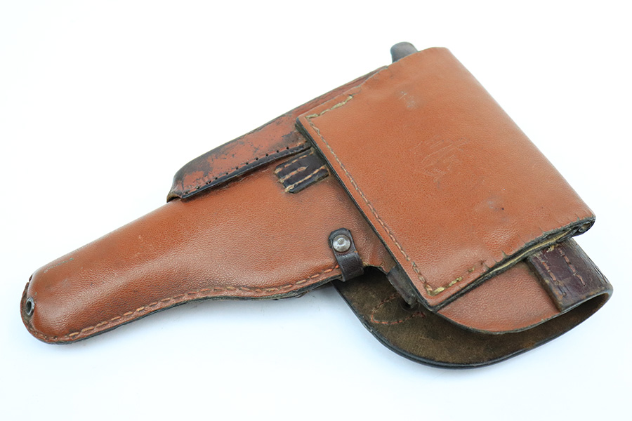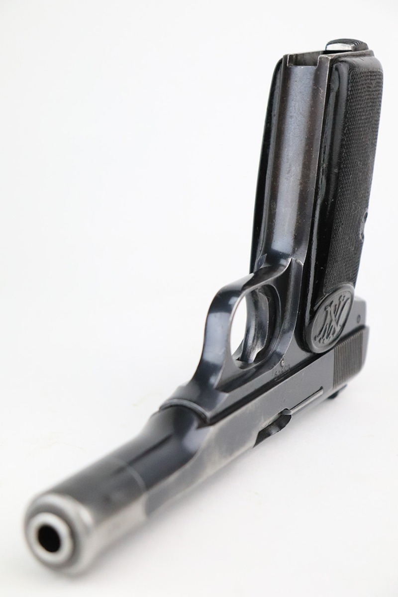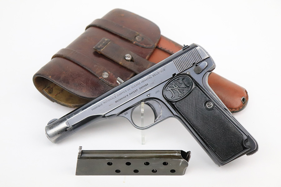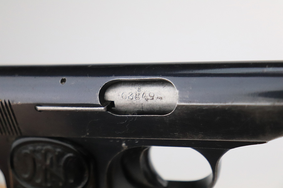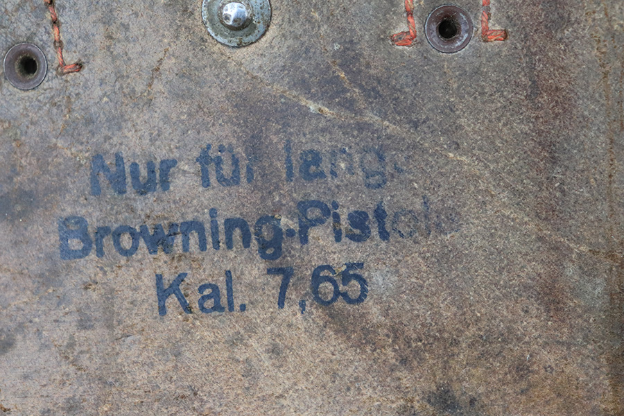 7/14/22 – This is a nice example of an FN Browning Model 1922 issued to the Nazi military during WW2. It is all matching and has the proper “Waffen 140” military acceptance proofs. It comes as a rig with one proper magazine and a period-correct holster (there is some stitching missing from the mag pouch). The gun itself has retained roughly 75% of its original finish. The majority of the wear is around the muzzle and along the slide, concentrated mostly around the high edges. There is also thinning and light freckling on both grip straps, most obvious on the back strap. Excellent black bakelite grips. Great bore with strong rifling.
