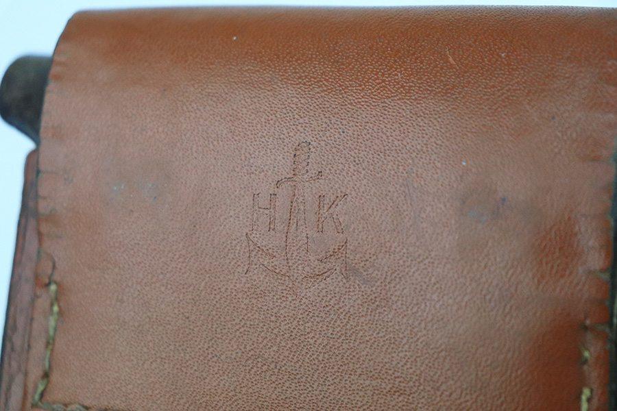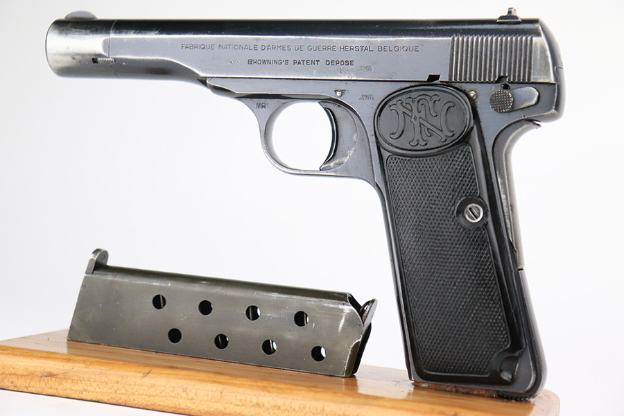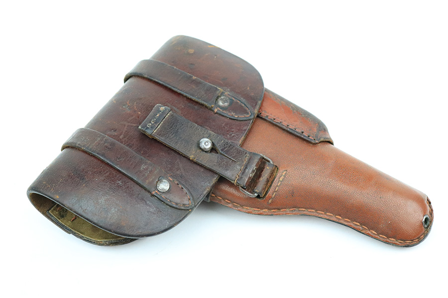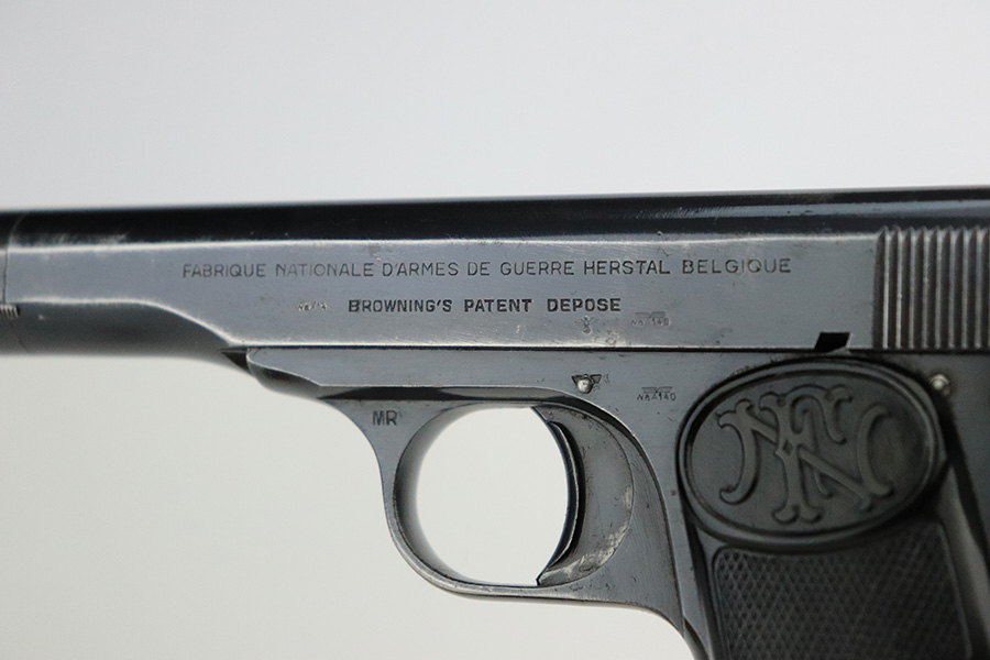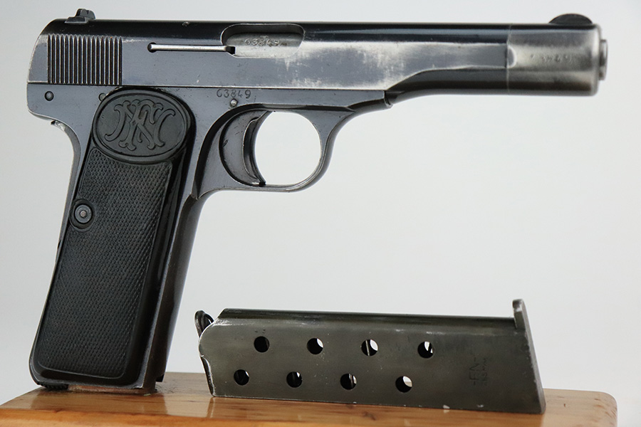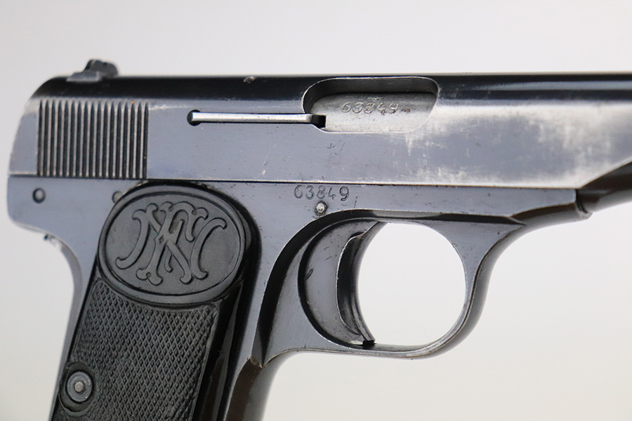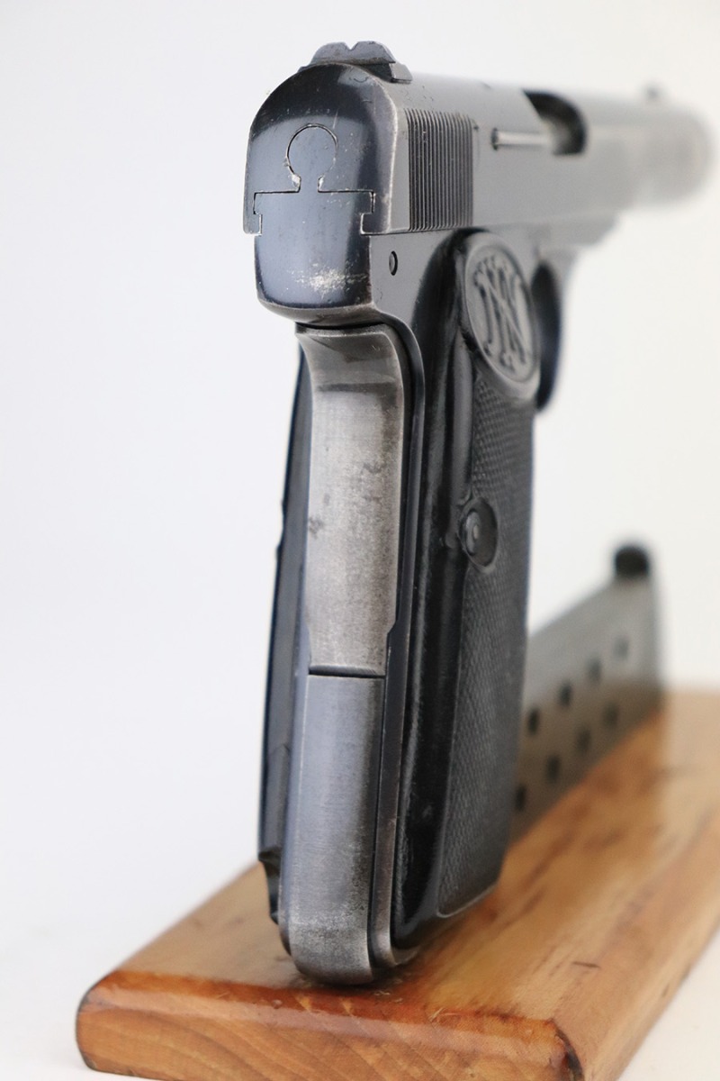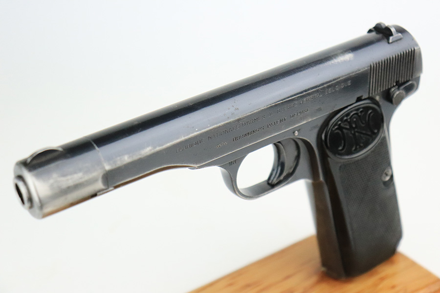 7/14/22 – This is a nice example of an FN Browning Model 1922 issued to the Nazi military during WW2. It is all matching and has the proper “Waffen 140” military acceptance proofs. It comes as a rig with one proper magazine and a period-correct holster (there is some stitching missing from the mag pouch). The gun itself has retained roughly 75% of its original finish. The majority of the wear is around the muzzle and along the slide, concentrated mostly around the high edges. There is also thinning and light freckling on both grip straps, most obvious on the back strap. Excellent black bakelite grips. Great bore with strong rifling.