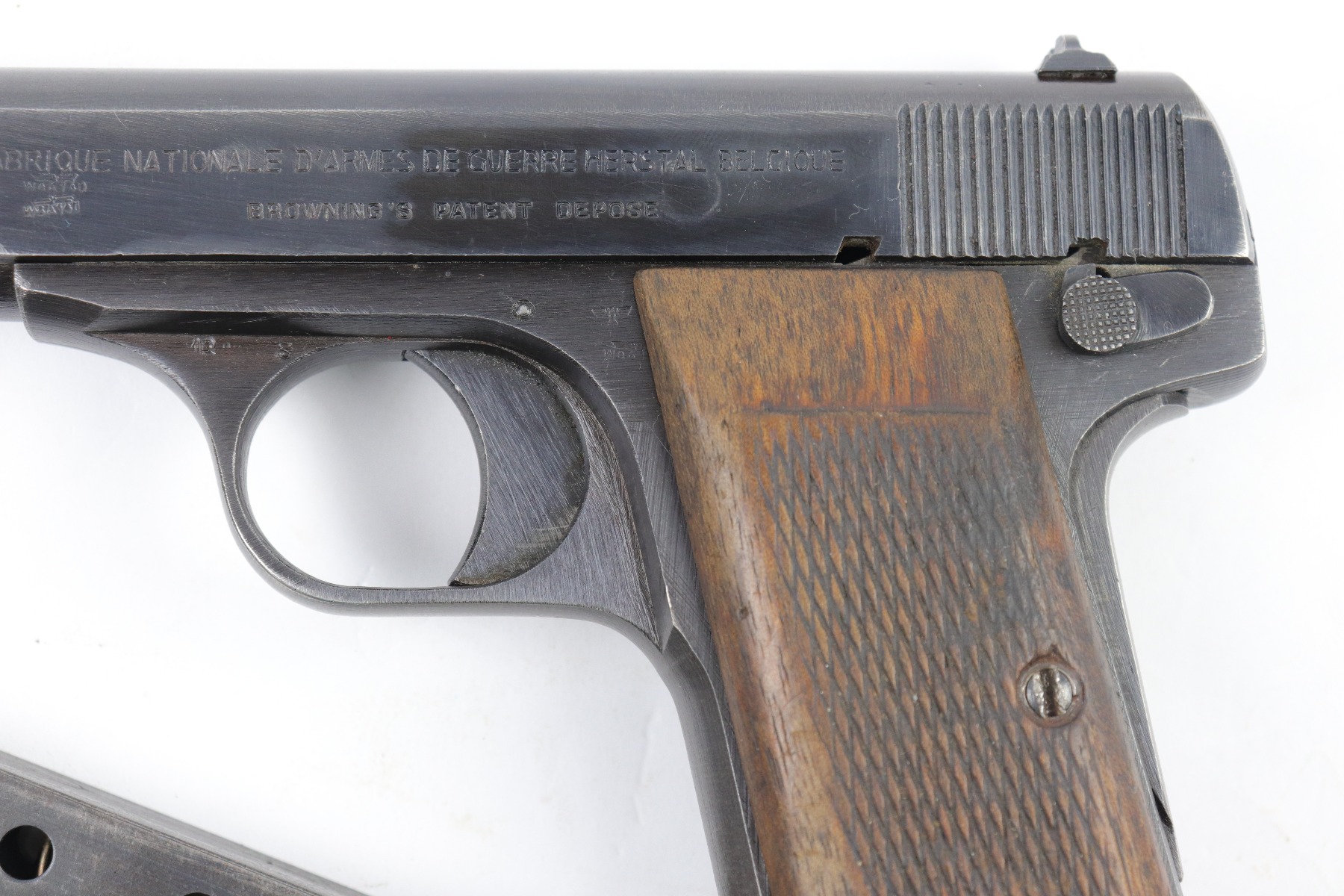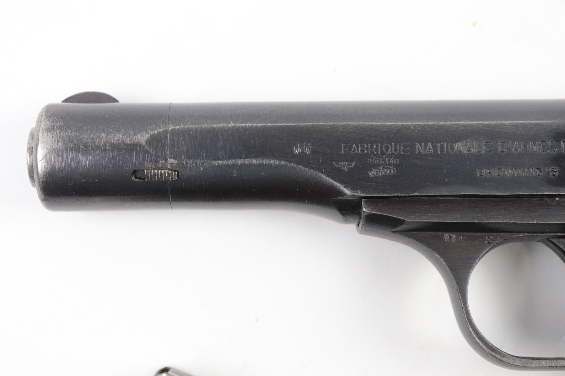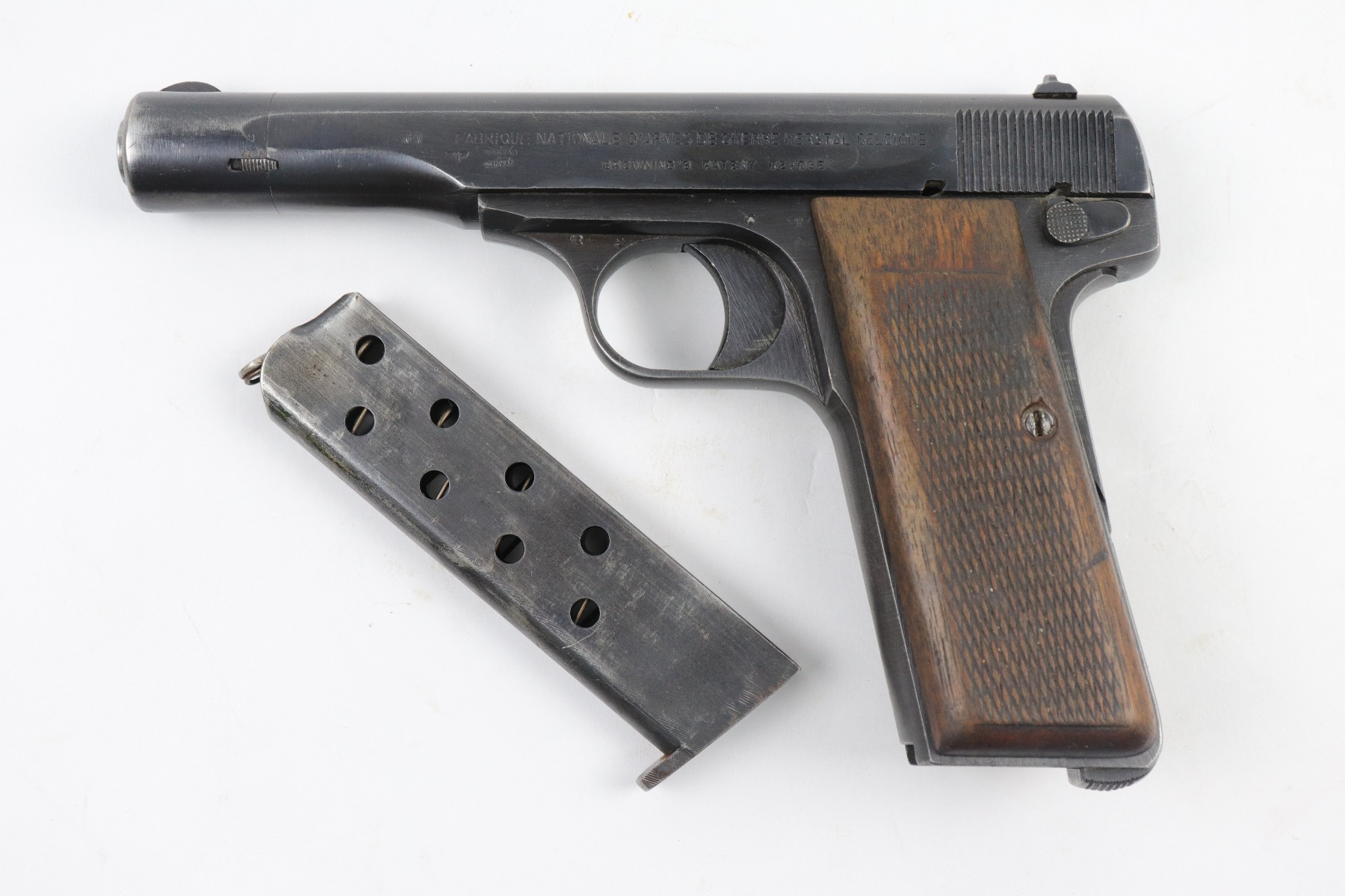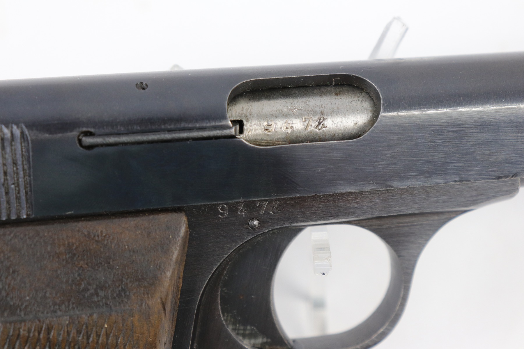 7/9/18 – This is an original FN model 1922 pistol made during Nazi occupation in the 1940s. The pistol is serial number 947b and all matching. The slide and frame is also WaA140 waffen proofed stamped. The front and back straps have the majority of the wear on this pistol, with the bluing thinning and missing in these areas. There is also typical muzzle wear and a small spot on the top of the slide – as shown in photos. Overall we rate at about 90% original condition is in tact. The bore is in great shape with strong rifling, but there is a hint of patina within the grooves. Overall a nice wartime production example. Guaranteed all original with original grips and period correct magazine.