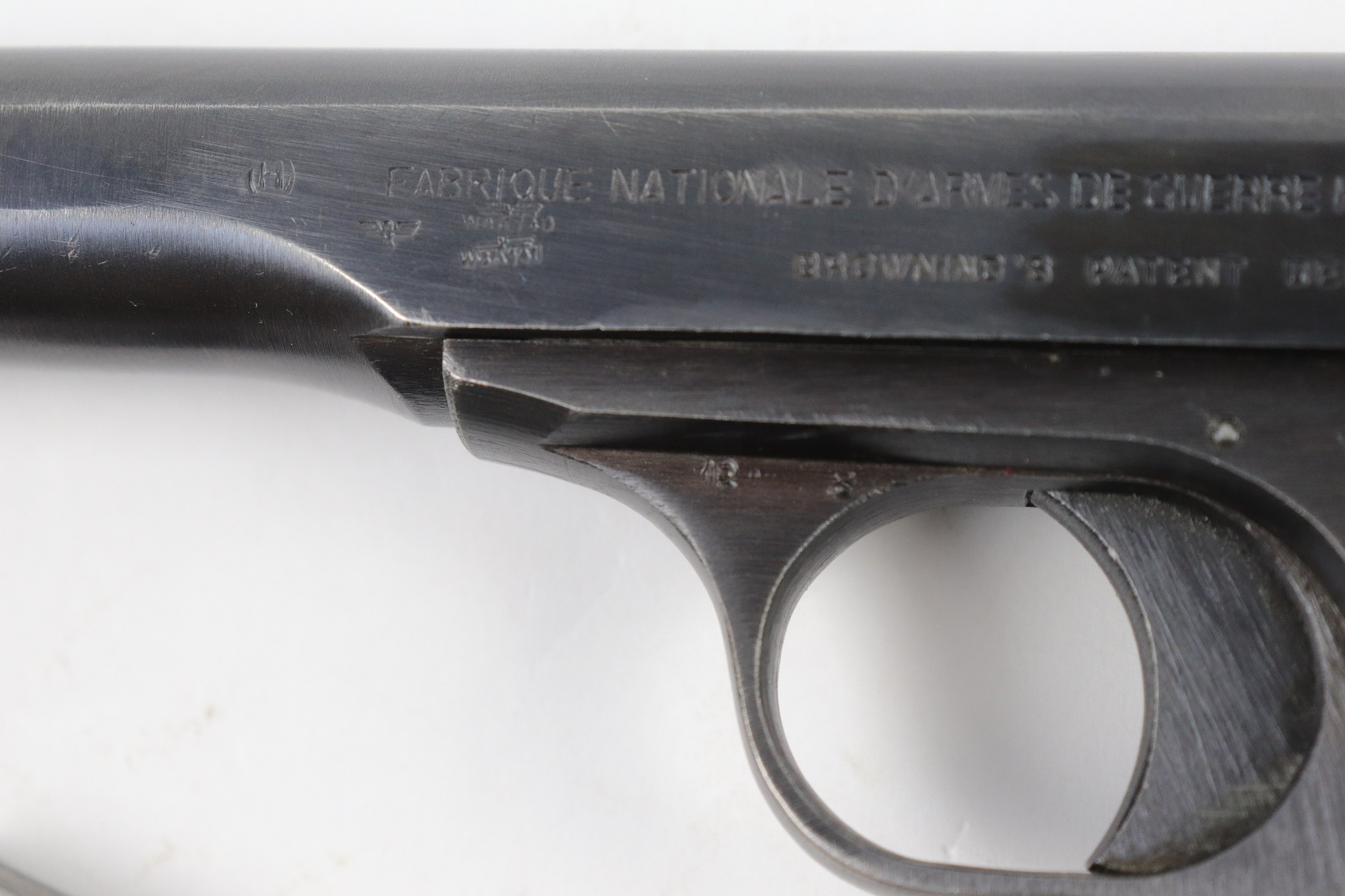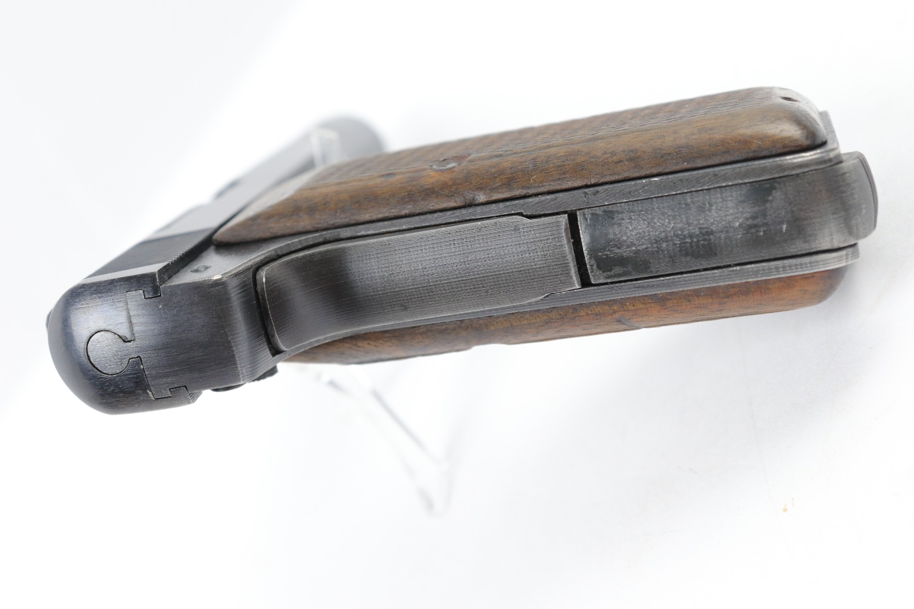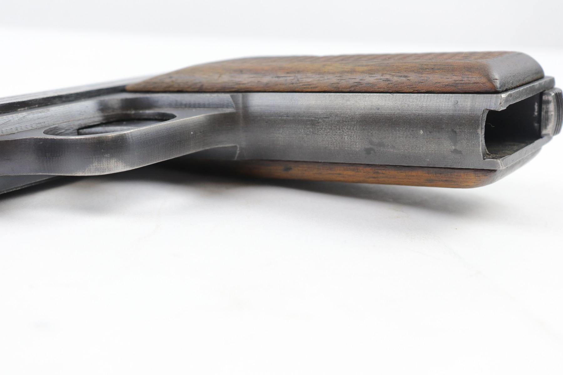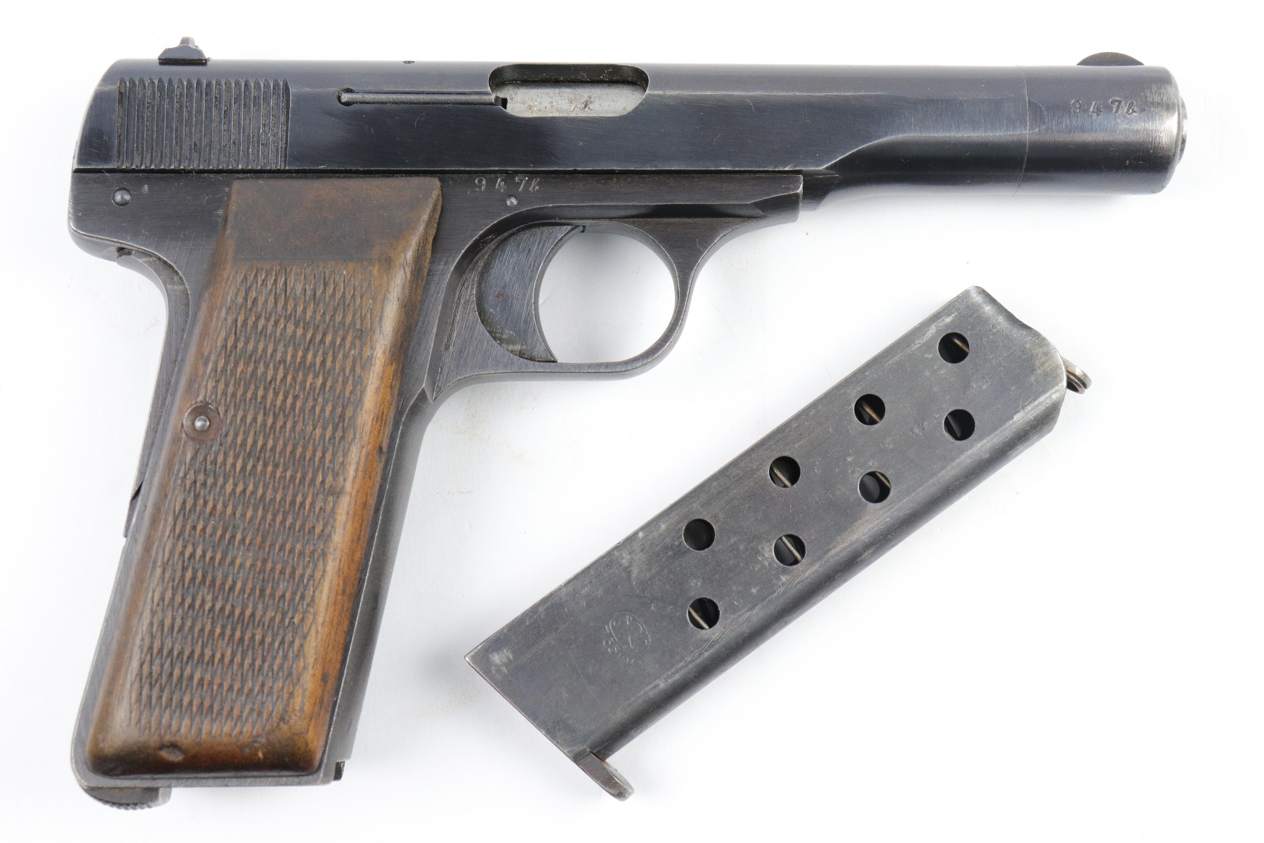 7/9/18 – This is an original FN model 1922 pistol made during Nazi occupation in the 1940s. The pistol is serial number 947b and all matching. The slide and frame is also WaA140 waffen proofed stamped. The front and back straps have the majority of the wear on this pistol, with the bluing thinning and missing in these areas. There is also typical muzzle wear and a small spot on the top of the slide – as shown in photos. Overall we rate at about 90% original condition is in tact. The bore is in great shape with strong rifling, but there is a hint of patina within the grooves. Overall a nice wartime production example. Guaranteed all original with original grips and period correct magazine.