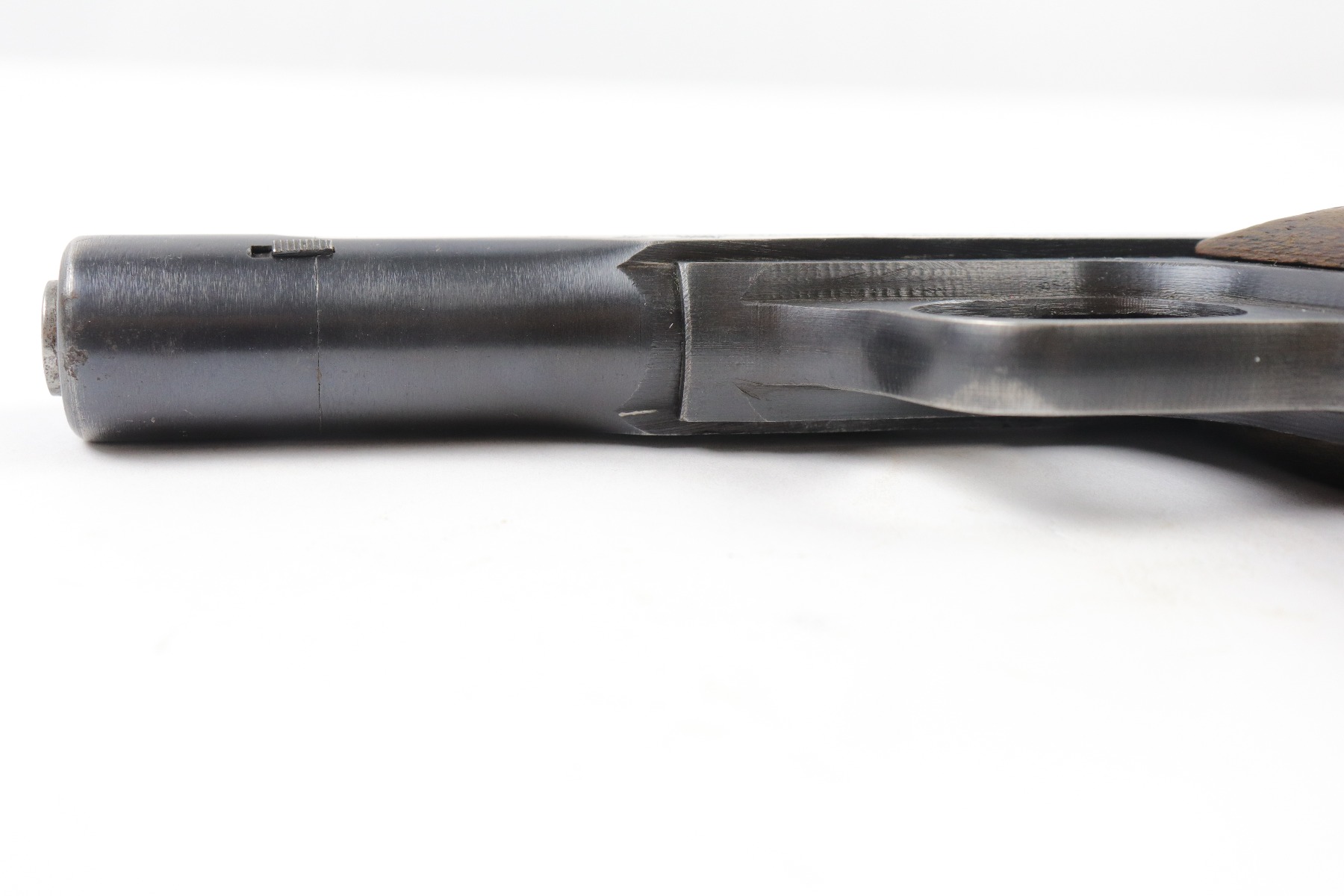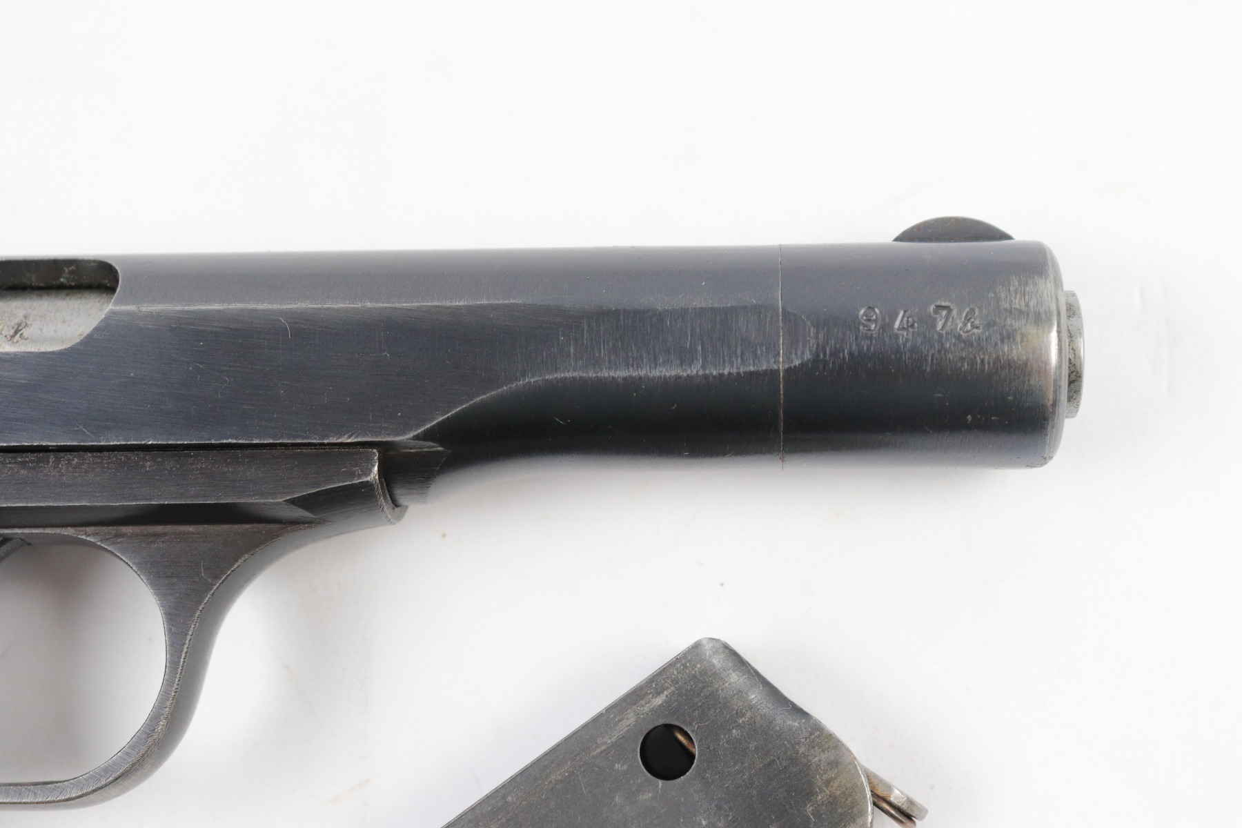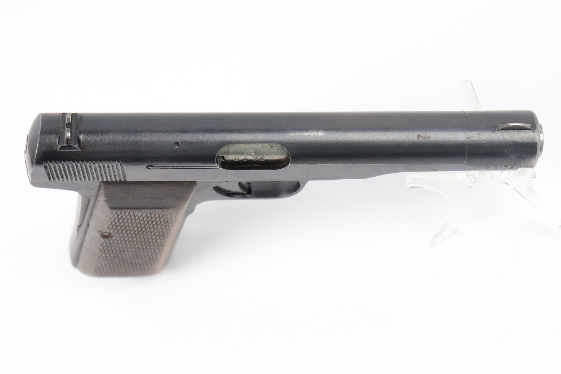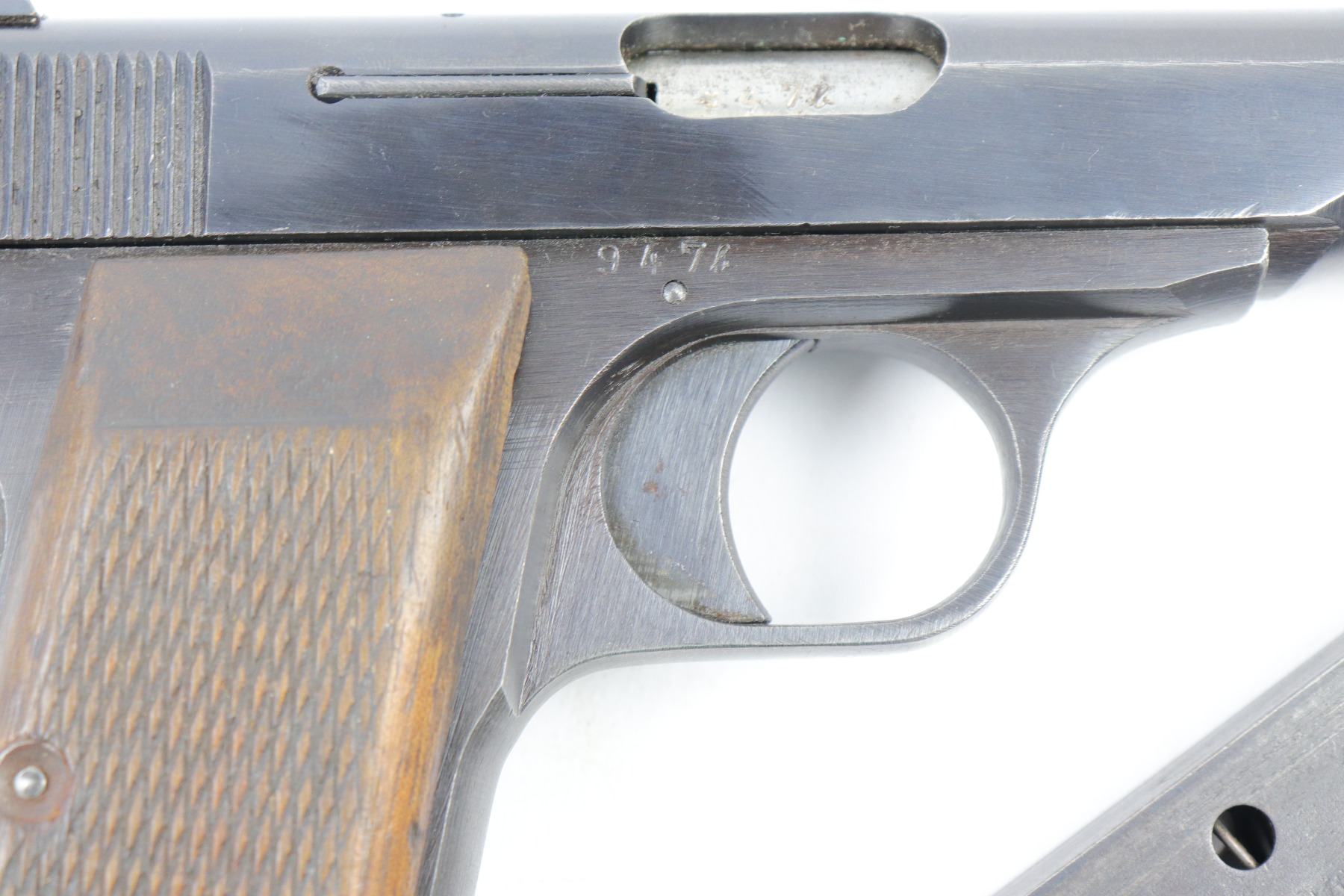 7/9/18 – This is an original FN model 1922 pistol made during Nazi occupation in the 1940s. The pistol is serial number 947b and all matching. The slide and frame is also WaA140 waffen proofed stamped. The front and back straps have the majority of the wear on this pistol, with the bluing thinning and missing in these areas. There is also typical muzzle wear and a small spot on the top of the slide – as shown in photos. Overall we rate at about 90% original condition is in tact. The bore is in great shape with strong rifling, but there is a hint of patina within the grooves. Overall a nice wartime production example. Guaranteed all original with original grips and period correct magazine.