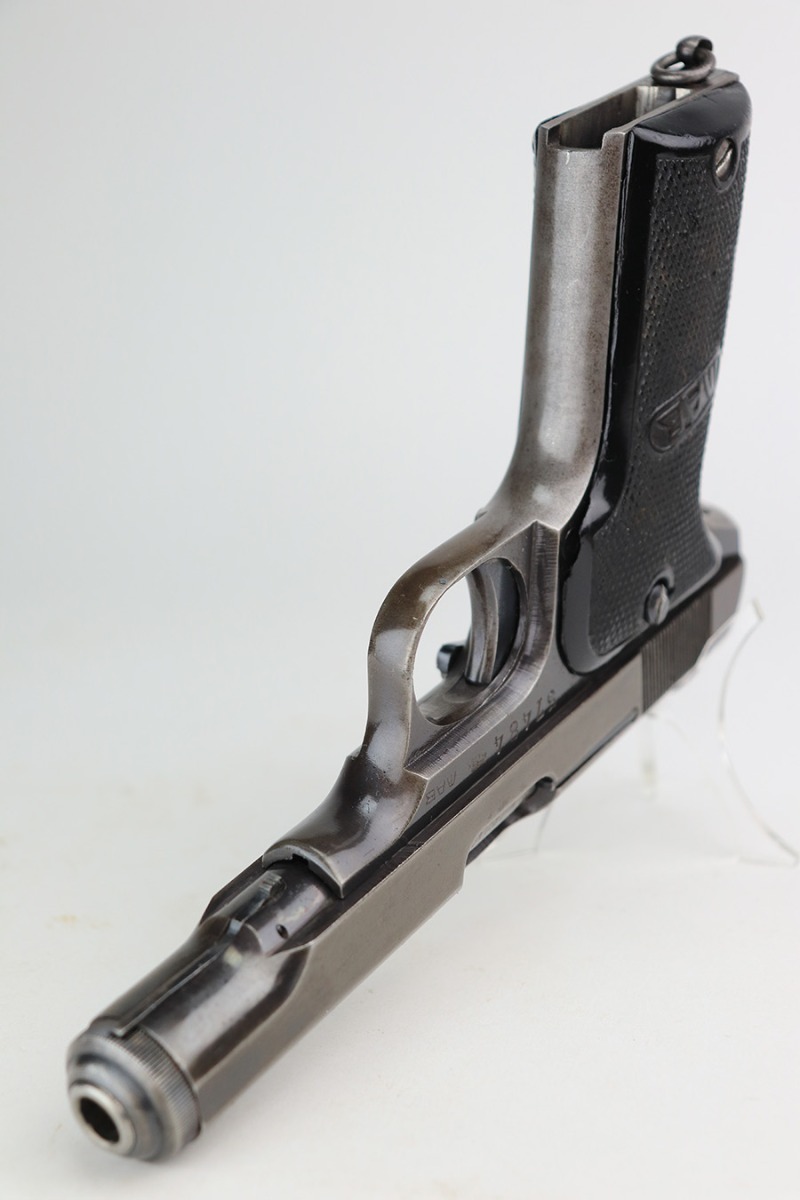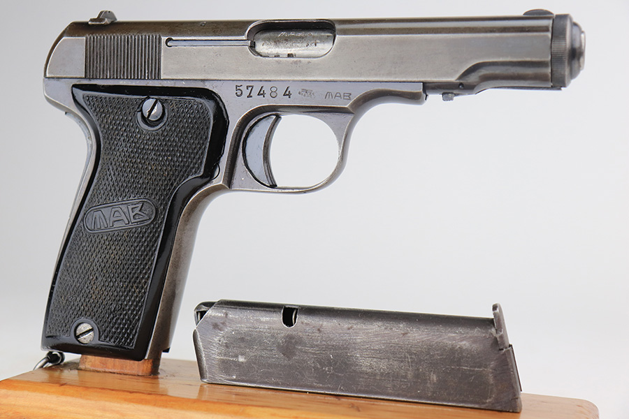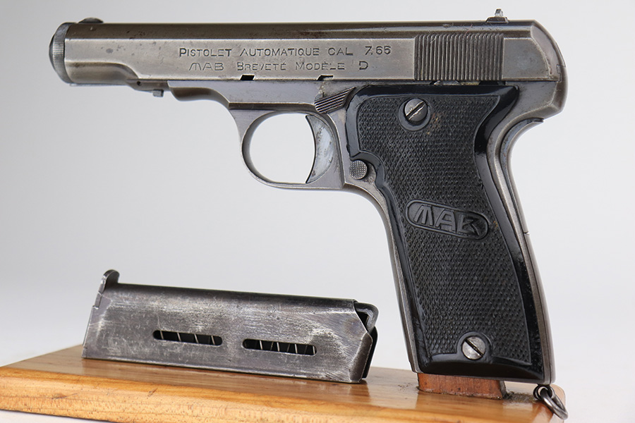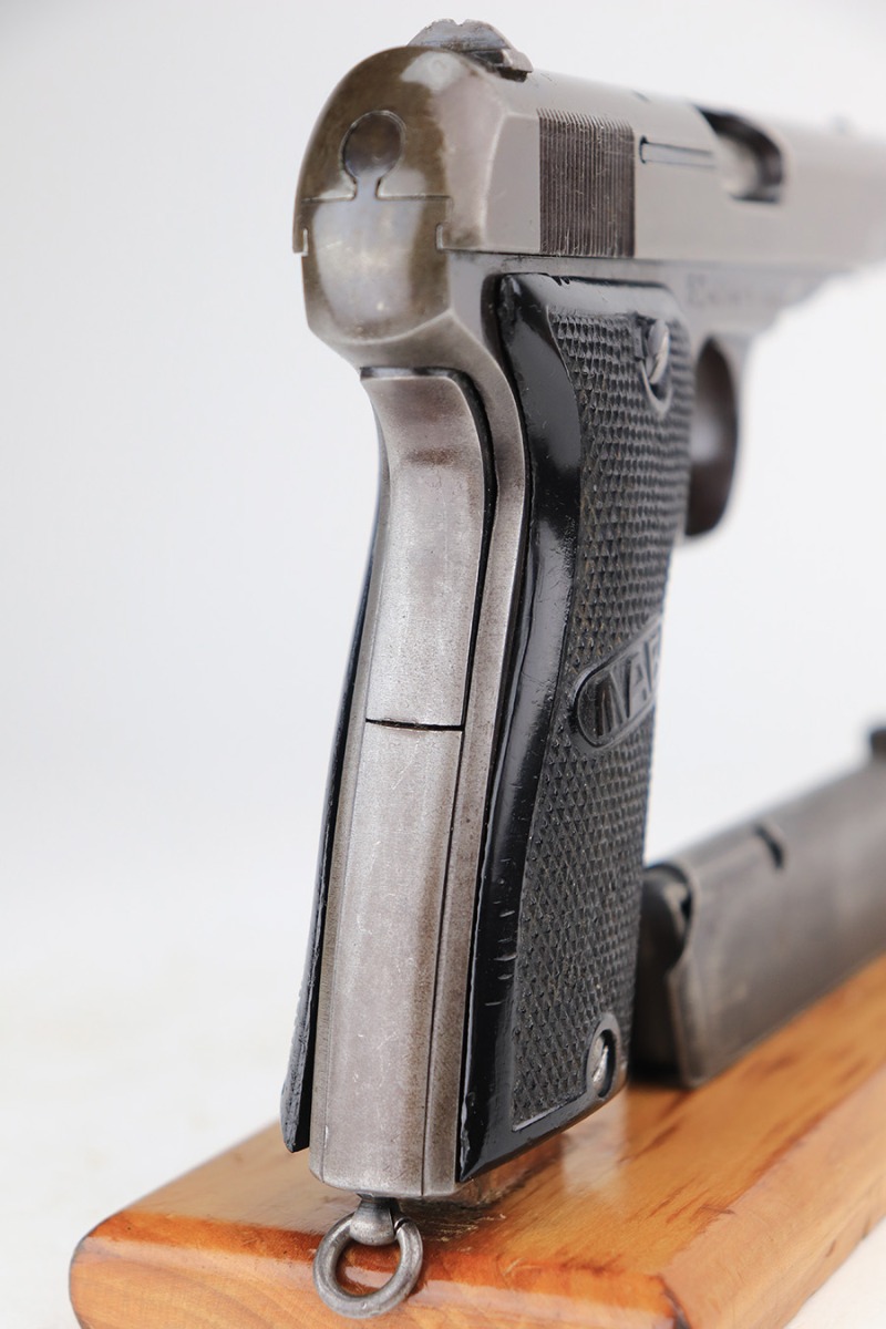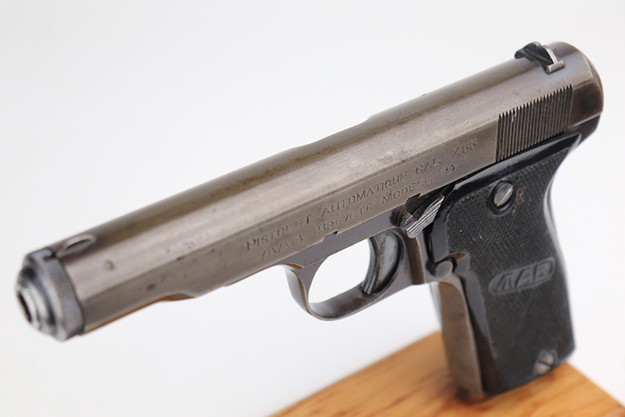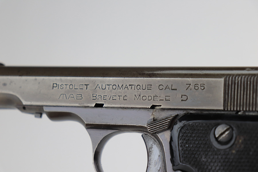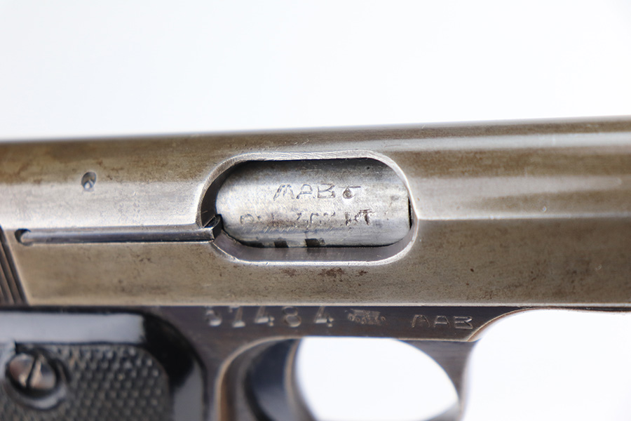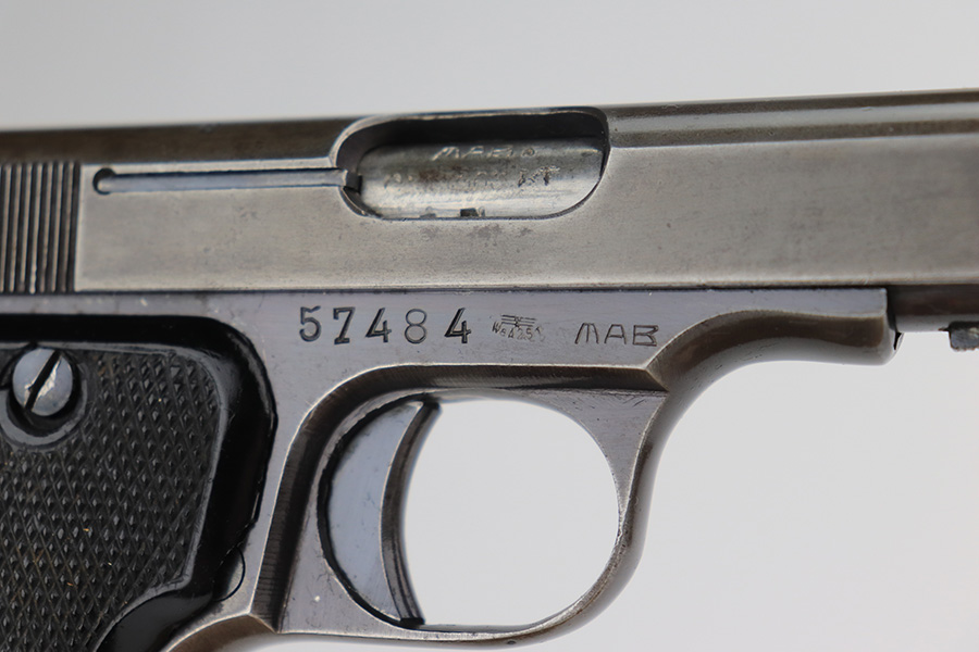 3/25/22 – This is a nice example of a French MAB Model D made under Nazi occupation and issued to the Nazi military during WW2. The gun is all matching, has the proper “Waffen 251” military acceptance proof on the right side of the slide, and has a Nazi Eagle test proof on the barrel. The gun has only retained about 10% of its original finish. There is significant finish loss throughout, and the only remaining bluing is mainly on the sides of the frame. There are also tiny dots of oxidation throughout. There is a tiny dent in the slide, just behind the front sight. Comes with period-correct black bakelite grips – there is noticeable warping in both grips, so the screws don’t line up perfectly. They do, however, keep the grips secured down. On the right panel, there are a couple of small chips along the edge and a crack around the top screw. The bore is shiny with good rifling, but there is a noticeable bulge in the barrel about halfway down. Original lanyard ring is intact.