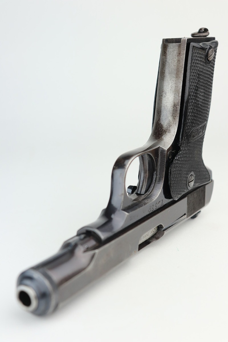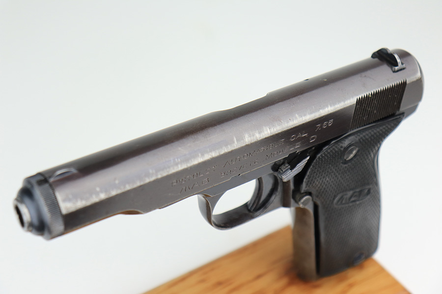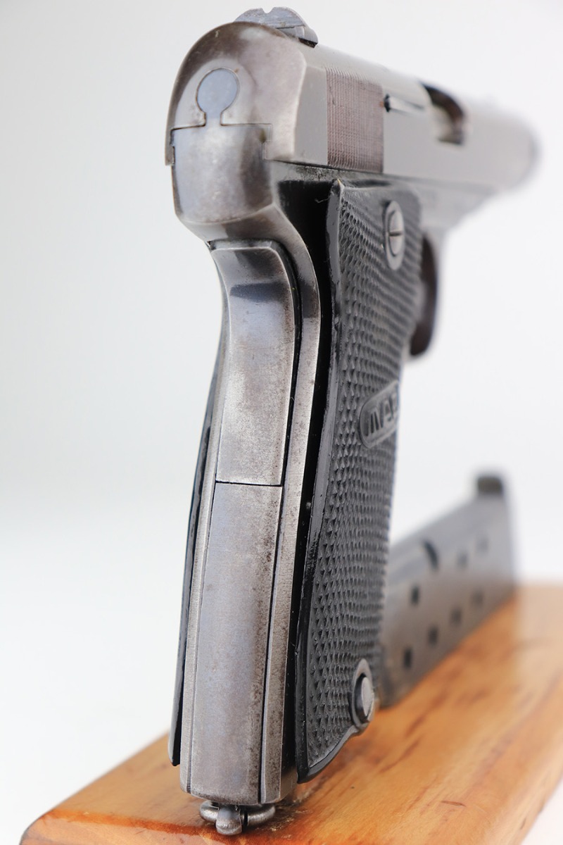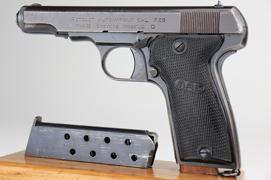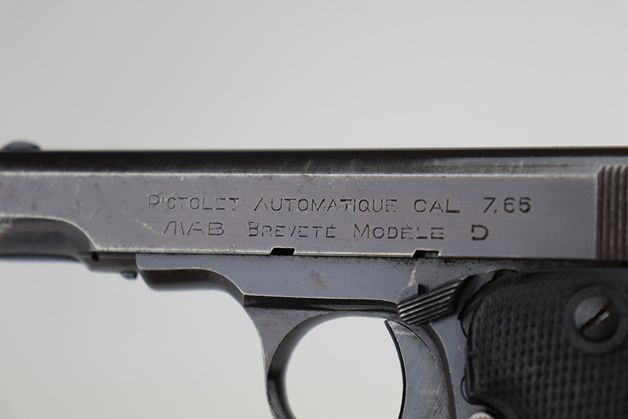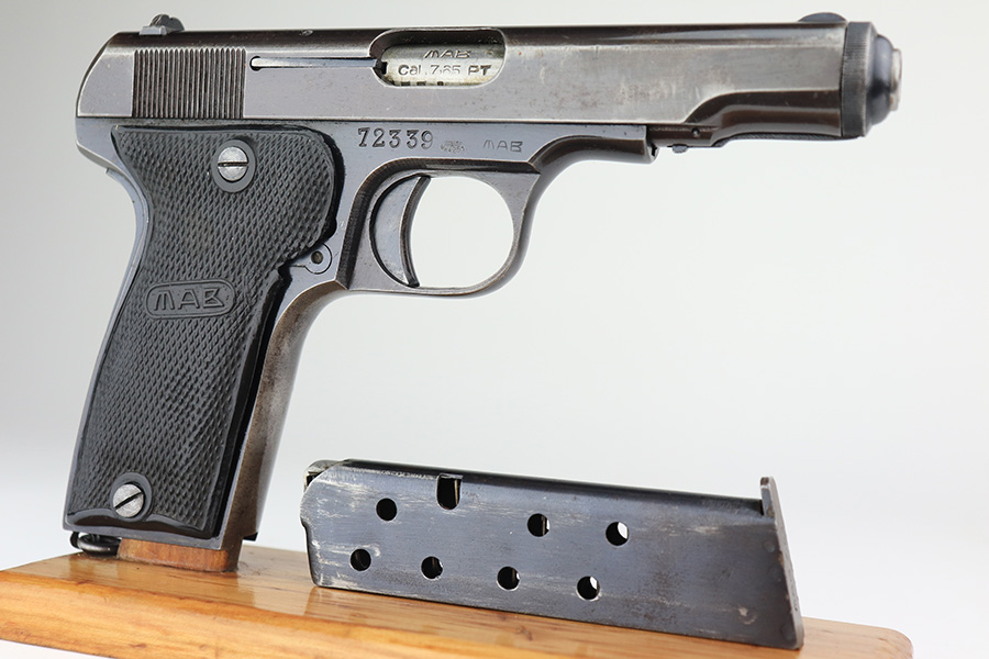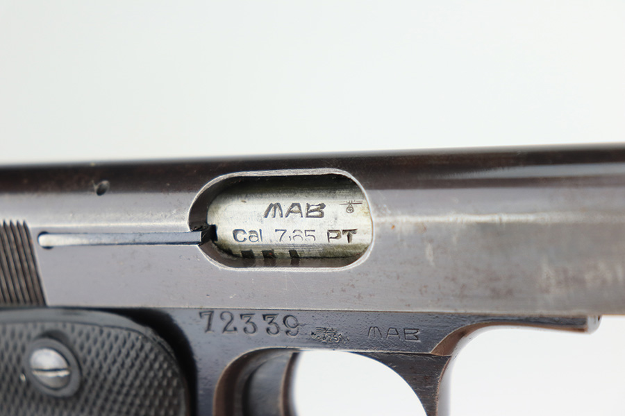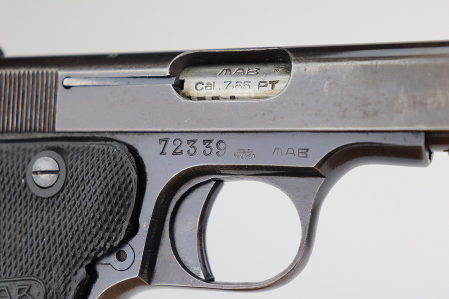 5/6/22 – This is a nice example of a French MAB Model D issued to the Nazi military during WW2. The gun is all matching and has the proper “Waffen 251” Nazi military acceptance proof on the right side of the frame. The majority of the finish loss is on the grip straps, where there is also spotty oxidation. There is spotty, somewhat scratchy wear on both sides of the slide. Comes with a proper magazine and period-correct black bakelite grips – there is noticeable warping throughout and a small chip in the right panel. Minty bore.
