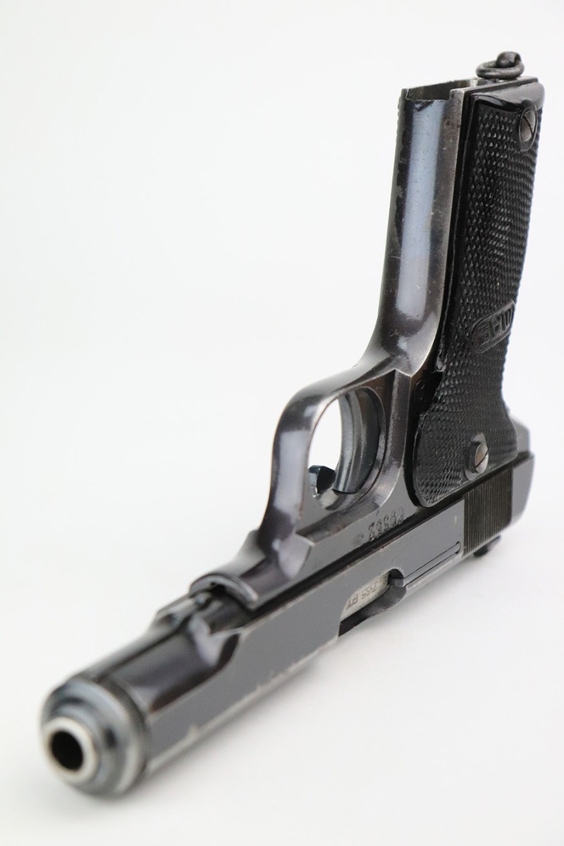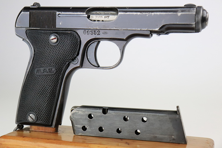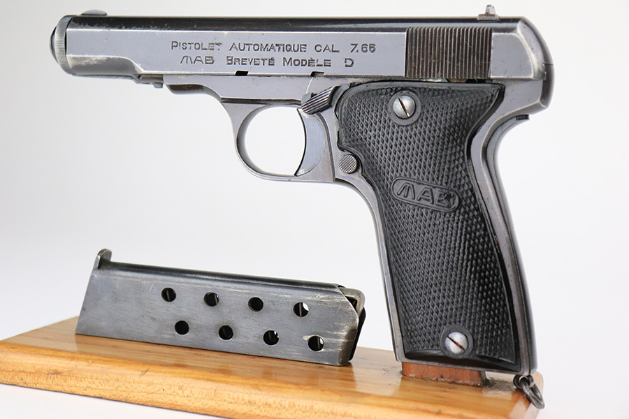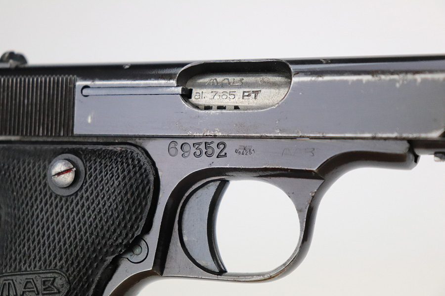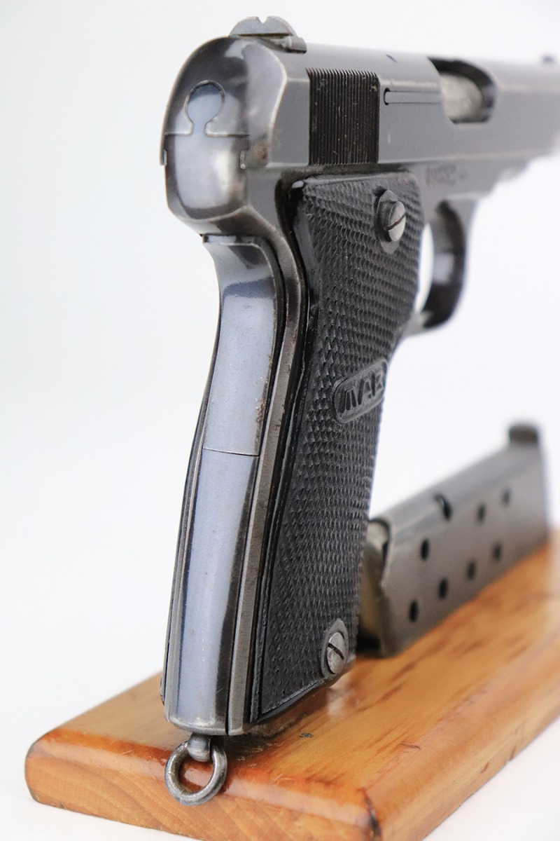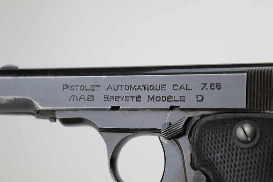 7/13/22 – This is a very nice example of a French MAB Model D issued to the Nazi military during WW2. It is all matching and has the proper “Waffen 251” military acceptance proof on the right side of the frame. It has retained somewhere between 85 and 90% of its original bluing. There is some minor spotty wear and light freckling concentrated mostly around the high edges of the slide. Light wear on the back strap and some splotchy discoloration on the front strap. Comes with period-correct grips one proper magazine. There is minor warping in the grips, especially around the edges. Excellent bore with strong rifling.