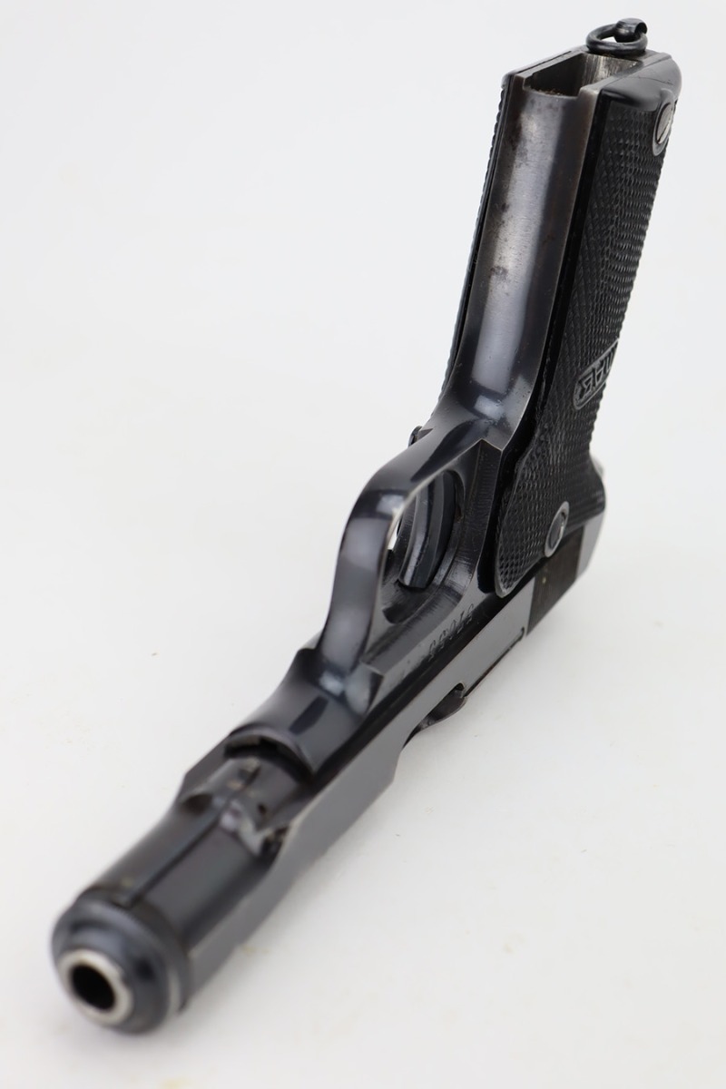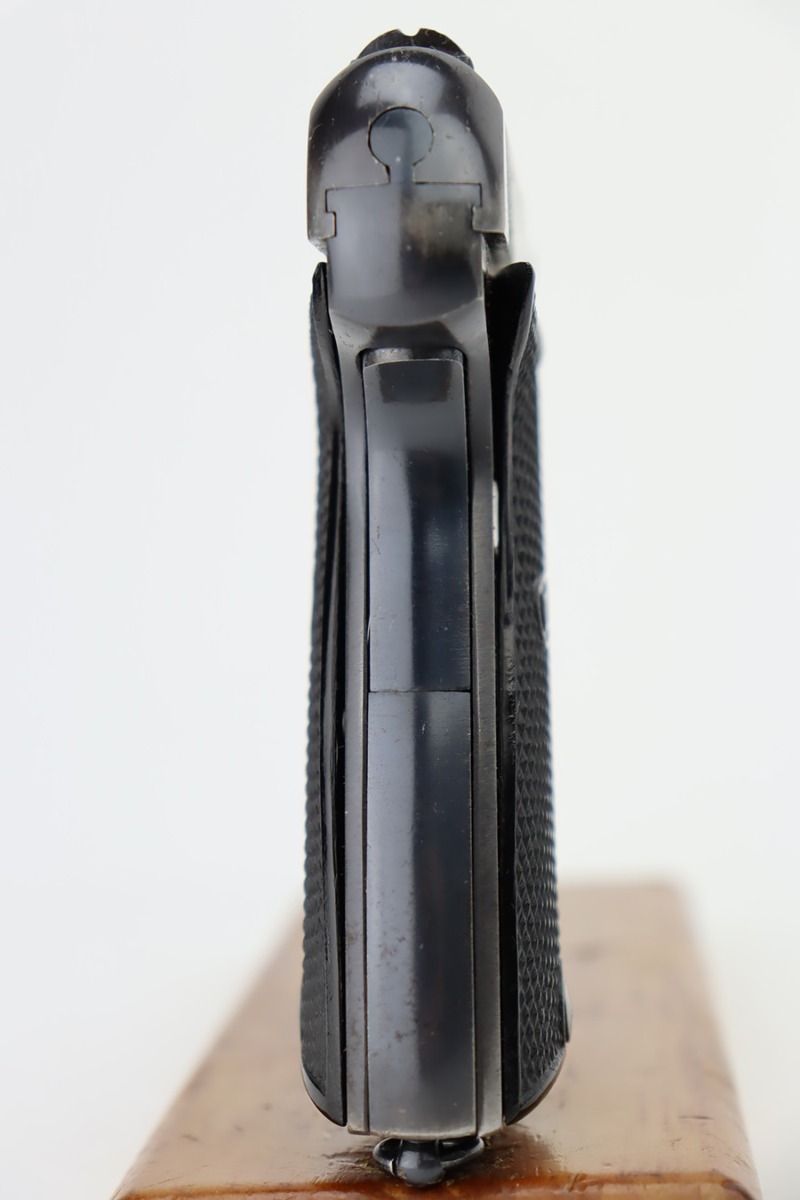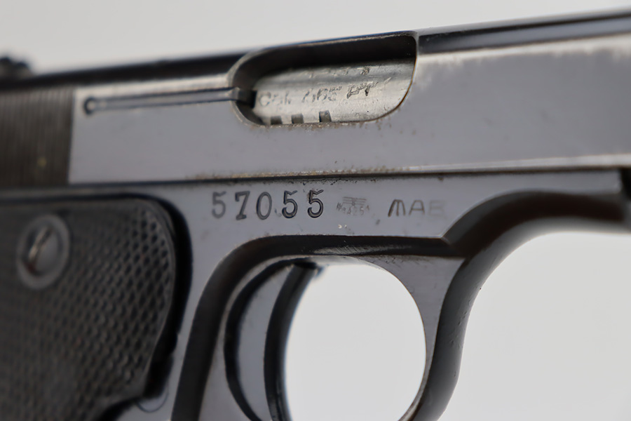 11/1/23 – This is a very nice example of a French MAB Model D issued to the Nazi military during WW2. All matching with the proper “Waffen 251” military acceptance proof on the right side of the frame. It has retained about 90-92% of its original finish. There is minor wear around the muzzle and wear along both sides of the slide, concentrated mostly around the high edges. Some minor thinning and a few spots of oxidation on the front strap. Fitted with excellent period-correct black bakelite grips and comes with one proper magazine. Lanyard ring is intact. Mint bore.