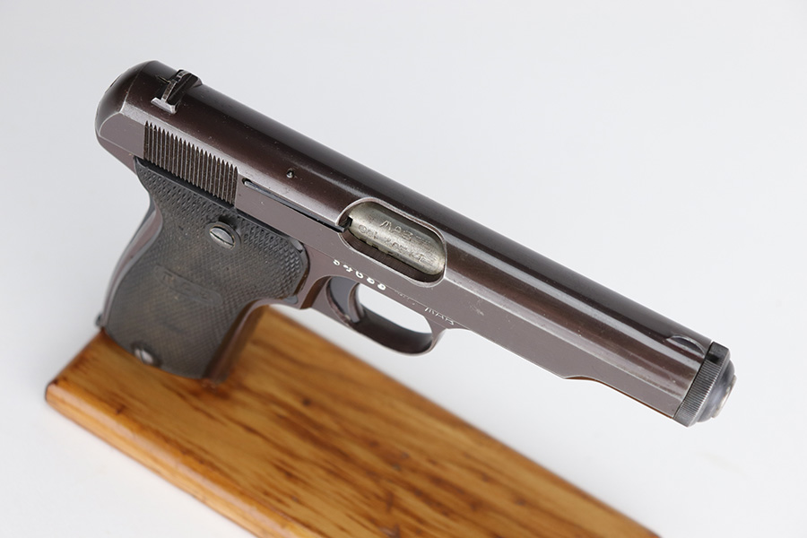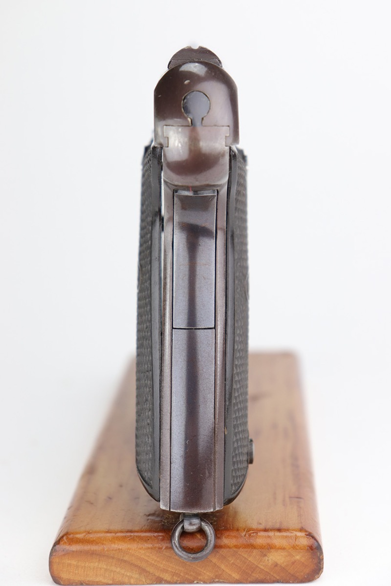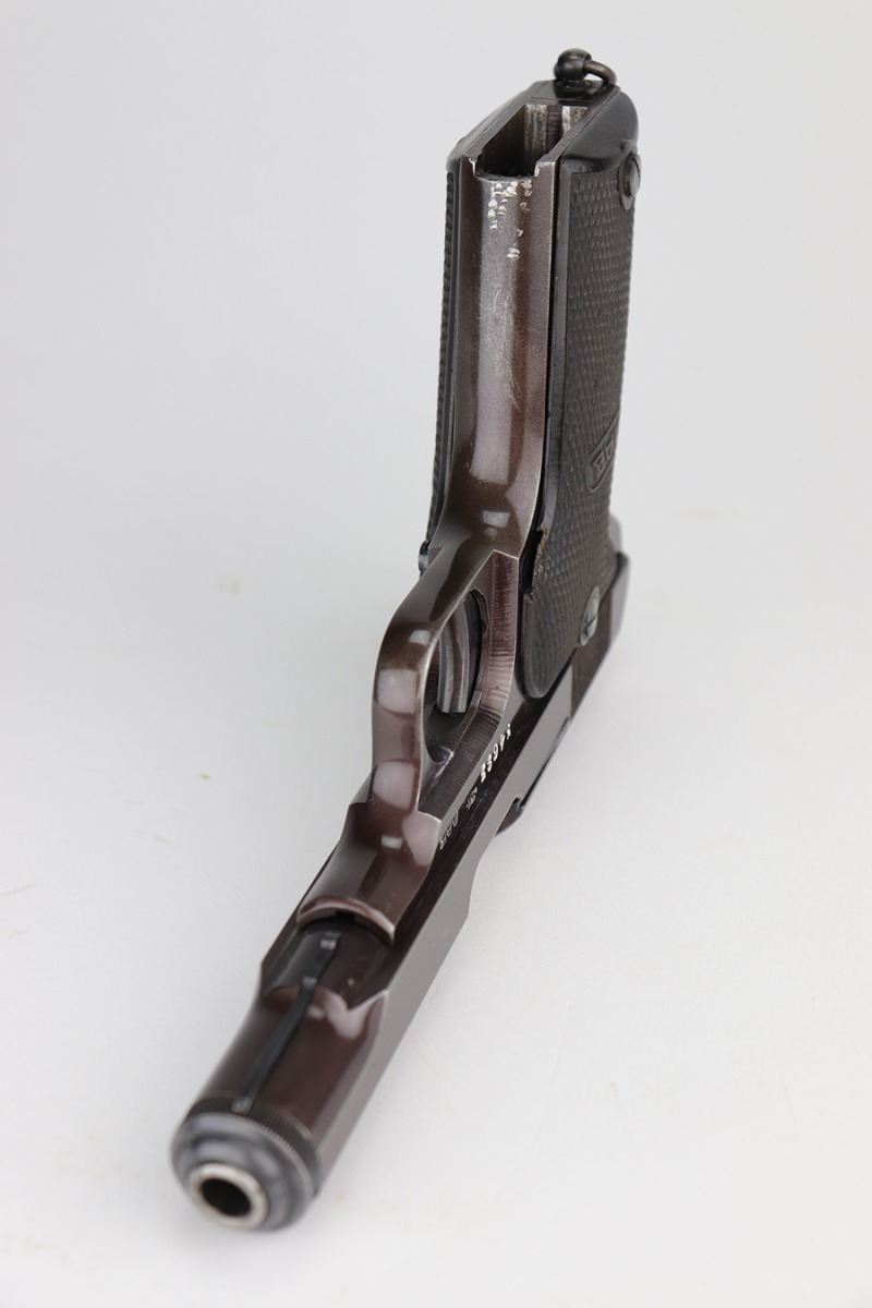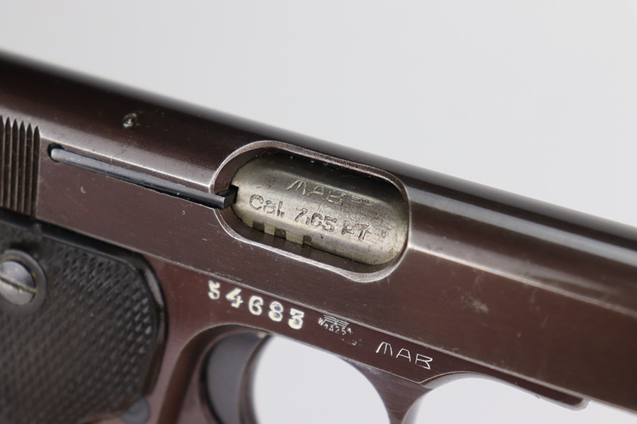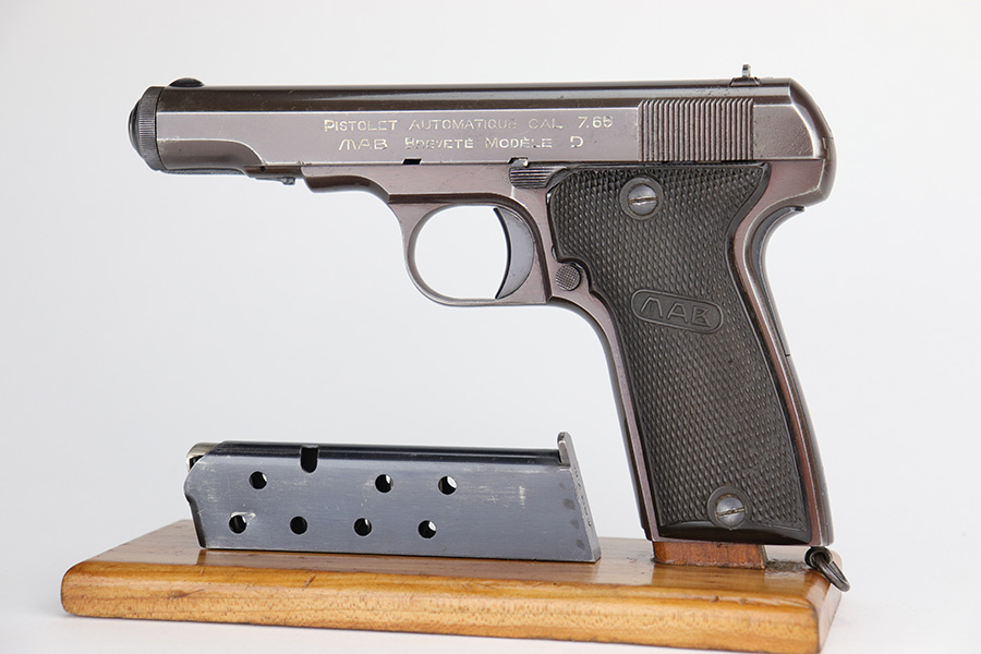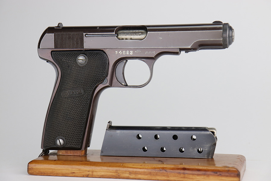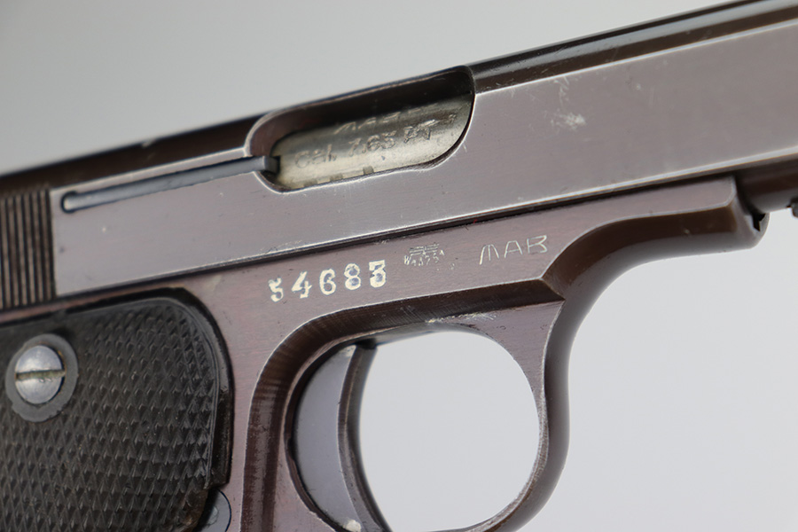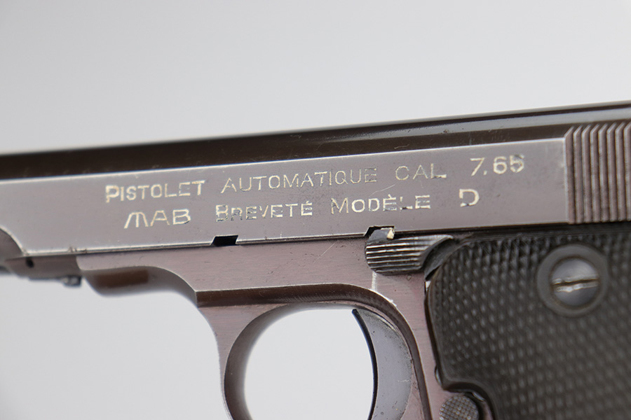 1/10/23 – This is an excellent example of a French MAB Model D made under Nazi occupation and issued to the Nazi military during WW2. The gun is all matching, has the proper “Waffen 251” military acceptance proof on the right side of the slide, and has a Nazi Eagle test proof on the barrel. It has retained about 96% of its original bluing. The finish has a really nice plum hue to it. There is very minor wear around the high edges of the slide. Some minor thinning and a series of small dings on the front strap. Comes with period-correct black bakelite grips (a few tiny chips on the right side) and one period-correct magazine. Mint bore. Original lanyard ring is intact.