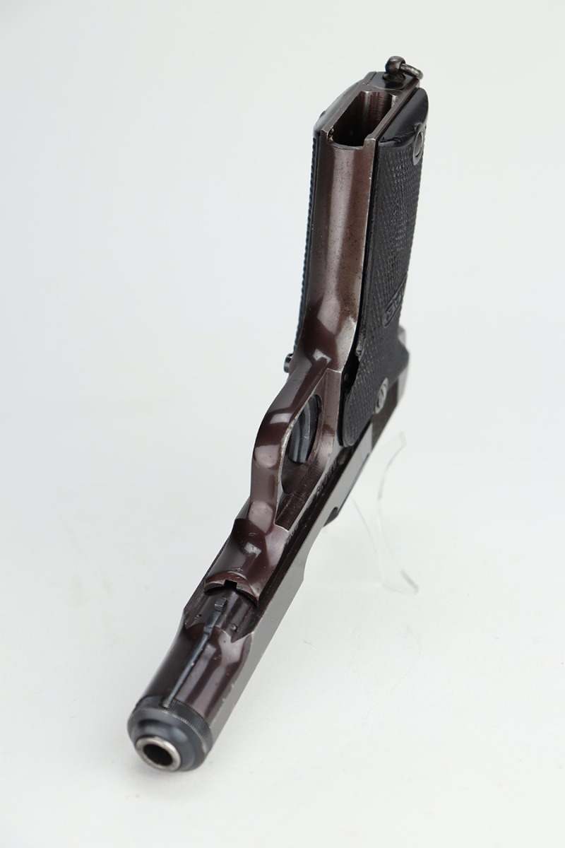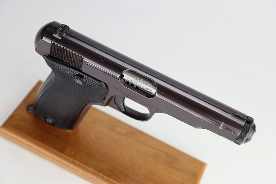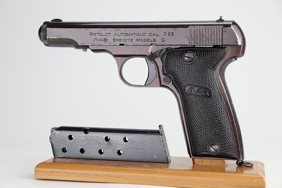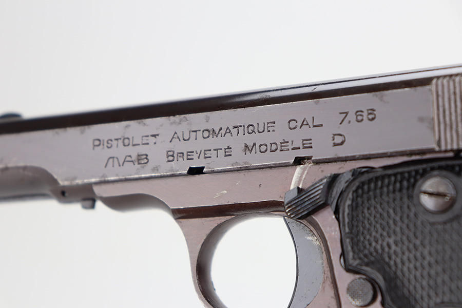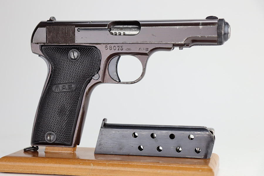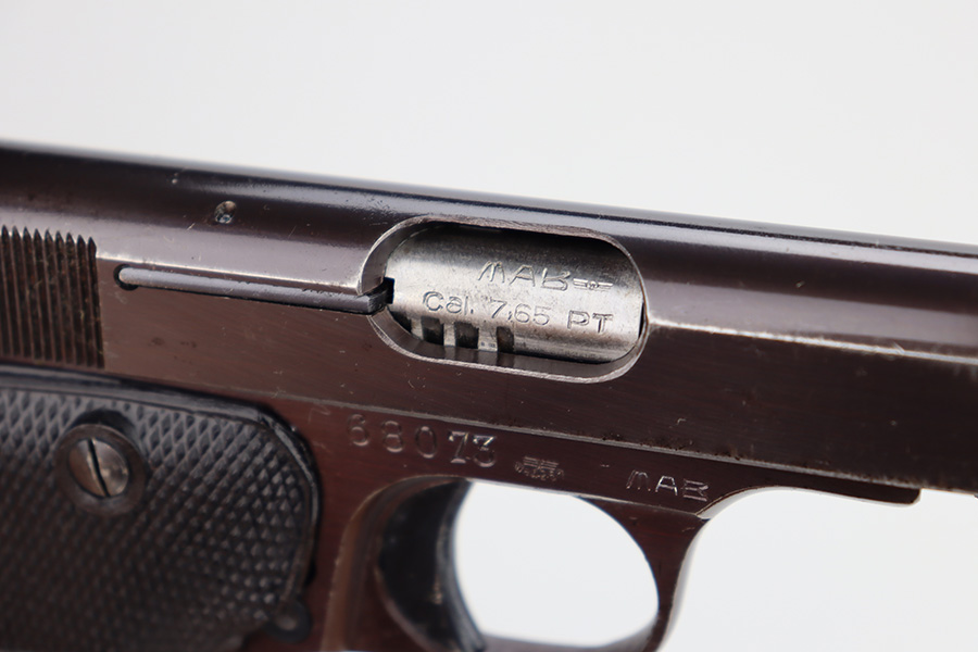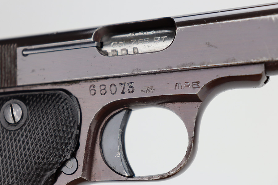11/13/23 – This is a very nice example of a French MAB Model D issued to the Nazi military during WW2. All matching with the proper “Waffen 251” military acceptance proof on the right side of the frame. It has retained about 95% of its original finish. It has a really nice plum tint to it. There is minor wear concentrated around the high edges of the slide. While there is not much actual finish loss, there is light spotty oxidation throughout. Fitted with excellent period-correct black bakelite grips and comes with one proper magazine. Lanyard ring is intact. Very nice bore with strong rifling and just very light pin-pricking in the grooves.