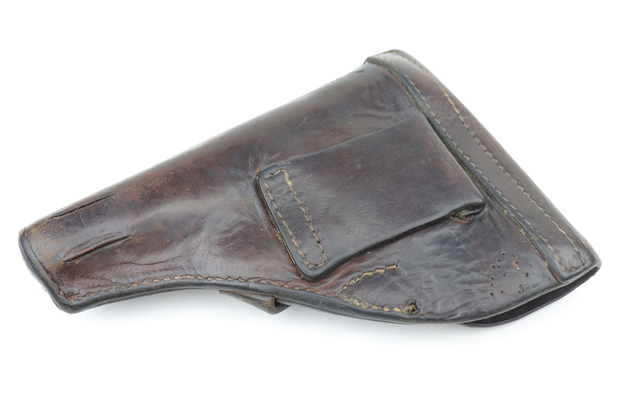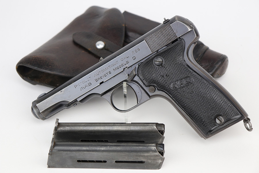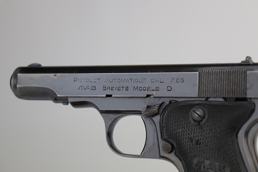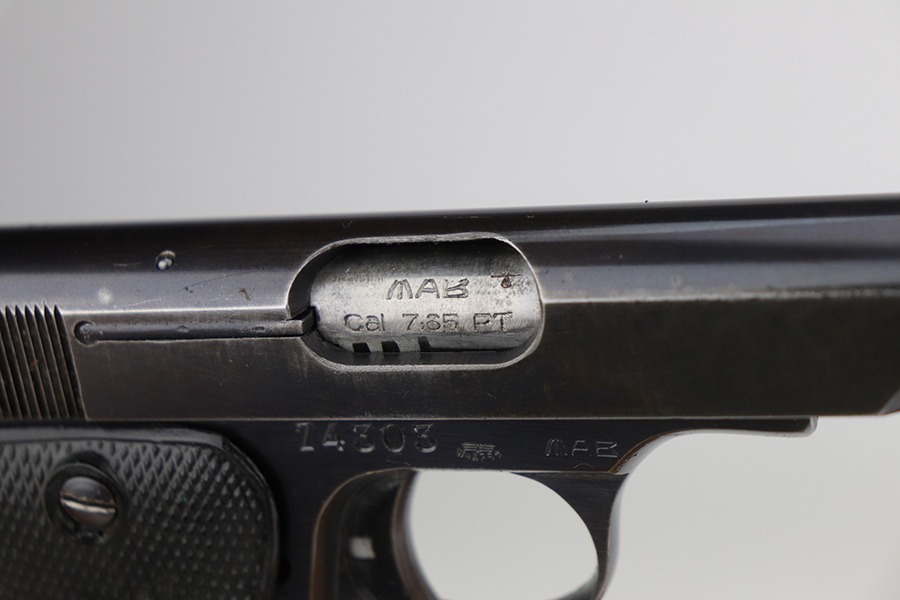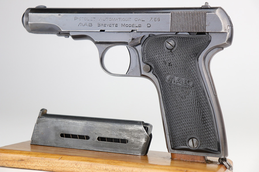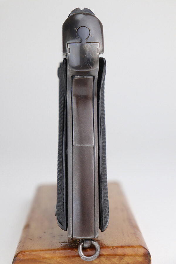 10/26/21 – This is a very nice example of a French Model D issued to the Nazi military during WW2. It is all matching, has the proper military test proof in the ejection port, and has the proper “Waffen 251” Nazi military acceptance proof on the right side of the frame. It comes as a rig with two period-correct magazines and a slightly worn period-correct brown leather holster (un-marked). The gun has retained about 85% of its finish. There is minor wear along the high edges, some discoloration around the muzzle, and spotty wear along the length of the right side of the slide. Some light brown patina on both grip straps. The original lanyard ring is intact. The grips are slightly warped around the edges, there is a small hole in the left grip, and there is a small chip in one of the corners on the right grip. The bore is mint.