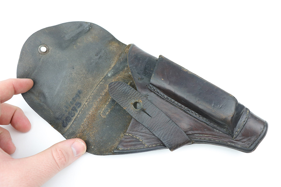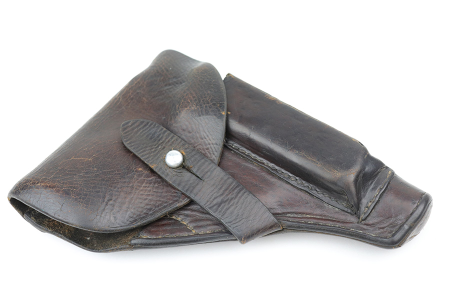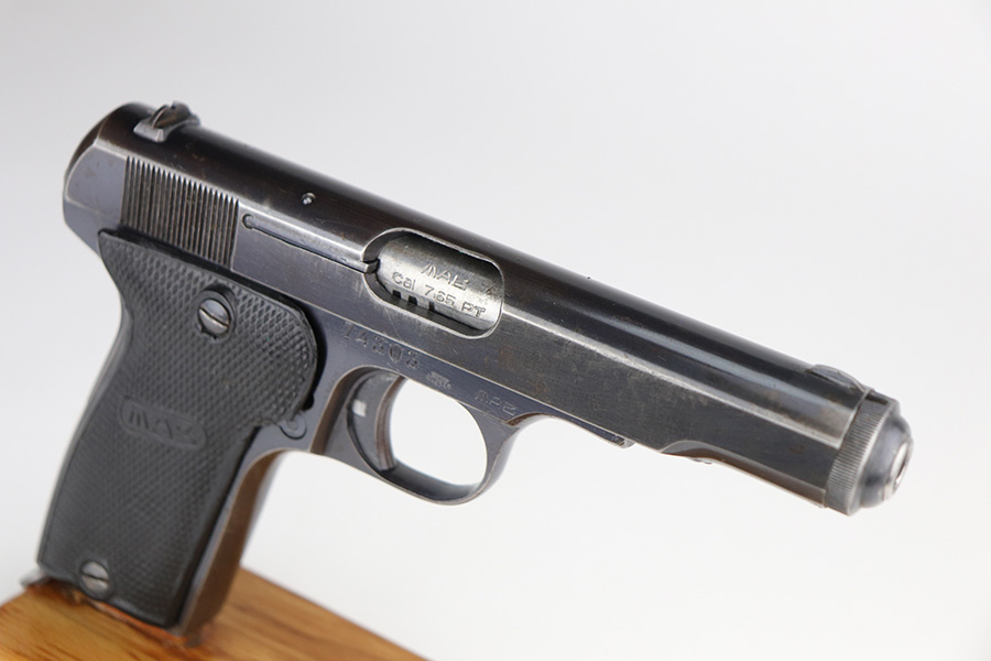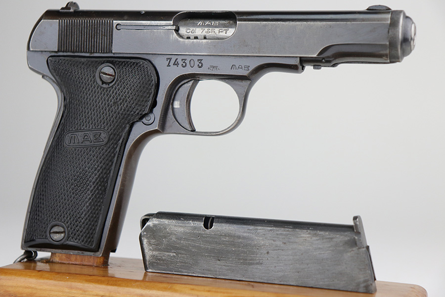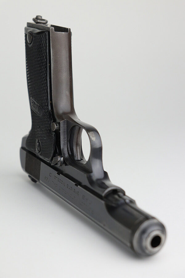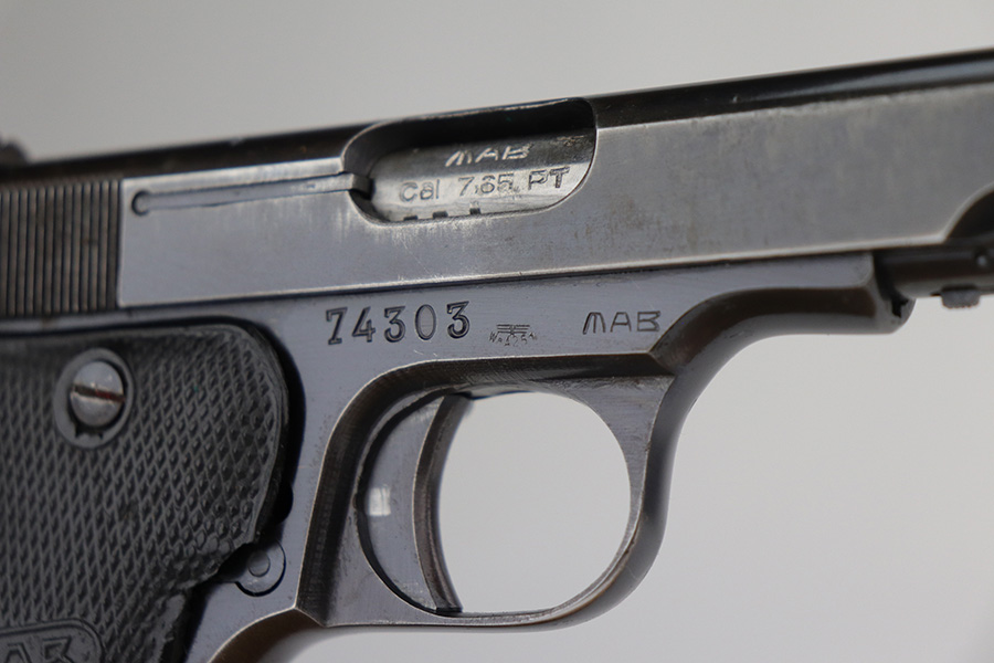 10/26/21 – This is a very nice example of a French Model D issued to the Nazi military during WW2. It is all matching, has the proper military test proof in the ejection port, and has the proper “Waffen 251” Nazi military acceptance proof on the right side of the frame. It comes as a rig with two period-correct magazines and a slightly worn period-correct brown leather holster (un-marked). The gun has retained about 85% of its finish. There is minor wear along the high edges, some discoloration around the muzzle, and spotty wear along the length of the right side of the slide. Some light brown patina on both grip straps. The original lanyard ring is intact. The grips are slightly warped around the edges, there is a small hole in the left grip, and there is a small chip in one of the corners on the right grip. The bore is mint.