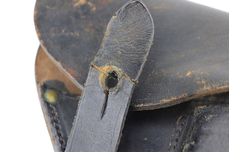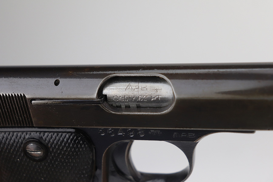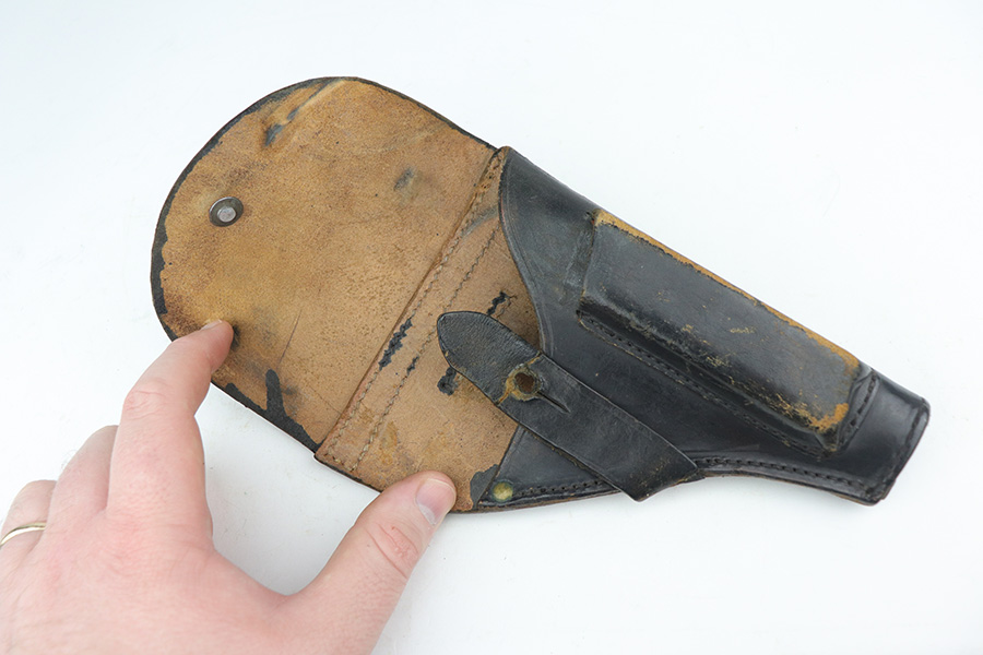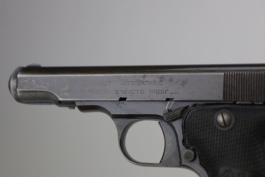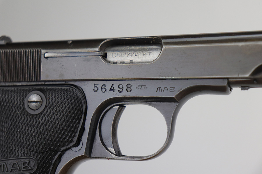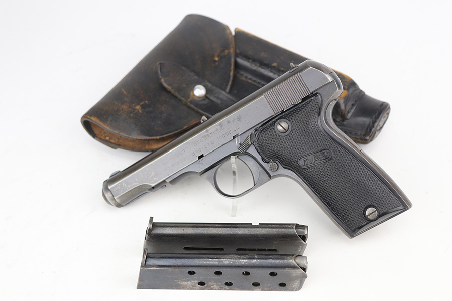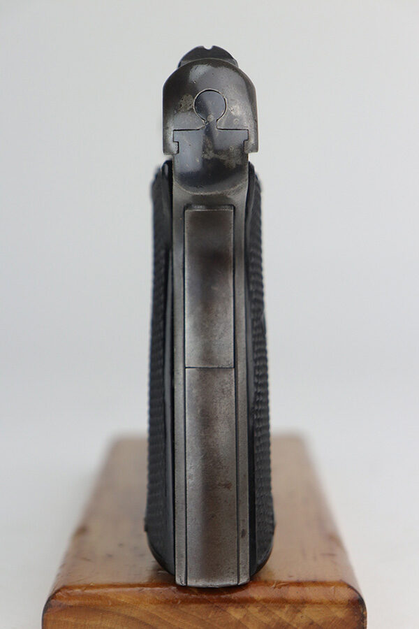 11/4/21 – This is a nice example of a French Model D issued to the Nazi military during WW2. It is all matching and has the proper “Waffen 251” Nazi military acceptance proof on the right side of the frame. Proper Nazi test eagle proof in the ejection port. It comes as a rig with two period-correct magazines and a period-correct waffen-proofed holster. There are scuffs in the leather throughout, most noticeable on the edges of the mag pouch. There is also light cracking in the top flap, and some tearing in the closure strap. The gun has retained a little over half of its finish. There is noticeable thinning on the whole slide and both grip straps. There is minor wear concentrated around the high edges of the slide. There is an area of small dots of discoloration on the left side of the slide near the muzzle. Areas of spotty oxidation and pits here and there along the slide. There is spotty oxidation on both grip straps. Comes with very nice period-correct black bakelite grips – hairline crack on the right side. The bore is near-mint – shiny with strong rifling.