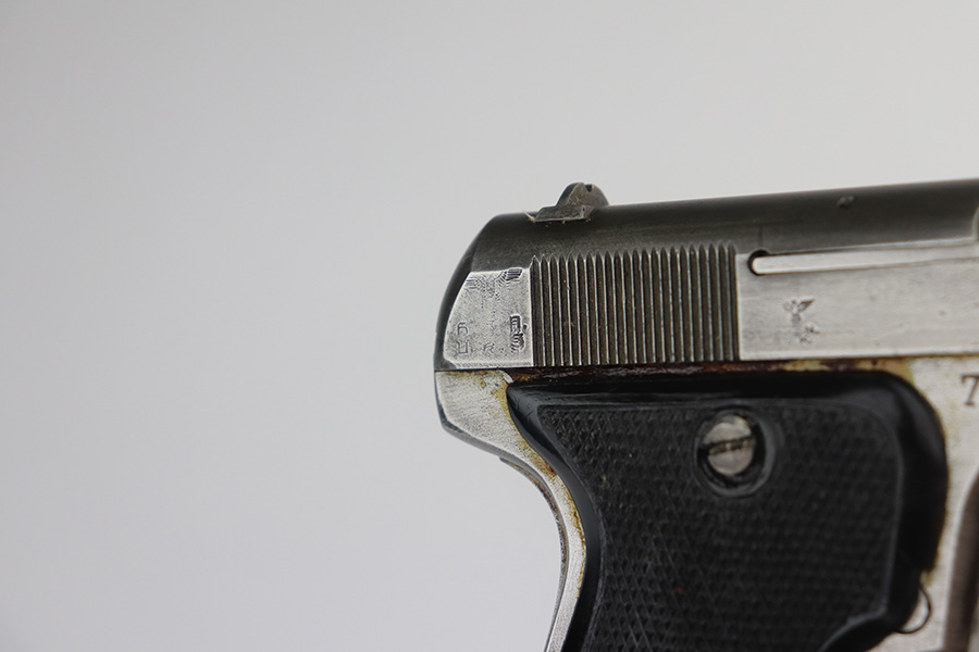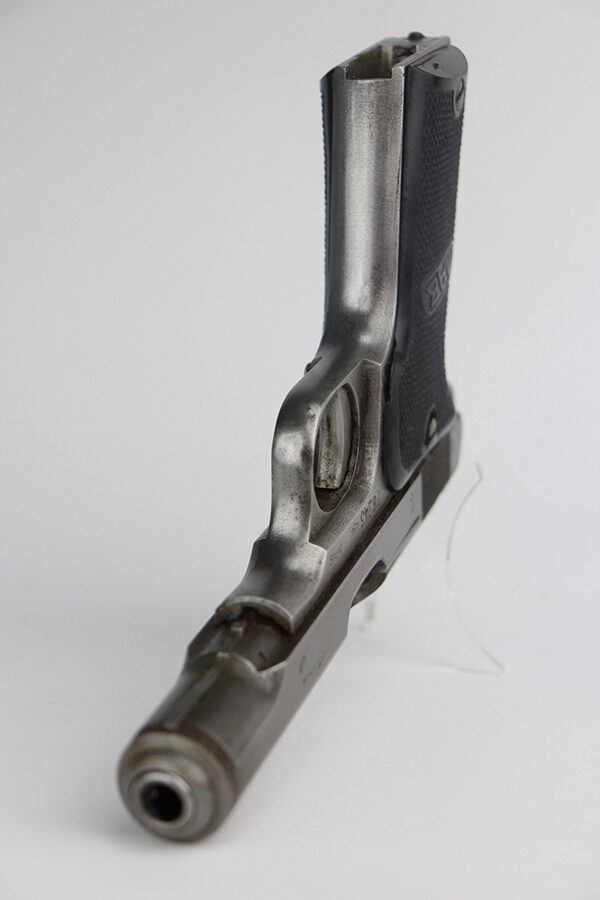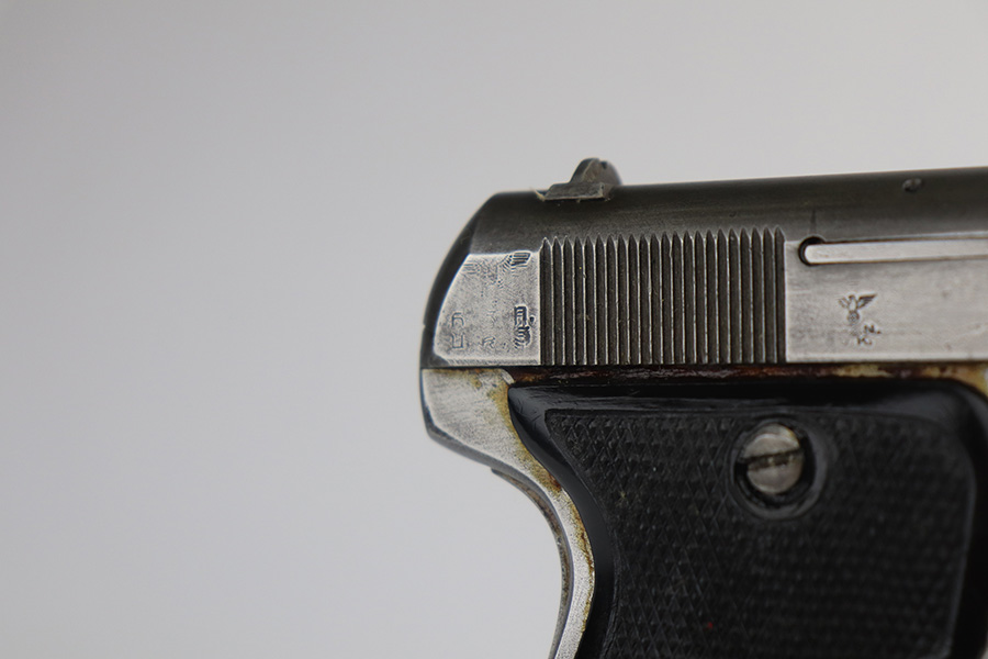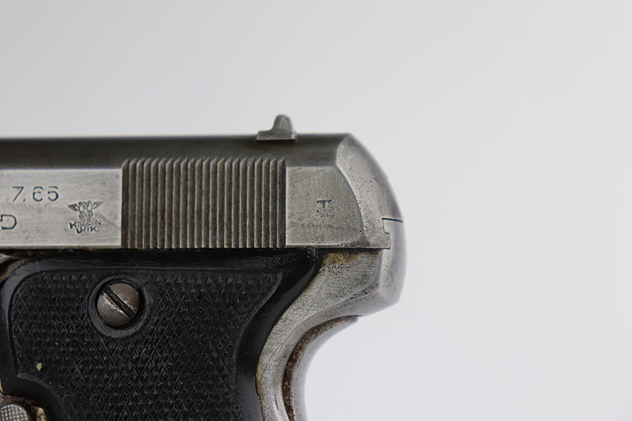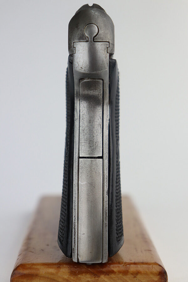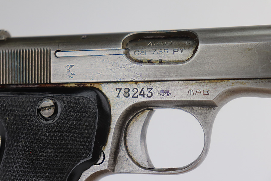 6/26/21 – This is a nice example of a French MAB Model D issued to the Nazi military during WW2. It is matching and has the proper “Waffen 251” military proof. It also has several “Nazi Eagle H.Z.N. U.K.” markings on the slide and frame. We’re not sure what it means. The metal parts are also completely in the white – unfinished. Certainly a very interesting pistol. Since there is no finish to rate, we gave the gun an overall condition rating of 85%. There are areas of tiny dots of oxidation, light scratches here and there, and very minor pin-pricking here and there. There is thick grease in the internals – could benefit from a good cleaning. Comes with nice grips and an unfinished magazine. Very nice bore – shiny with strong rifling.