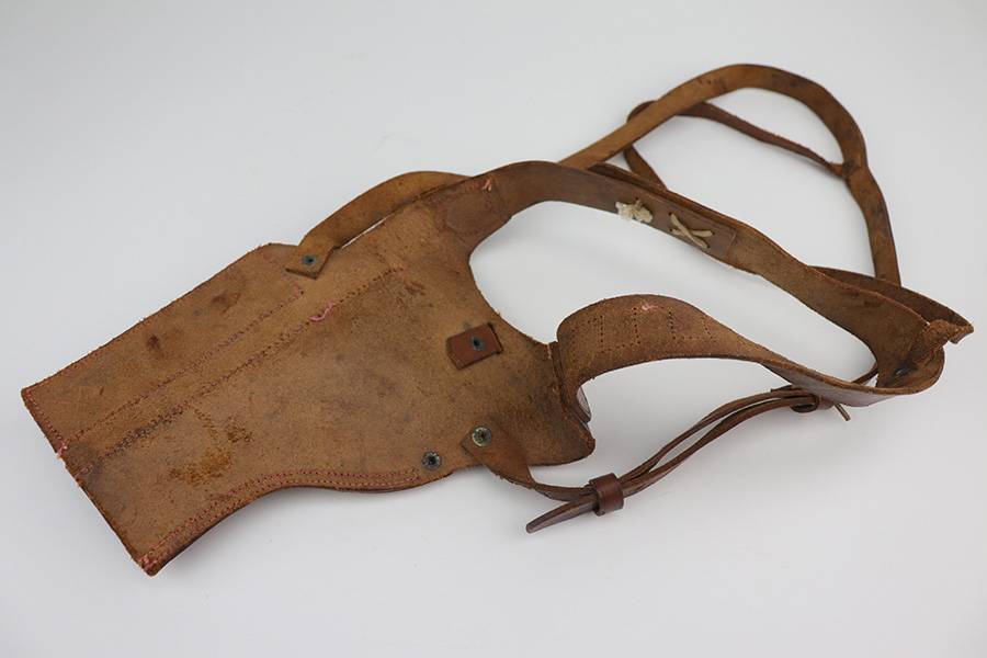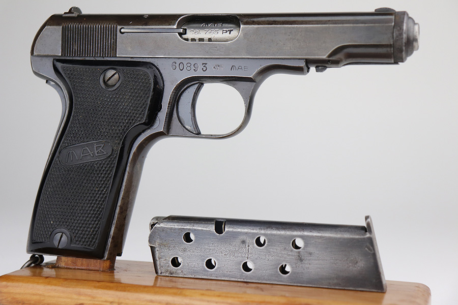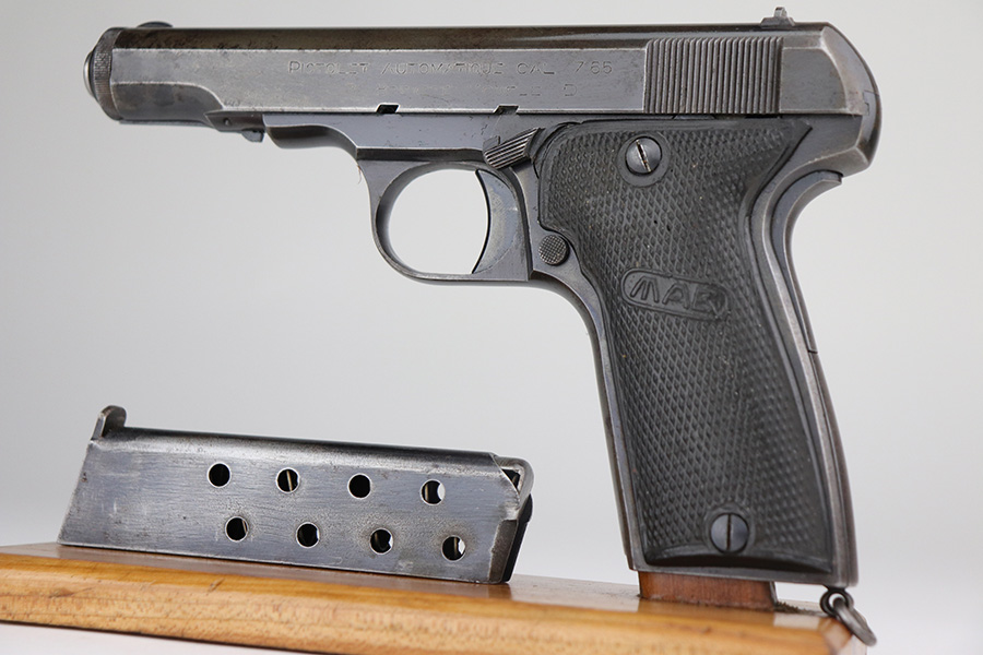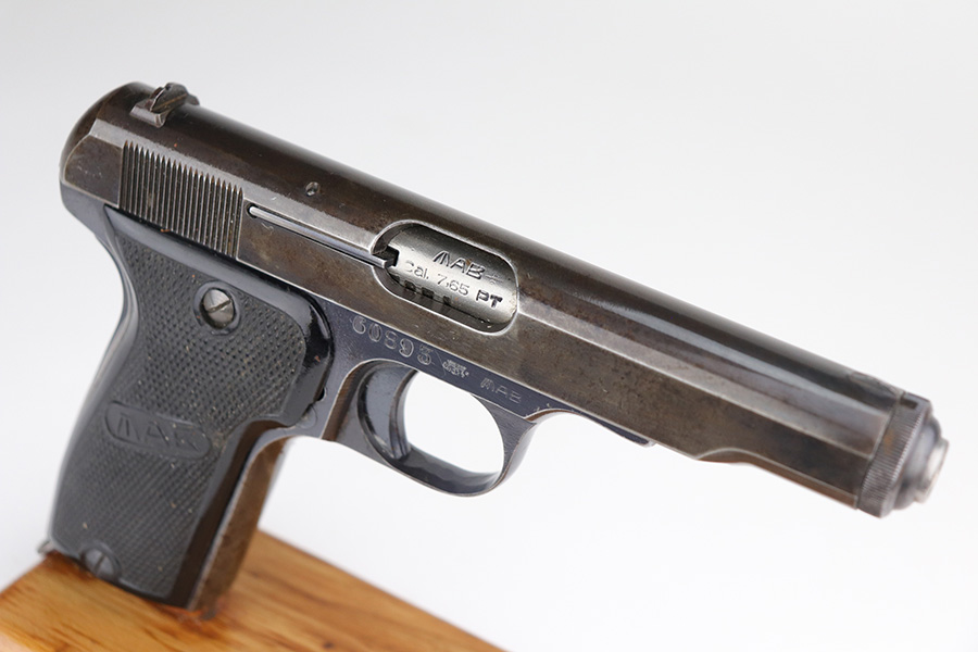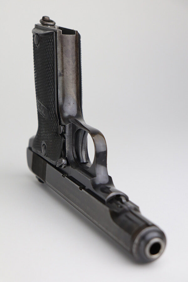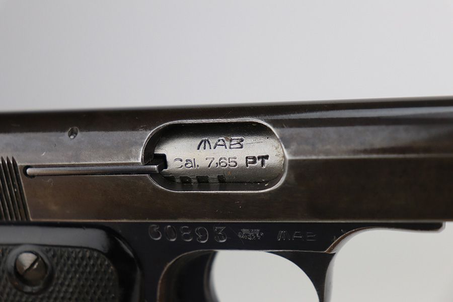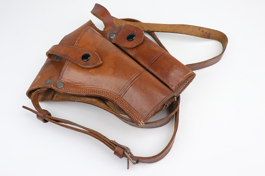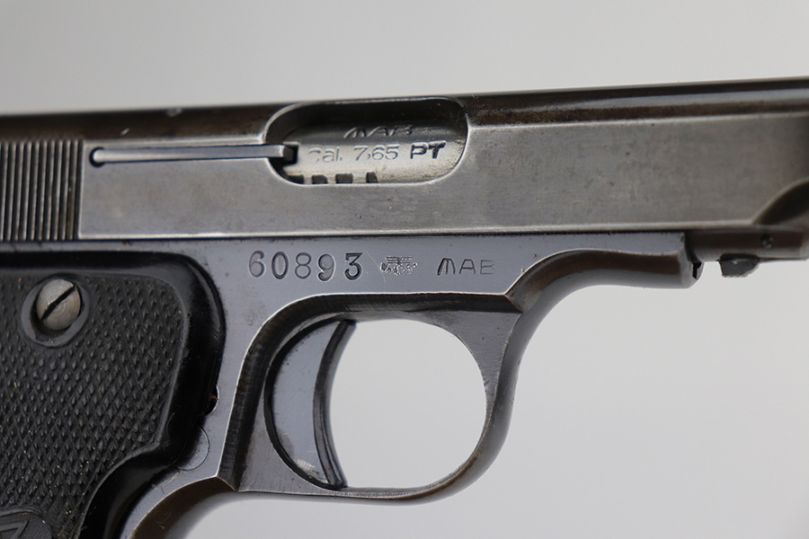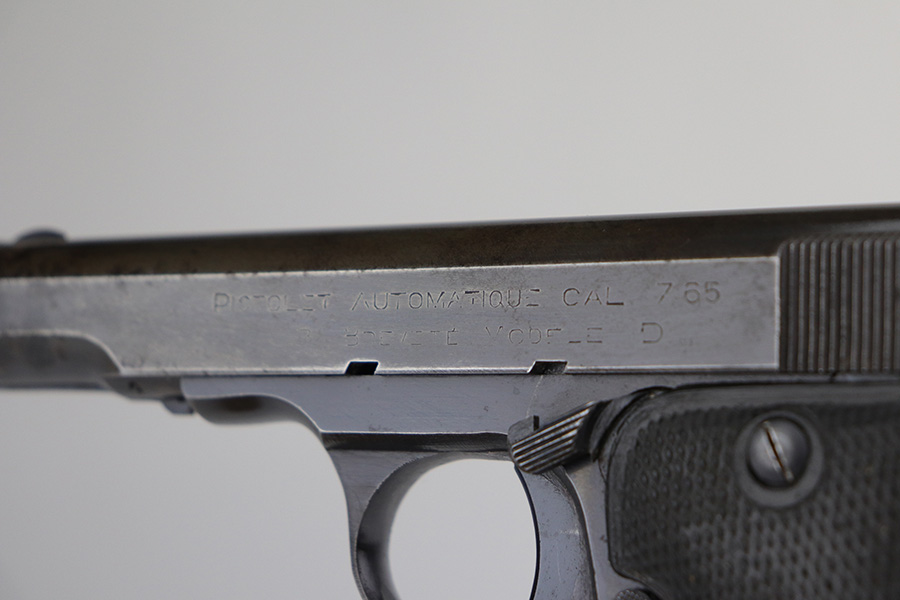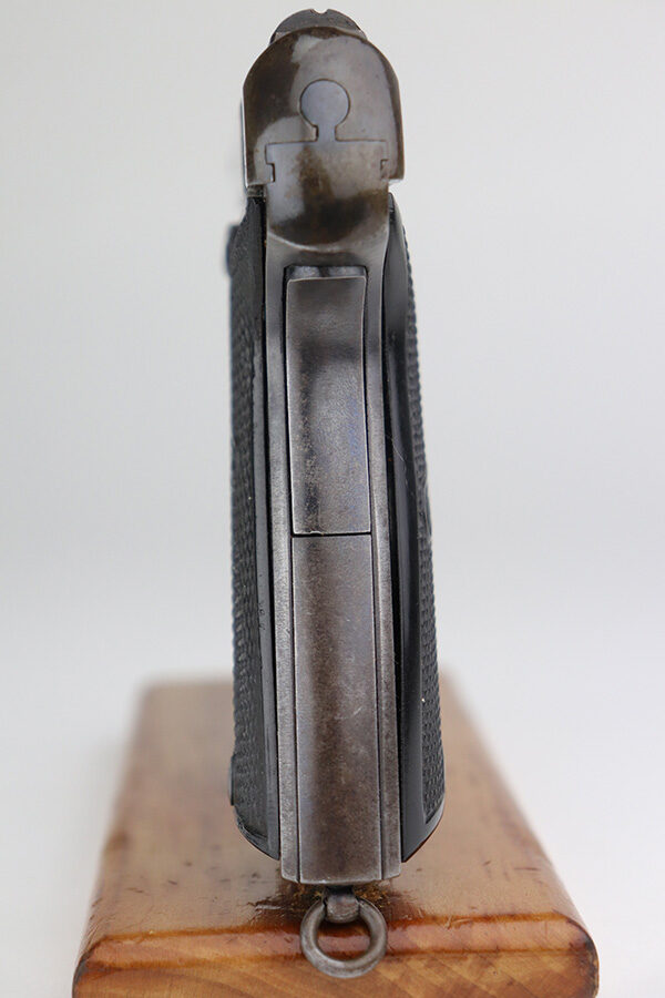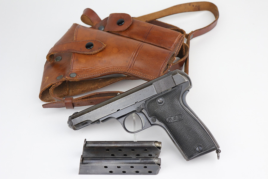 10/26/21 – This is a nice example of a French Model D issued to the Nazi military during WW2. It is all matching, has the proper Nazi test proof in the ejection port, and has the proper “Waffen 251” Nazi military acceptance proof on the right side of the frame. It comes as a rig with two period-correct magazines and a post-war tan leather shoulder holster. The gun has retained roughly 50% of its finish. There is significant thinning on the whole slide and spotty wear on both grip straps. There is spotty oxidation and light brown patina on the whole gun. An area of very minor pitting on the left side of the slide near the muzzle. Comes with nice black bakelite grips. The bore is mint.