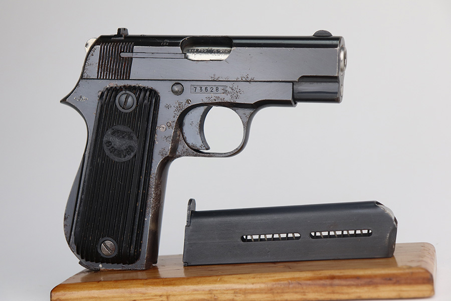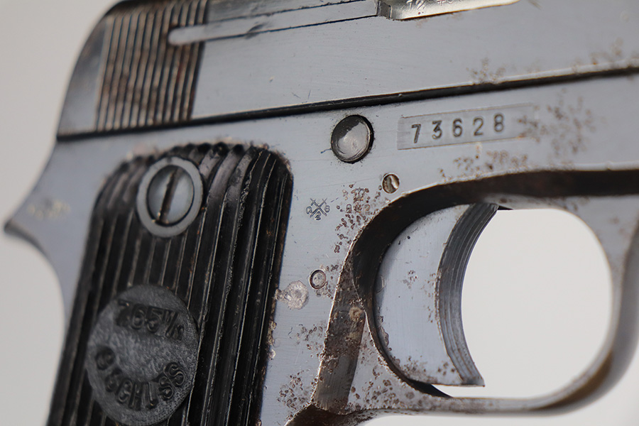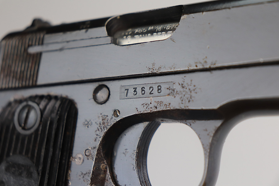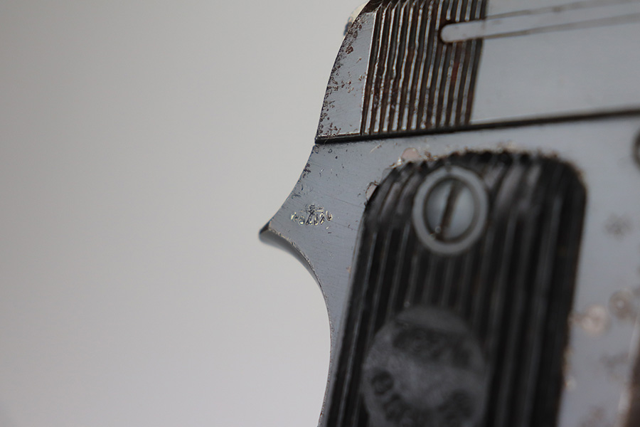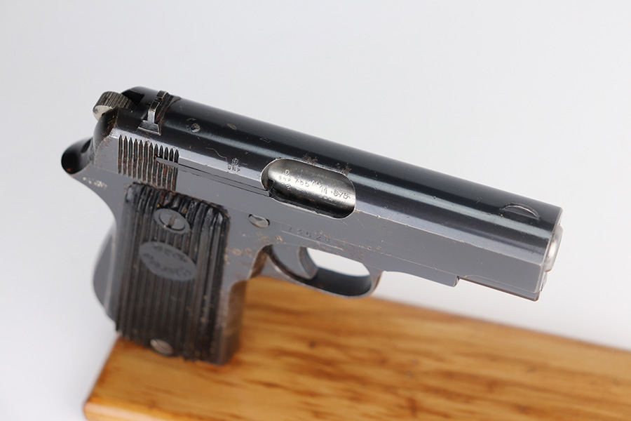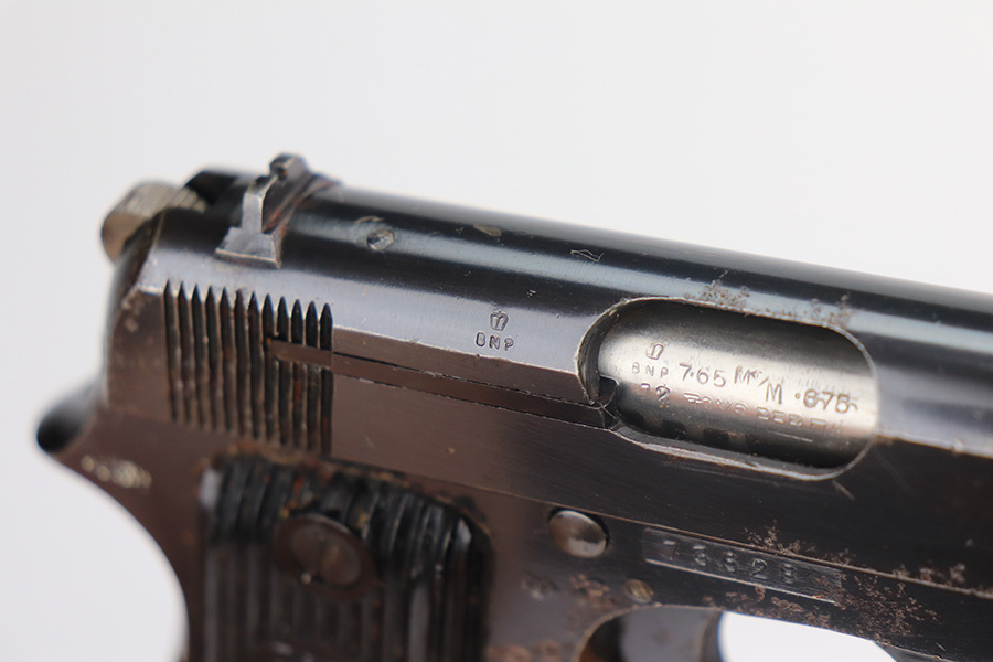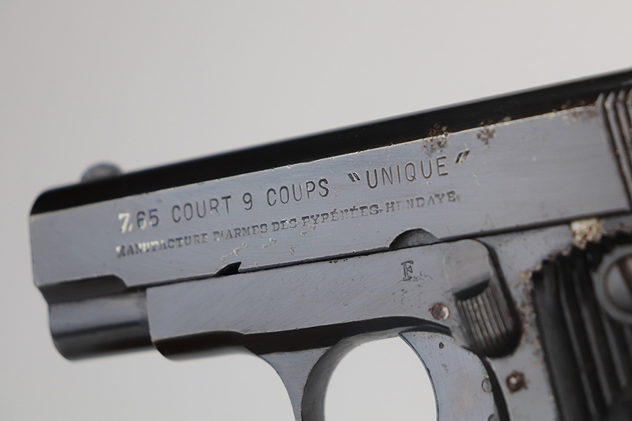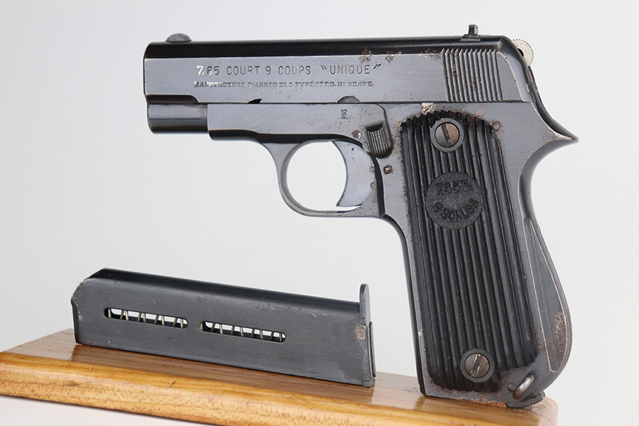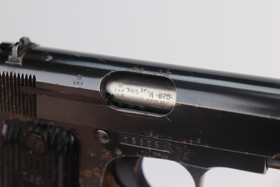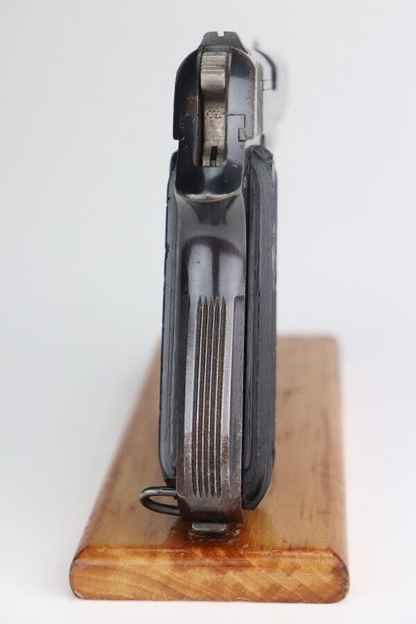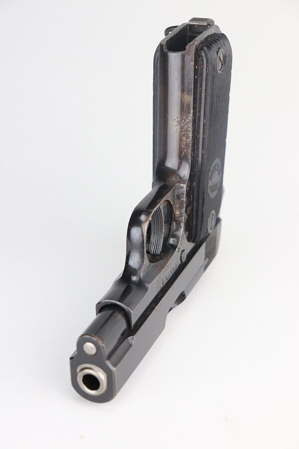 5/26/21 – This is a French Unique Kriegsmodell pistol issued to the Nazi military during WW2. The gun is all matching and has the proper Nazi military proofs. There are also British proofs throughout. It was likely captured by the British during WW2. The gun has retained roughly 85% of its original finish. There isn’t much actual finish loss, but there are areas of significant pitting throughout. It is most noticeable on the whole right side of the gun and on the straps. Comes with nice grips and a period-correct magazine. The bore is excellent – shiny with strong rifling.