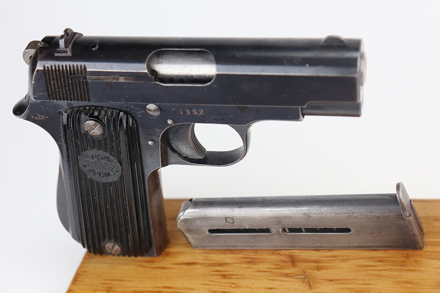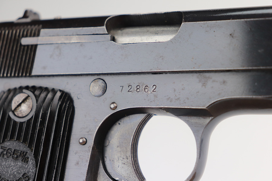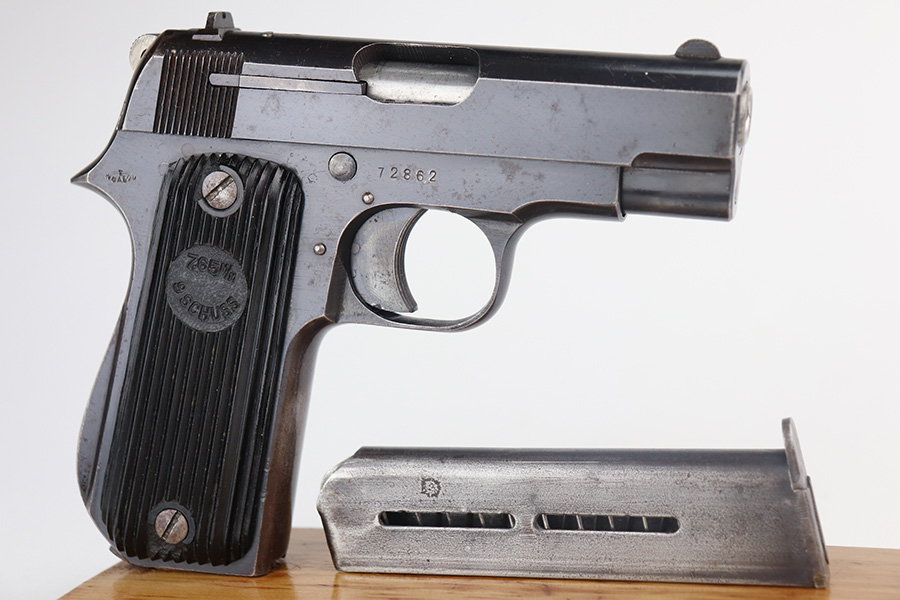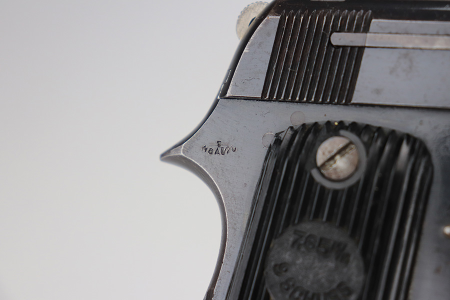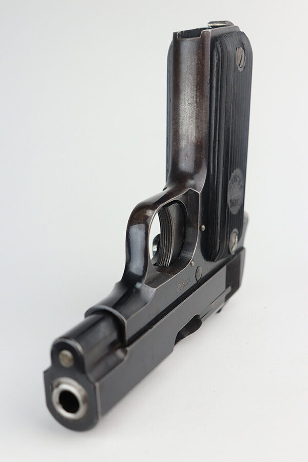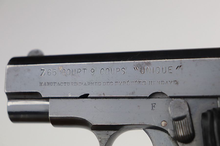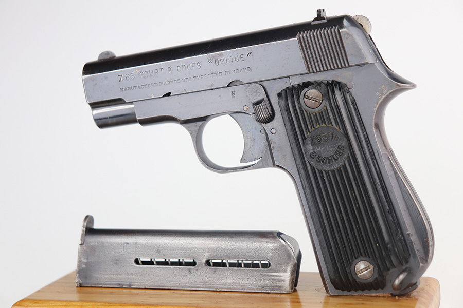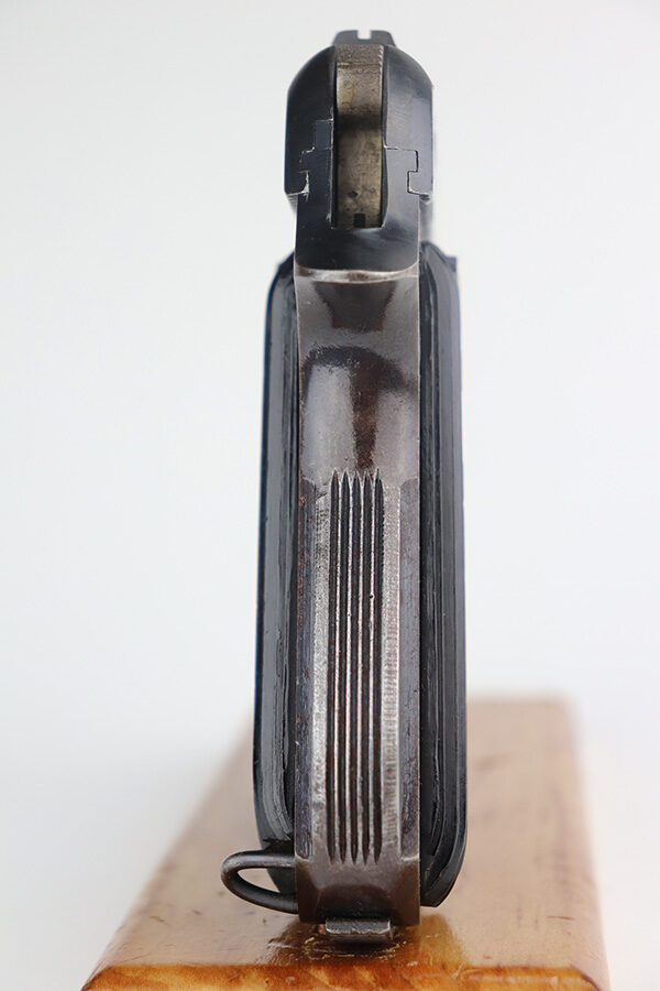 6/1/21 – This is a very nice example of a French Unique Kriegsmodell issued to the Nazi military during WW2. The gun is matching and has the proper waffen military proof. It has retained somewhere between 85 and 90% of its original finish. Most of the wear is on the straps, where there is also patina and pin-pricking. There is also wear along the high edges of the slide. There are small spots of oxidation here and there. Comes with nice period-correct grips – small chips around the screw holes. Also comes with a period-correct magazine. The bore is excellent – shiny with strong rifling.