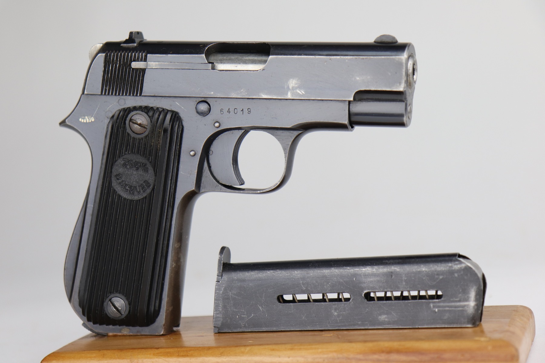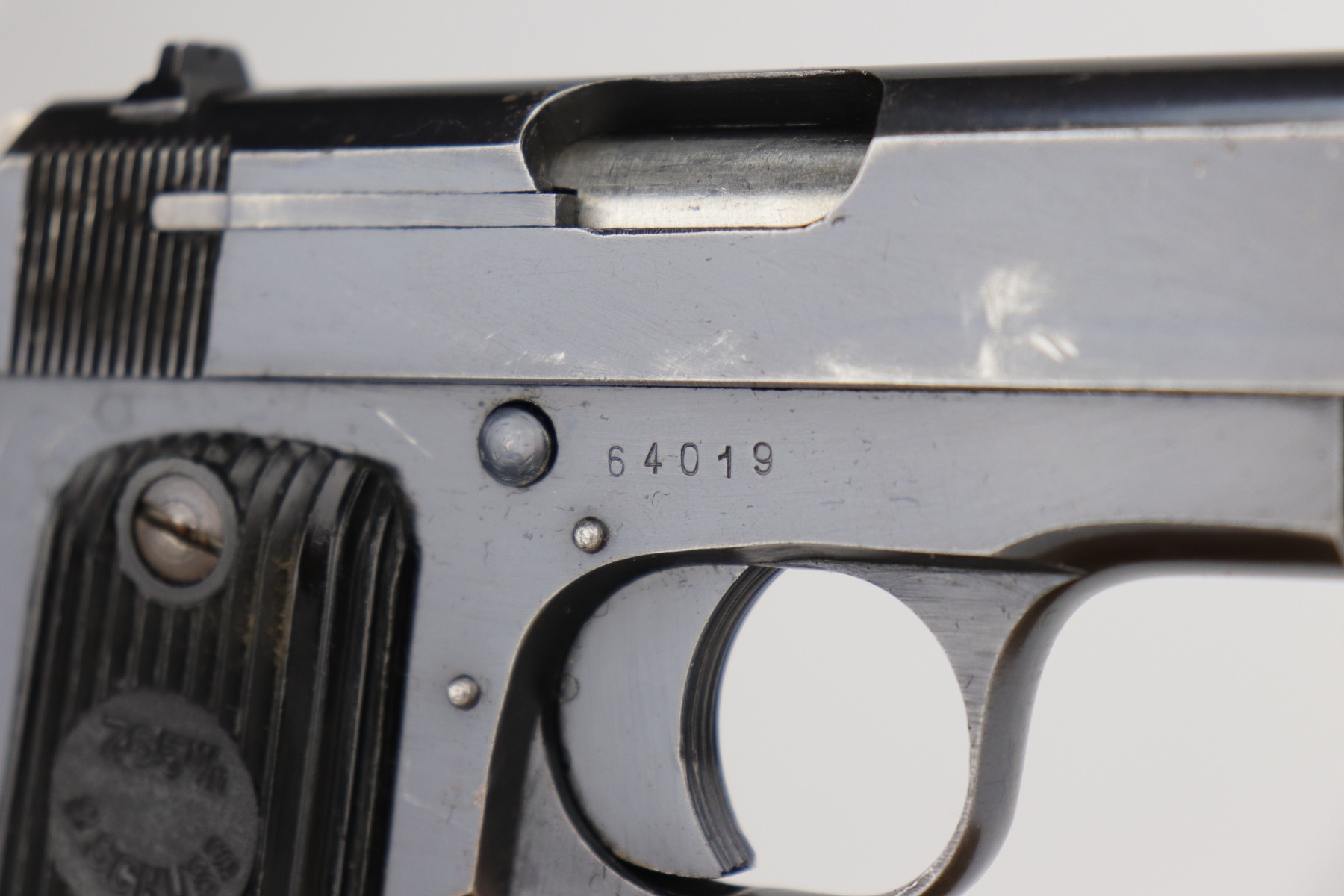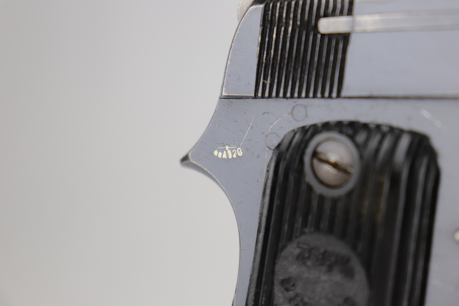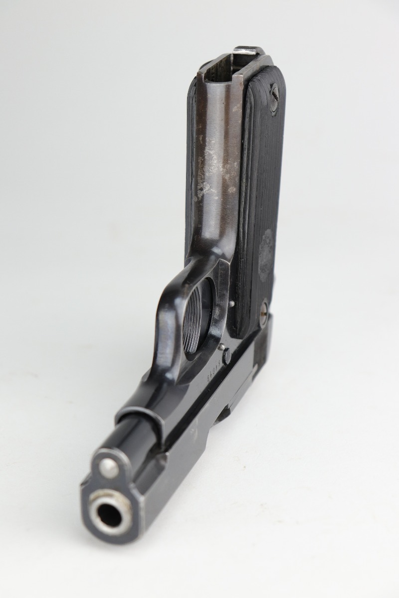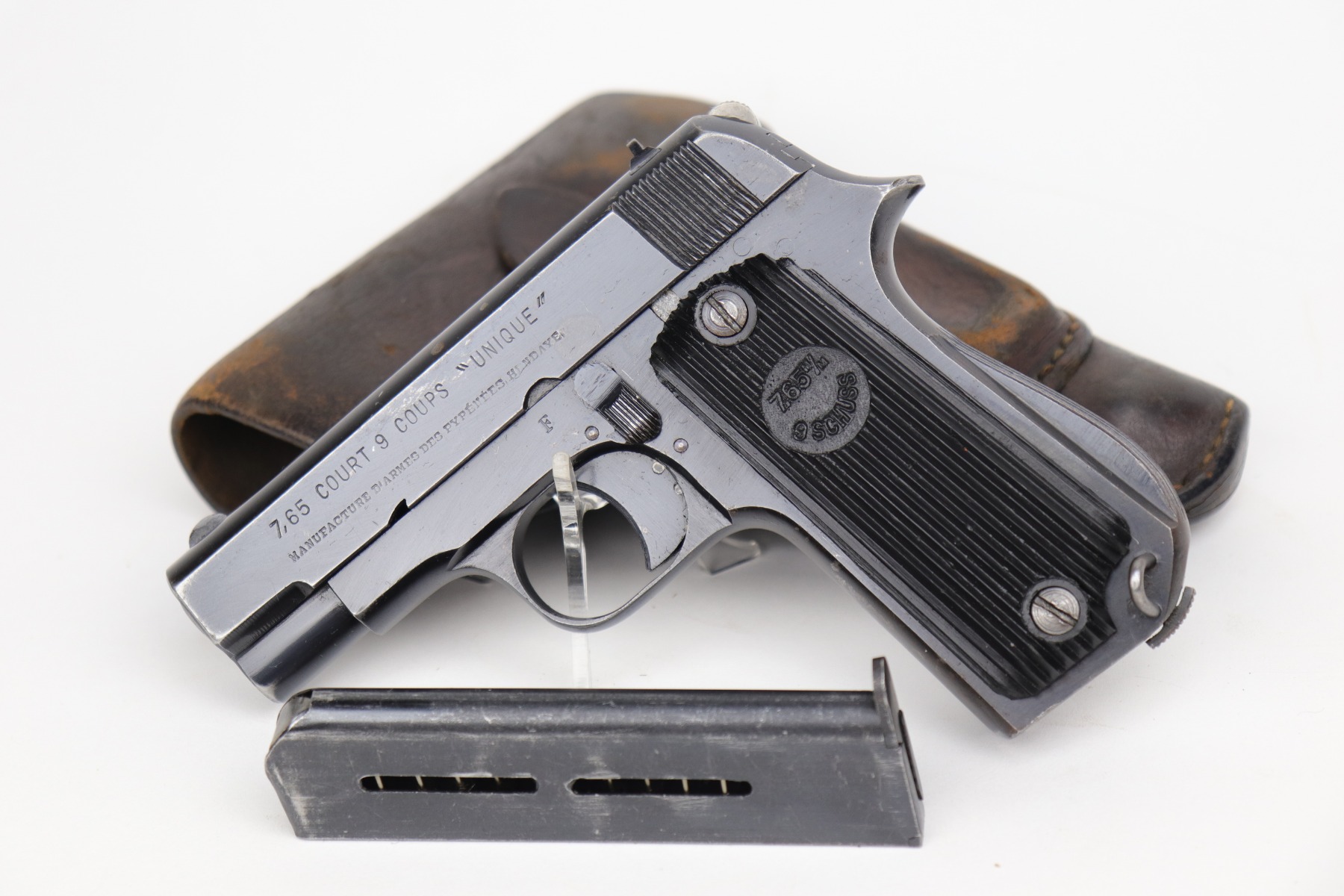 10/30/20 – This is a very nice example of a French Unique Kriegsmodell rig issued to the Nazi military around 1940. The Kriegsmodell is a German design, made to be an improvement over the French-made Model 17. This particular pistol must have been made just shorty after the Nazi’s took over in 1940, given its high polish finish. It is all matching and has the proper “Waffen d20” Nazi military acceptance proof on the tang. This gun has retained roughly 85% of its original bluing. Most of the wear is on the front strap, where there is thinning and spotty wear. There is wear on the high edges of the slide and some spotty wear on the slide as well. There are some light scratches on the right side of the frame. The gun has nice original grips and one period-correct magazine. The rig also includes a period-correct brown leather holster. The bore is excellent – shiny with strong rifling.