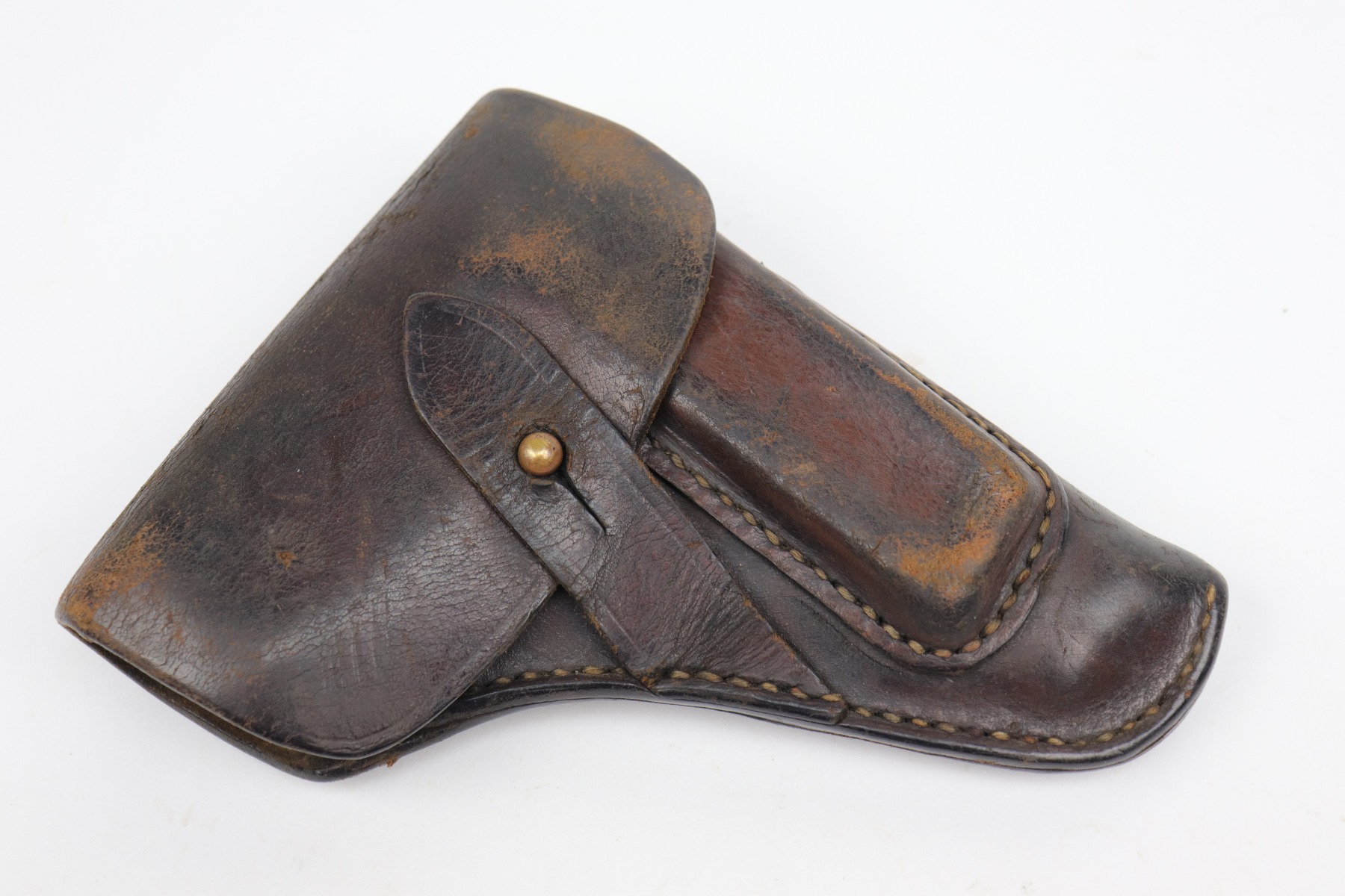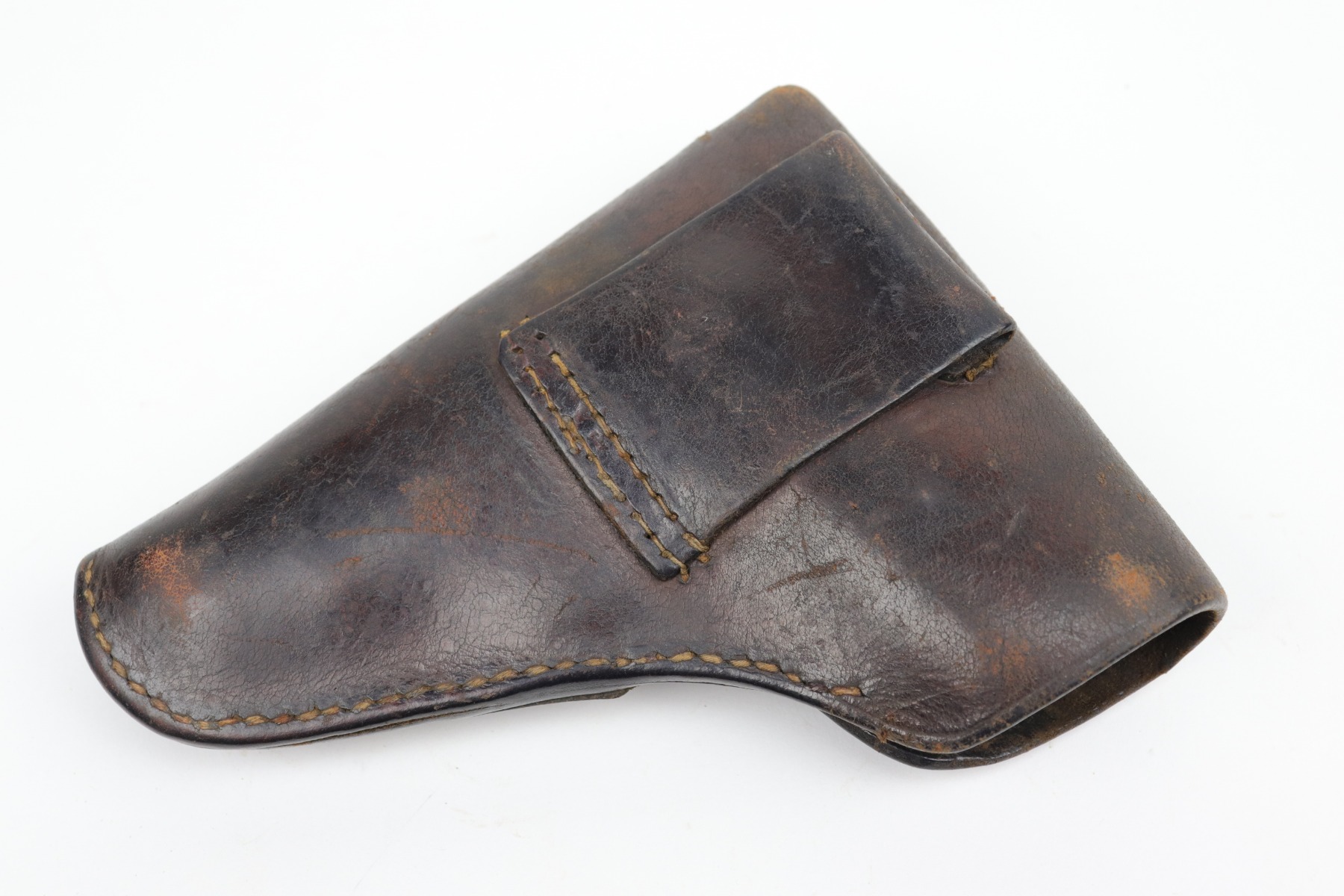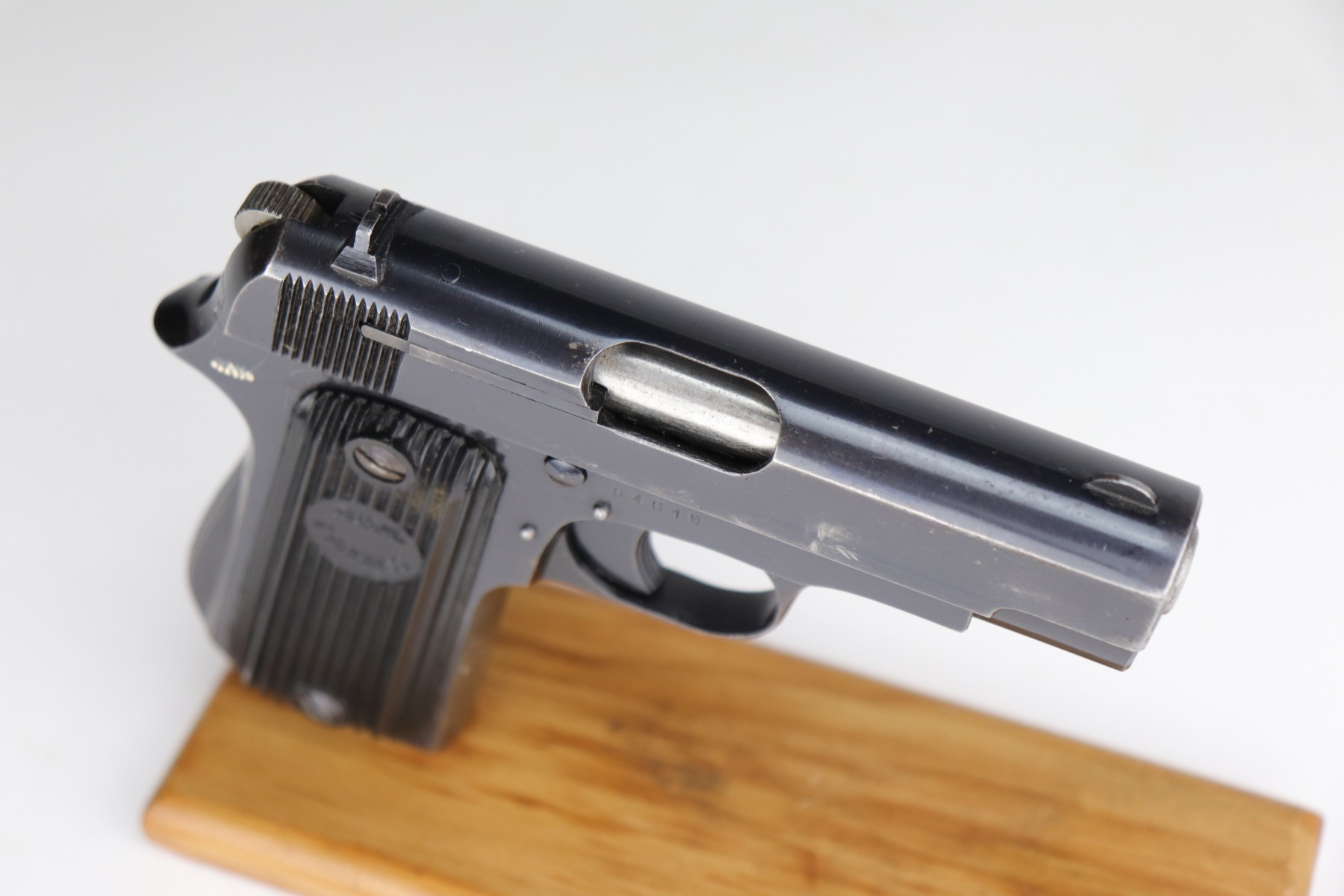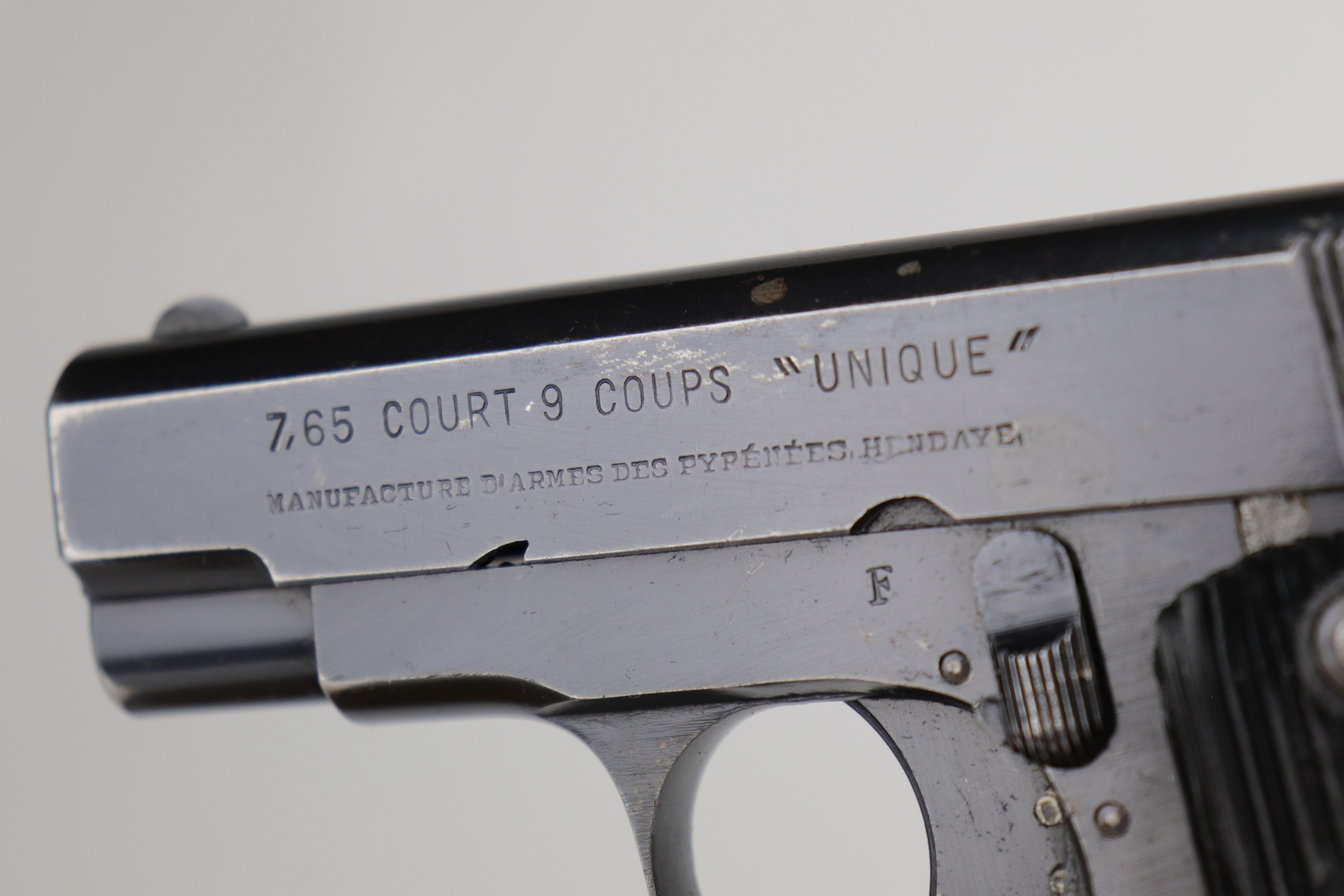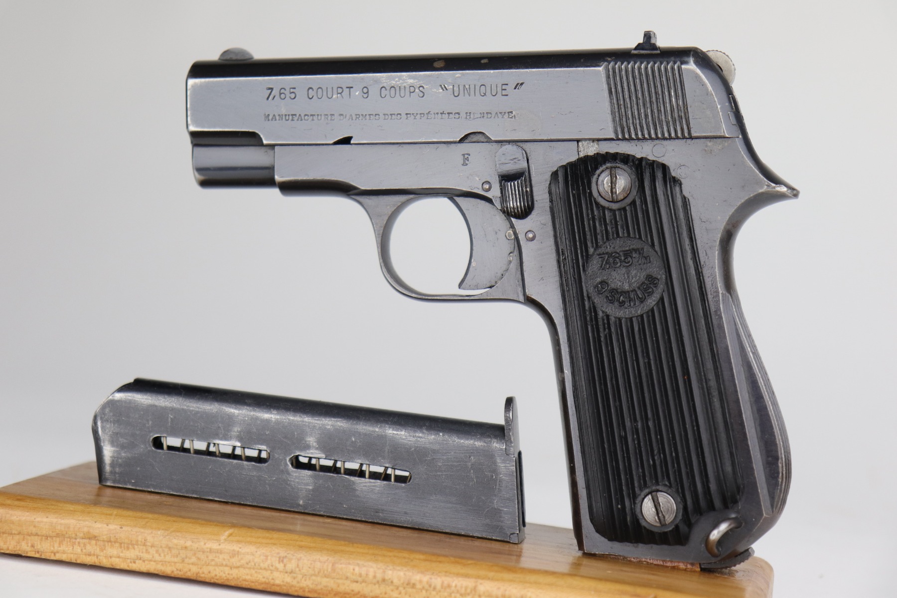 10/30/20 – This is a very nice example of a French Unique Kriegsmodell rig issued to the Nazi military around 1940. The Kriegsmodell is a German design, made to be an improvement over the French-made Model 17. This particular pistol must have been made just shorty after the Nazi’s took over in 1940, given its high polish finish. It is all matching and has the proper “Waffen d20” Nazi military acceptance proof on the tang. This gun has retained roughly 85% of its original bluing. Most of the wear is on the front strap, where there is thinning and spotty wear. There is wear on the high edges of the slide and some spotty wear on the slide as well. There are some light scratches on the right side of the frame. The gun has nice original grips and one period-correct magazine. The rig also includes a period-correct brown leather holster. The bore is excellent – shiny with strong rifling.
