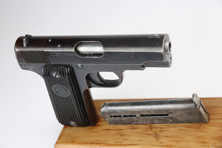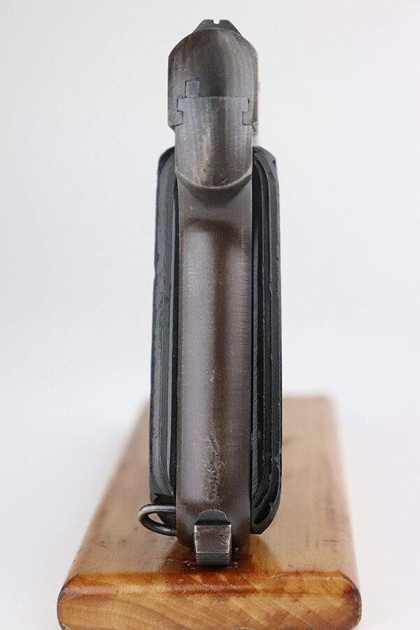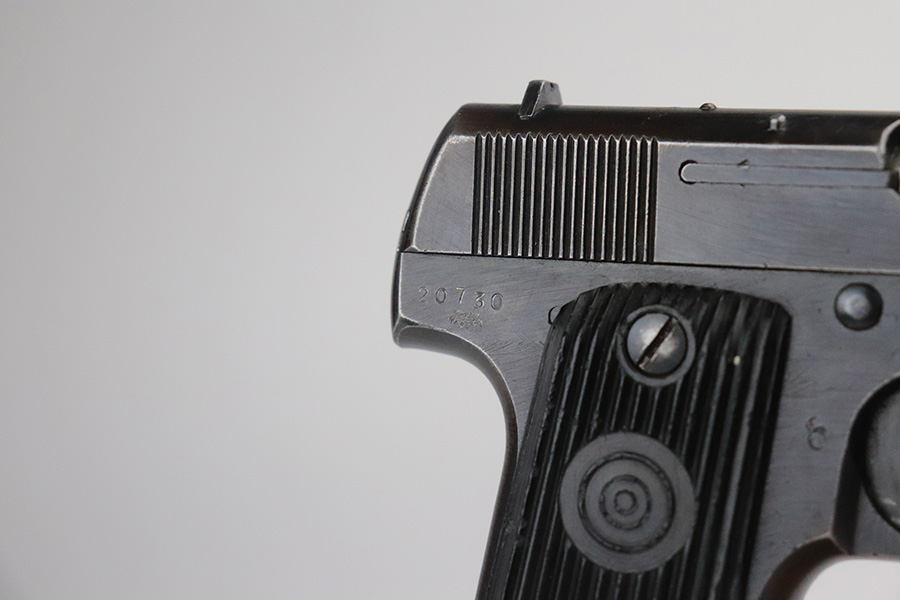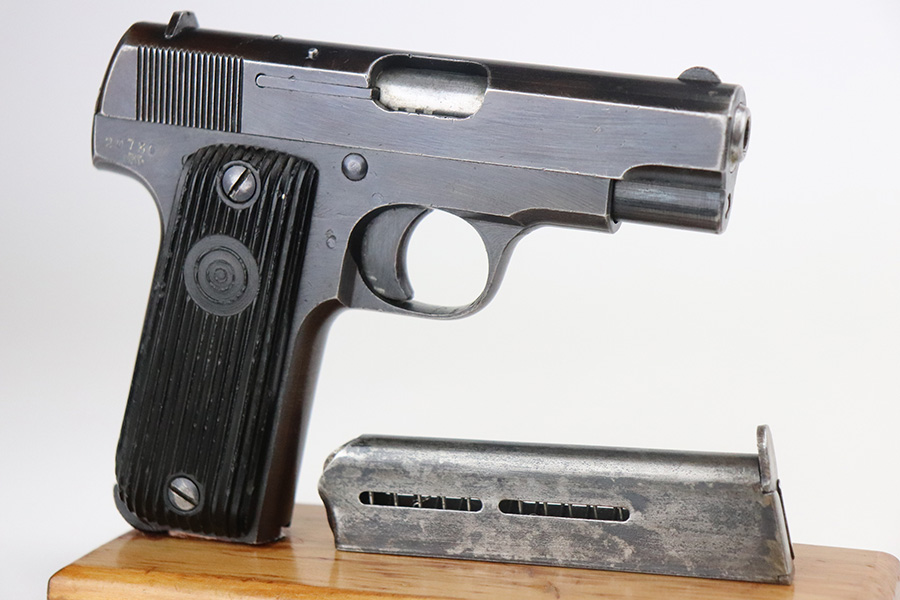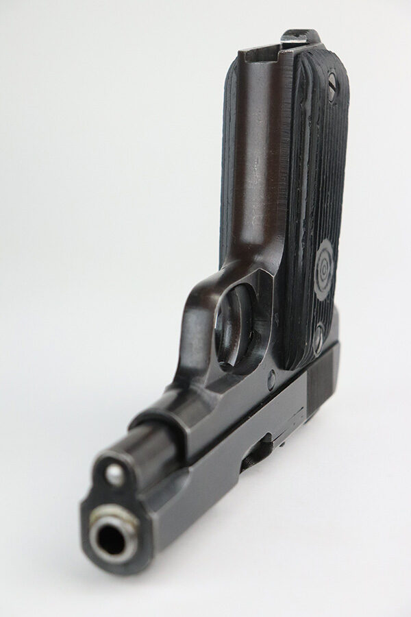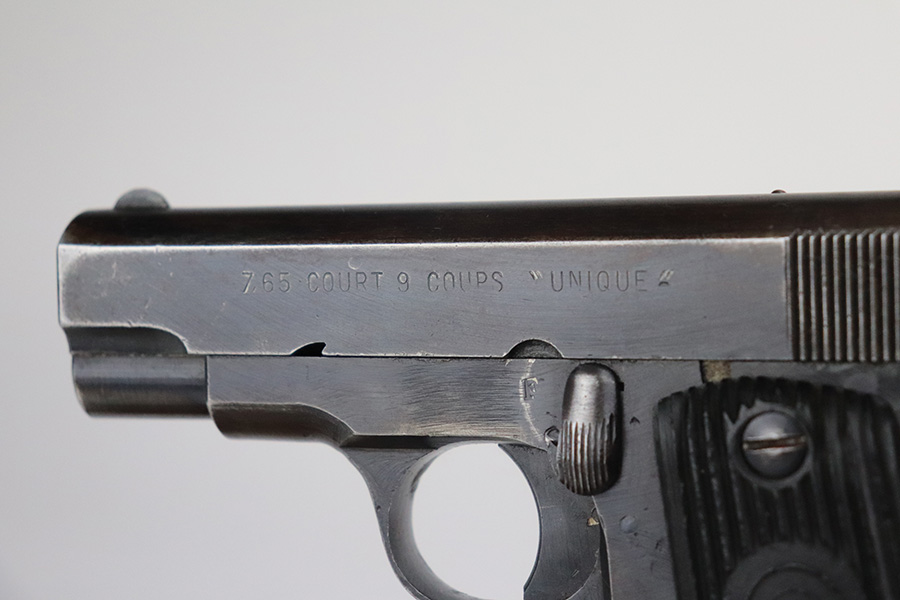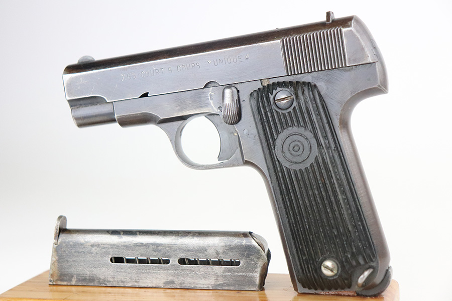 9/2/21 – This is a very nice example of a French Unique Model 17 issued to the Nazi military during WW2. It is all matching and has the proper “Waffen 251” military proof on the right side of the tang. This is a first variation gun, characterized by the single-line slide legend. It has retained about 90% of its original finish. There is minor wear around the high edges of the slide and around the muzzle. Minor spotty wear and brown patina on the straps. There are a few small dings along the slide as well. It comes with very nice original grips and a proper magazine. The bore is mint.