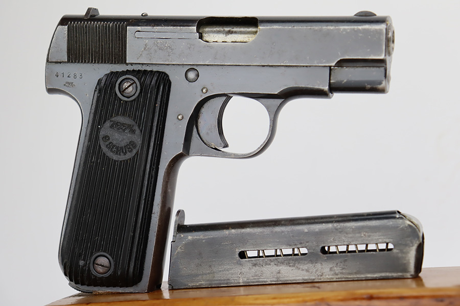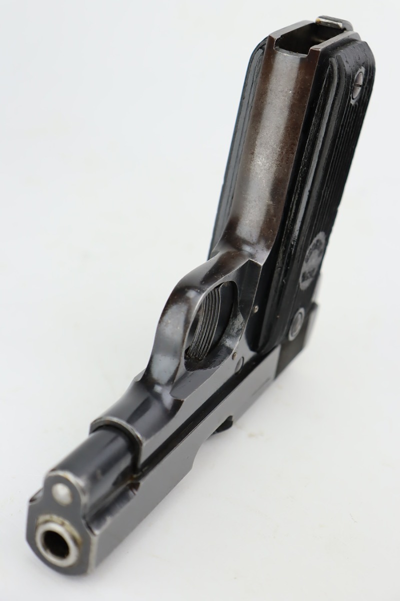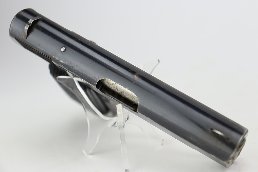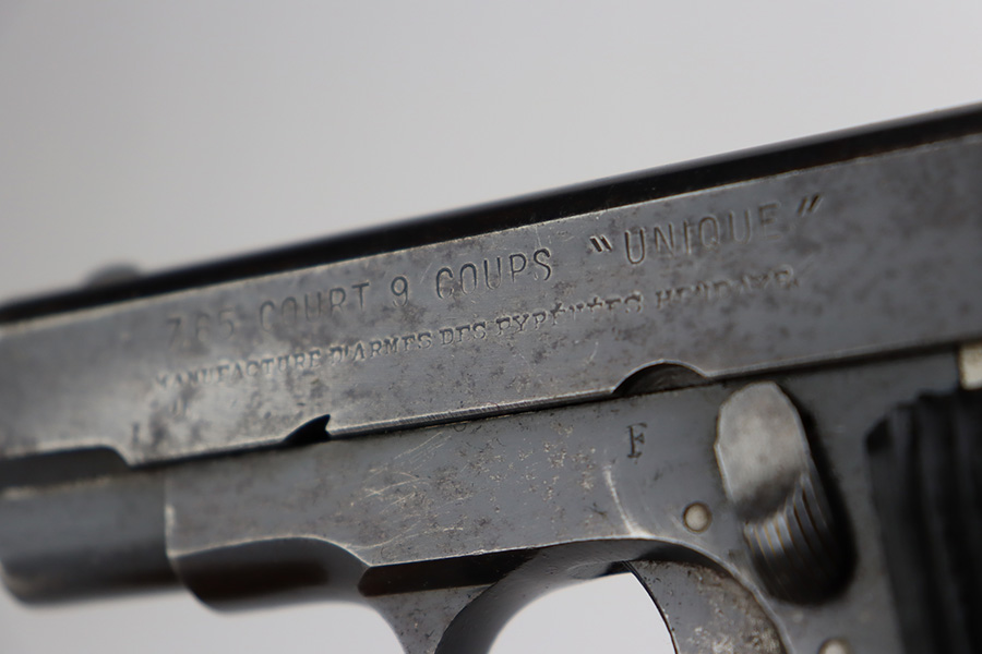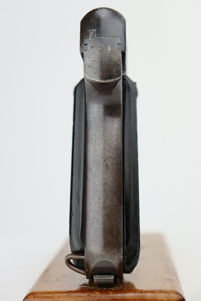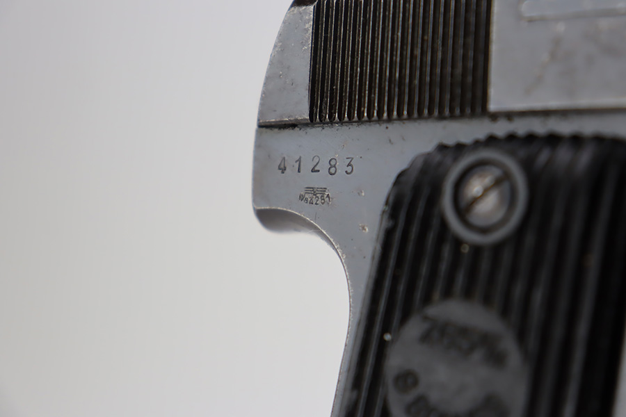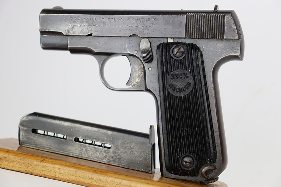 9/26/23 – This is a nice French Unique Model 17 issued to the Nazi military during WW2. It is all matching and has the proper “Waffen 251” acceptance proof. The bluing rates roughly 85% with thinning on the grip straps, an area of wear on the left side of the slide, and areas of light spotty discoloration and pin-pricking throughout. Some pitting on the left side of the trigger. Fitted with period-correct black bakelite grips and comes with one proper magazine. Mint bore.
