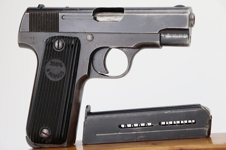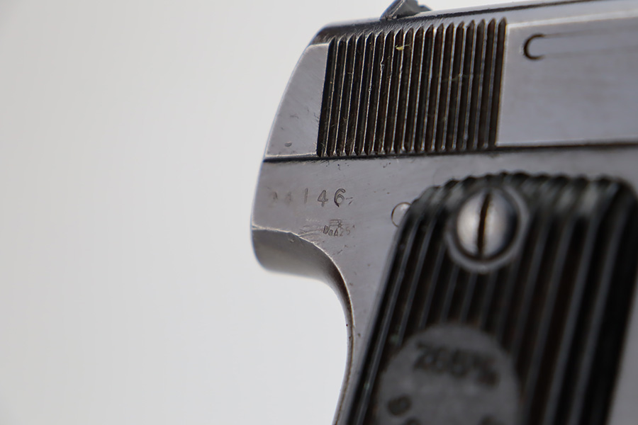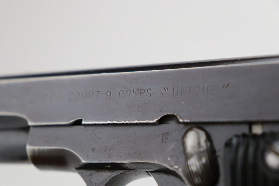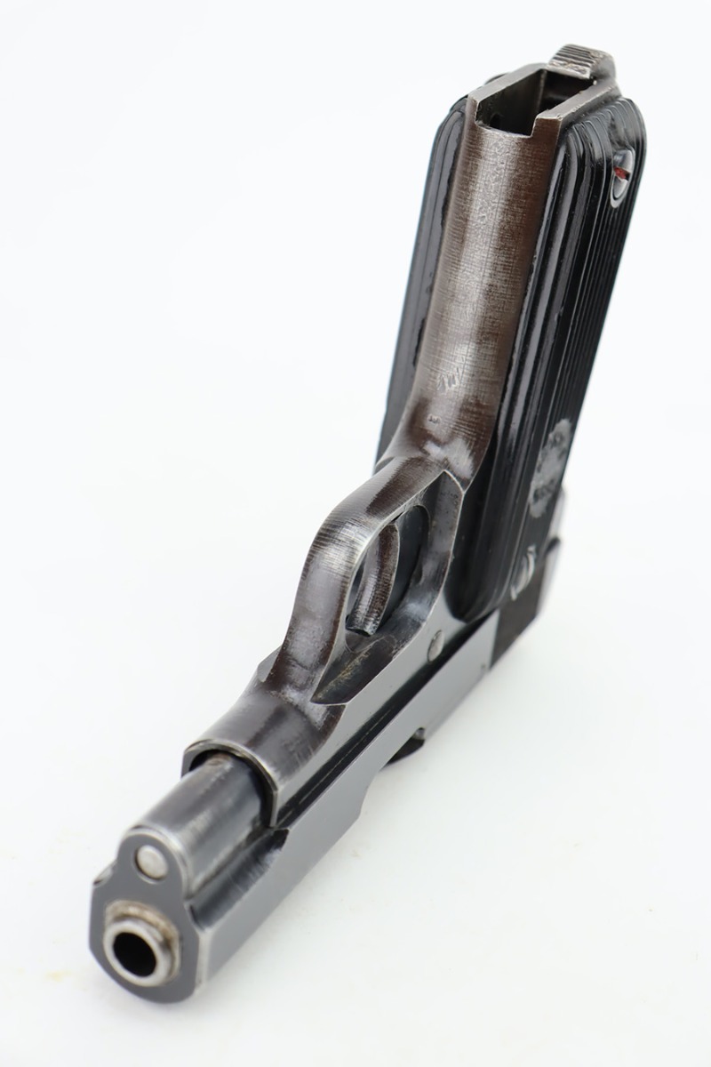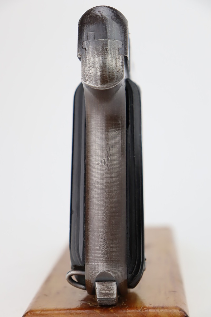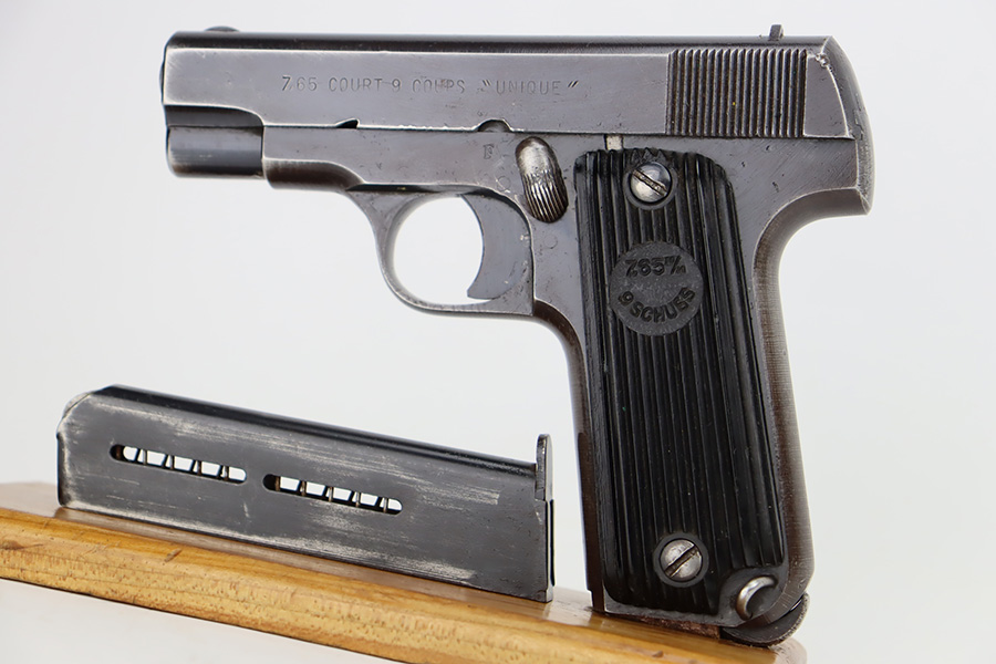 11/1/23 – This is a nice French Unique Model 17 issued to the Nazi military during WW2. It is all matching and has the proper “Waffen 251” acceptance proof. The bluing rates roughly 80% with thinning on the grip straps and general high edge wear. Fitted with period-correct black bakelite grips and comes with one proper magazine. Mint bore.