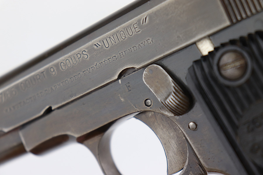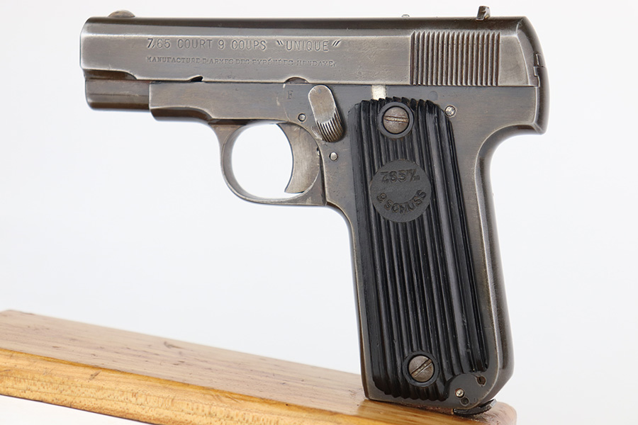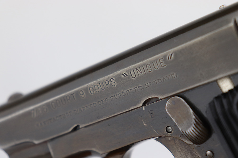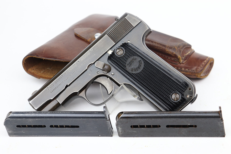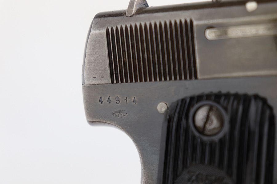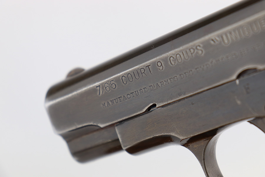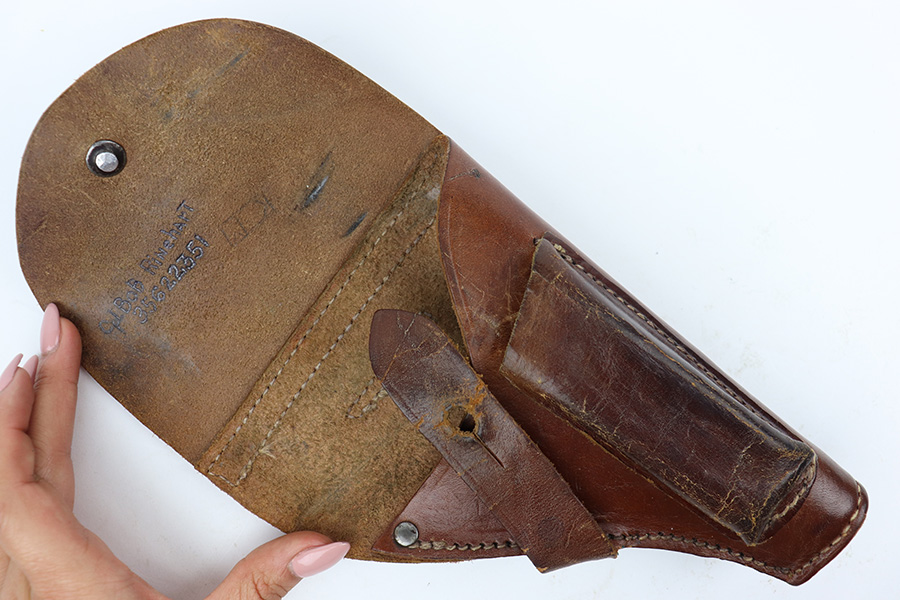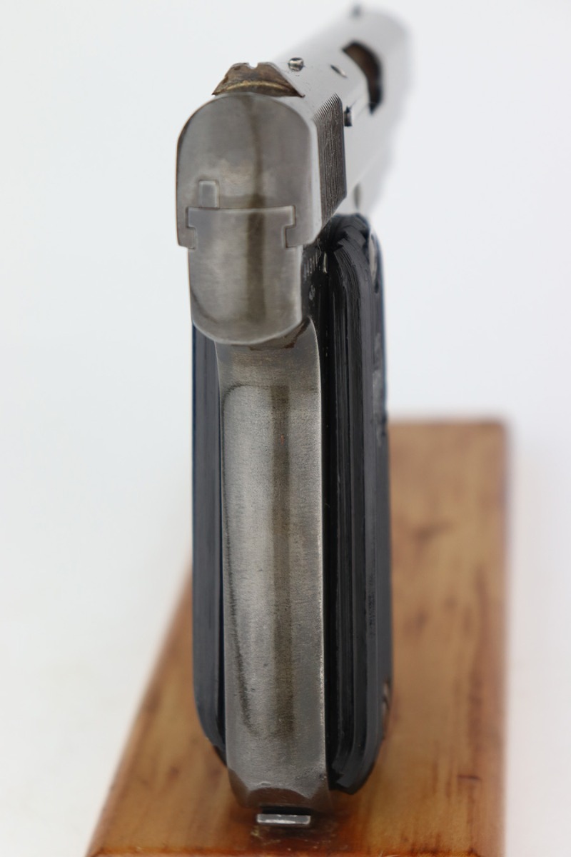 11/28/22 – This is a nice example of a French Unique Model 17 issued to the Nazi military during WW2. It is all matching and has the proper “Waffen 251” Nazi military acceptance proof on the right side of the frame. It comes as a rig with a rare “Waffen D20” proofed holster and two proper magazines. The inside of the holster has the capturing GI’s name and ID number. The gun itself has retained about 60% of its original finish with fairly even wear and light brown patina throughout. General high edge wear as well. Comes with nice period-correct black bakelite grips. Minty bore.