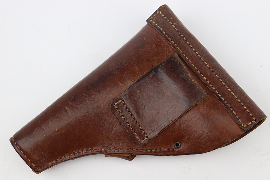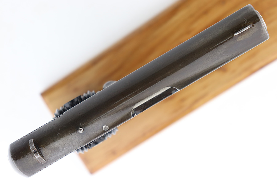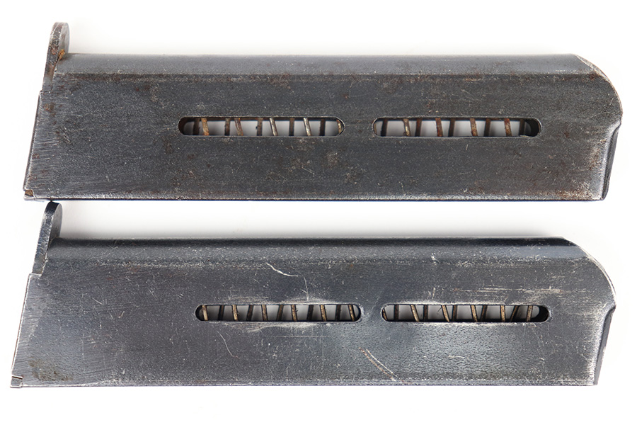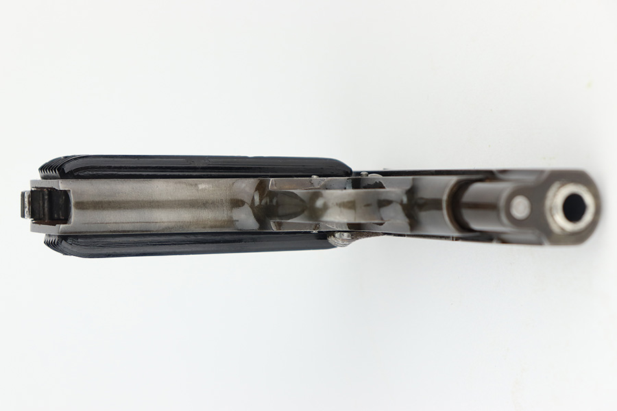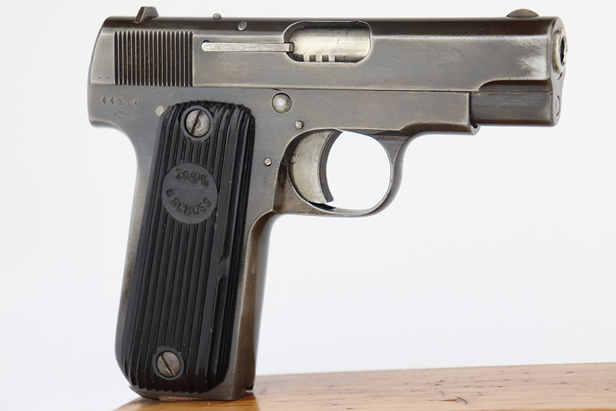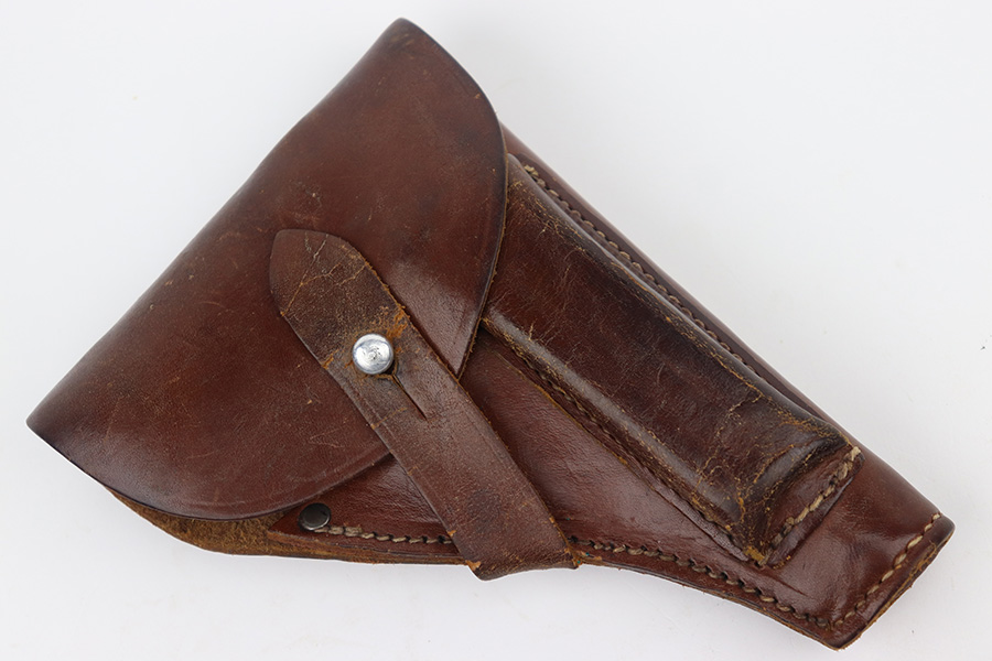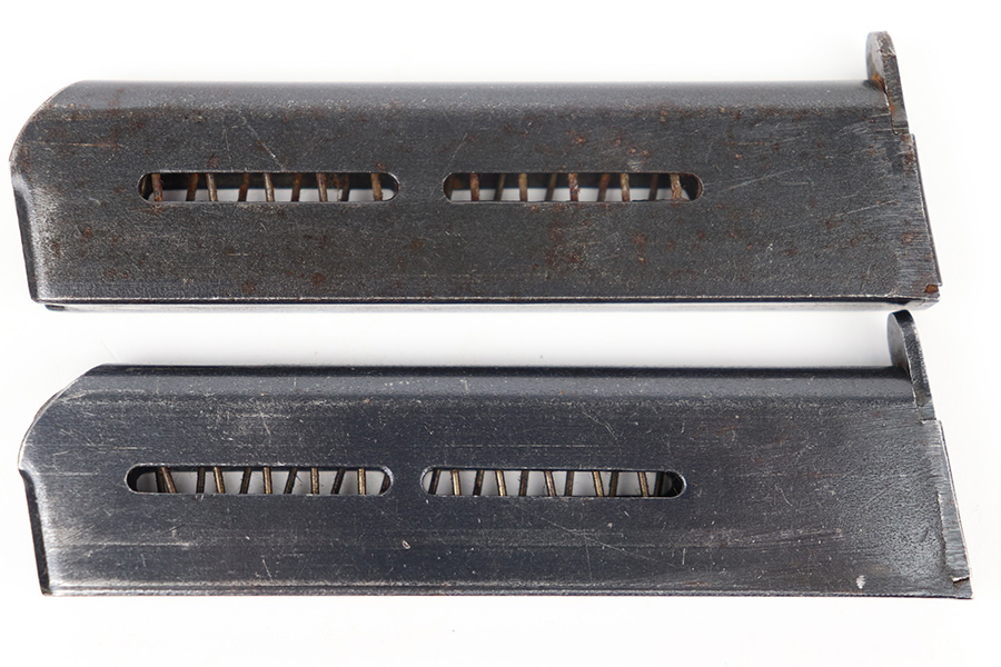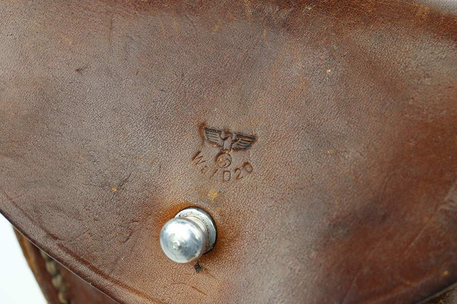 11/28/22 – This is a nice example of a French Unique Model 17 issued to the Nazi military during WW2. It is all matching and has the proper “Waffen 251” Nazi military acceptance proof on the right side of the frame. It comes as a rig with a rare “Waffen D20” proofed holster and two proper magazines. The inside of the holster has the capturing GI’s name and ID number. The gun itself has retained about 60% of its original finish with fairly even wear and light brown patina throughout. General high edge wear as well. Comes with nice period-correct black bakelite grips. Minty bore.