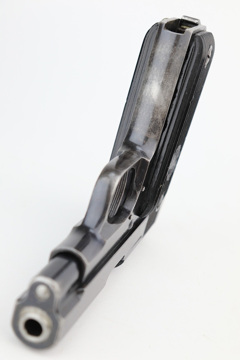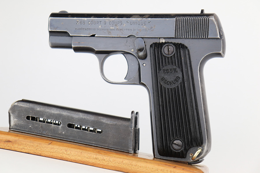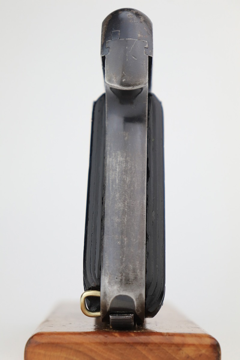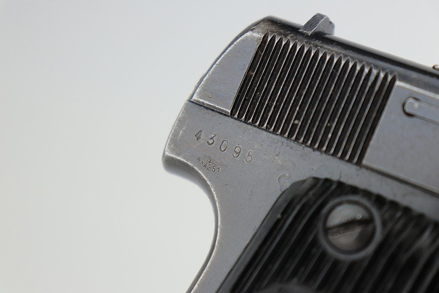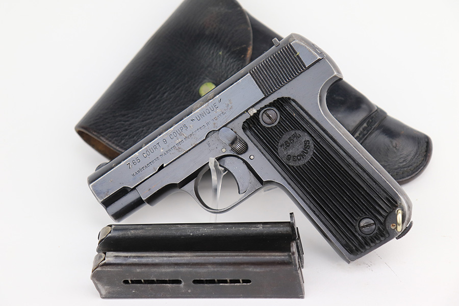 3/31/23 – This is a nice example of a French Unique Model 17 issued into the Nazi military during WW2. It is all matching, with the proper “Waffen 251” Nazi military acceptance proof on the right side of the tang. It comes as a rig, with a generic black leather holster and two period-correct magazines. It has retained roughly 80% of its original finish, with the majority of the finish loss being from the grips straps. There is also some splotchy discoloration on the left side of slide. There is a number very lightly scratched onto the left side of trigger. Fitted with nice period-correct grips. Mint bore