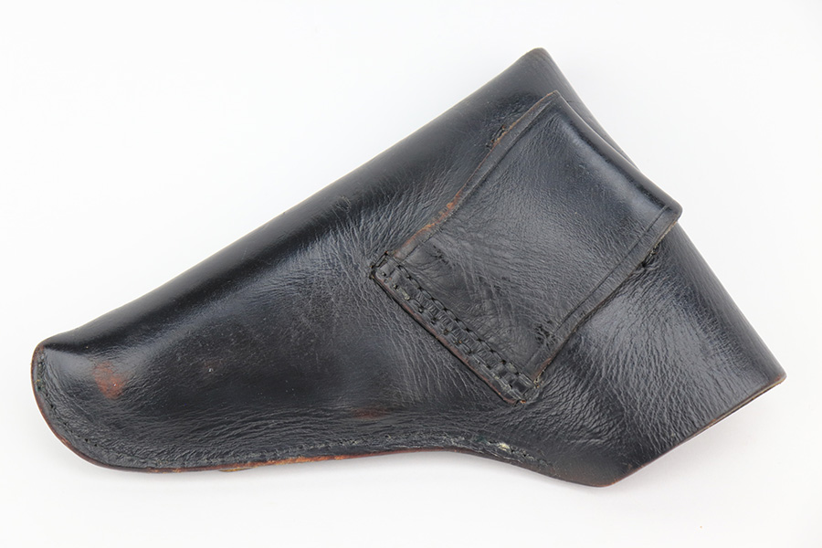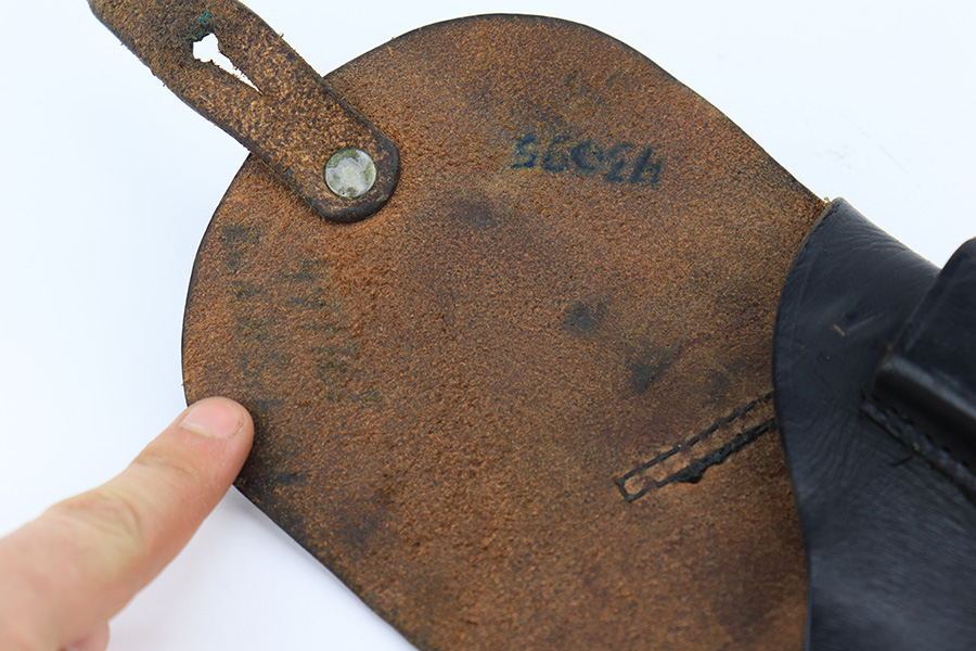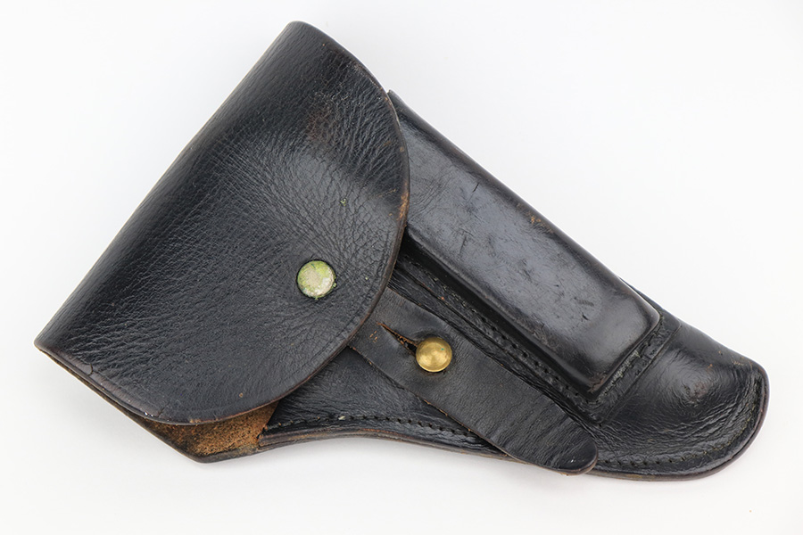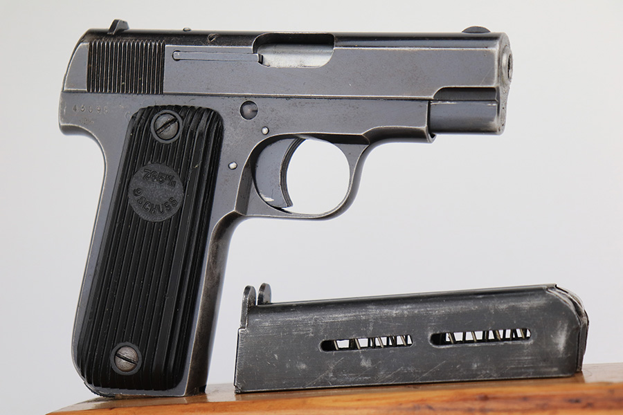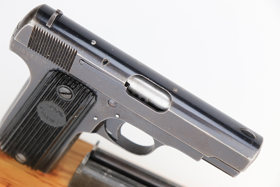 3/31/23 – This is a nice example of a French Unique Model 17 issued into the Nazi military during WW2. It is all matching, with the proper “Waffen 251” Nazi military acceptance proof on the right side of the tang. It comes as a rig, with a generic black leather holster and two period-correct magazines. It has retained roughly 80% of its original finish, with the majority of the finish loss being from the grips straps. There is also some splotchy discoloration on the left side of slide. There is a number very lightly scratched onto the left side of trigger. Fitted with nice period-correct grips. Mint bore