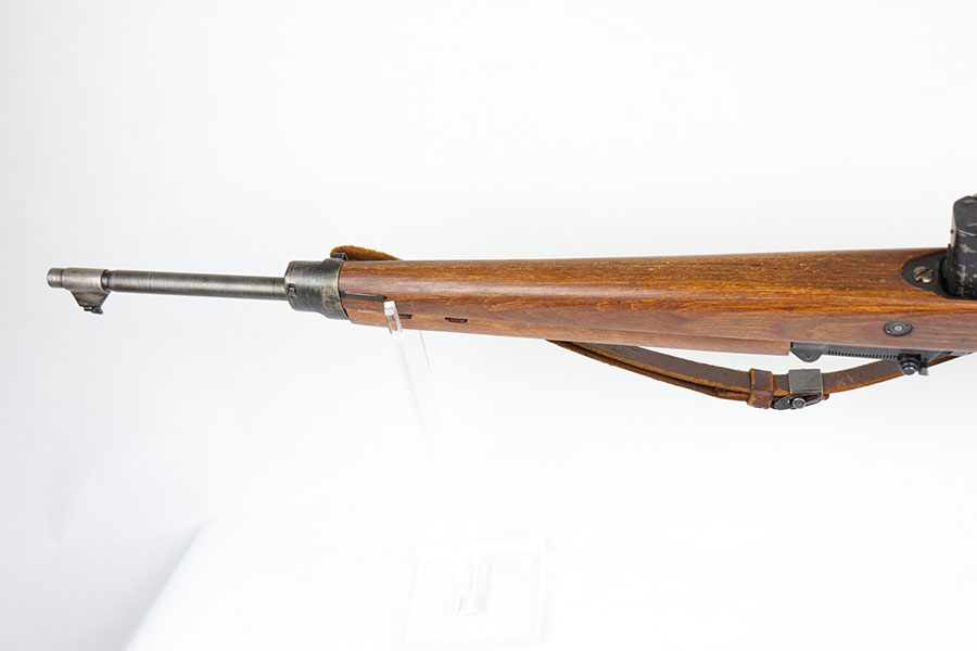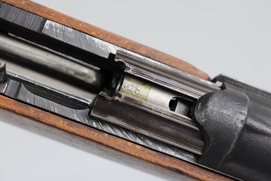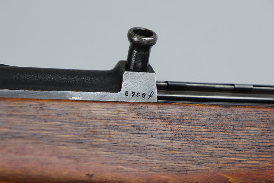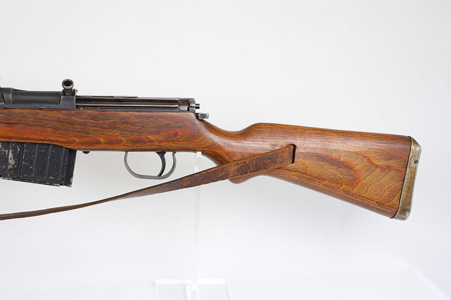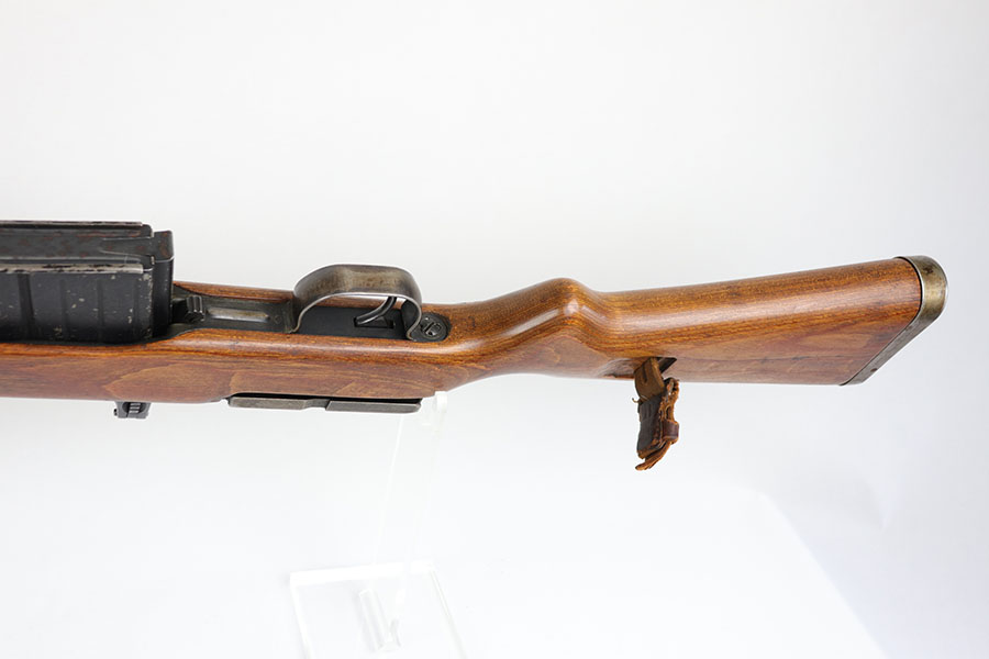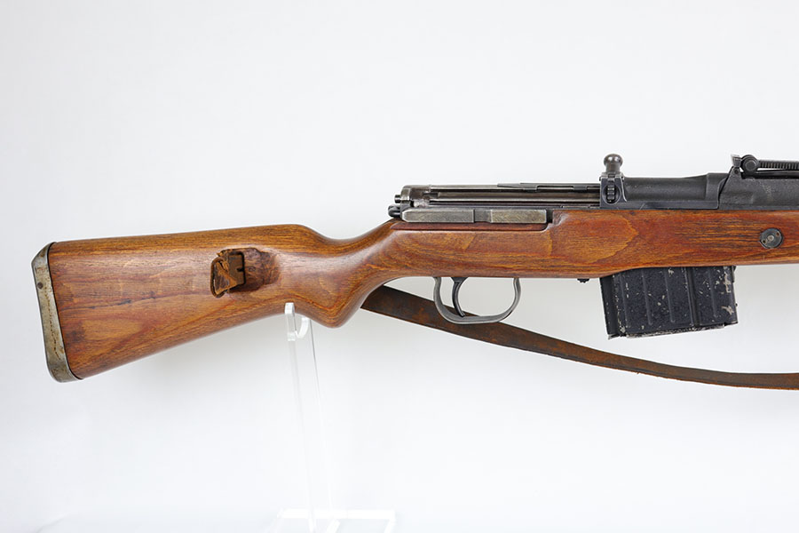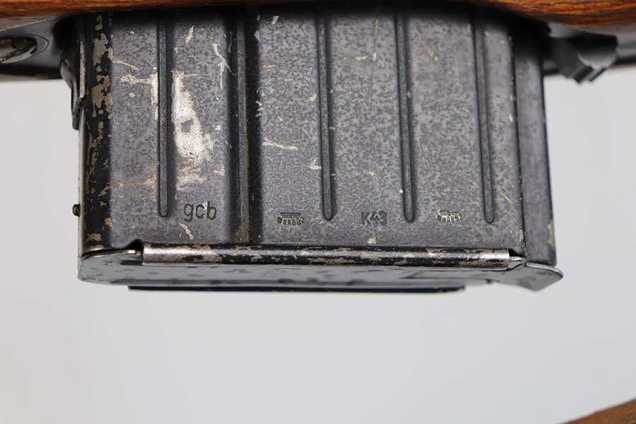 6/17/20 – This is a nice example of a scarce Nazi G.43 rifle as produced in 1944 at the Berlin Lubecker factory. All numbered parts are matching, but the handguard has been replaced and the stock was sanded so the serial is not completely legible. It does appear to show the middle two digits of the receiver (70) serial but blurs at the edges, which is common when these stocks are sanded. The metal parts show original blue that is fairly clean but has general thinning, and the wear is most pronounced around the muzzle and front sight band. Original magazine with ‘gcb’ maker mark. Original sling, too. Bore is very shiny with strong rifling but there is some freckling in the grooves.