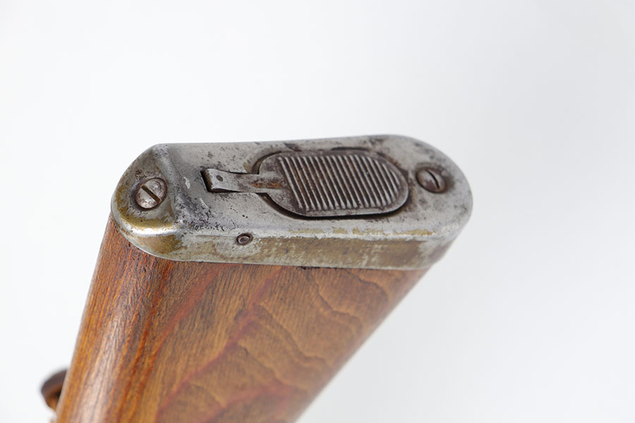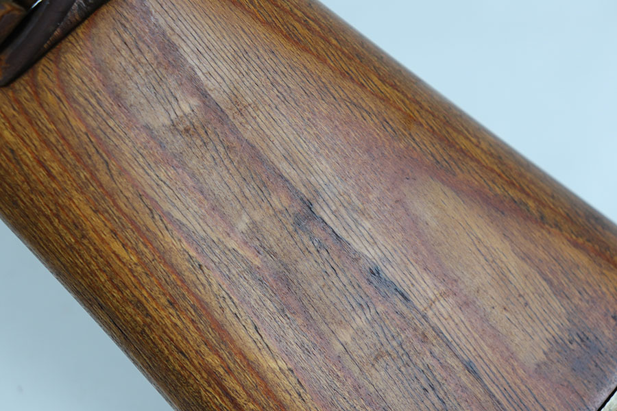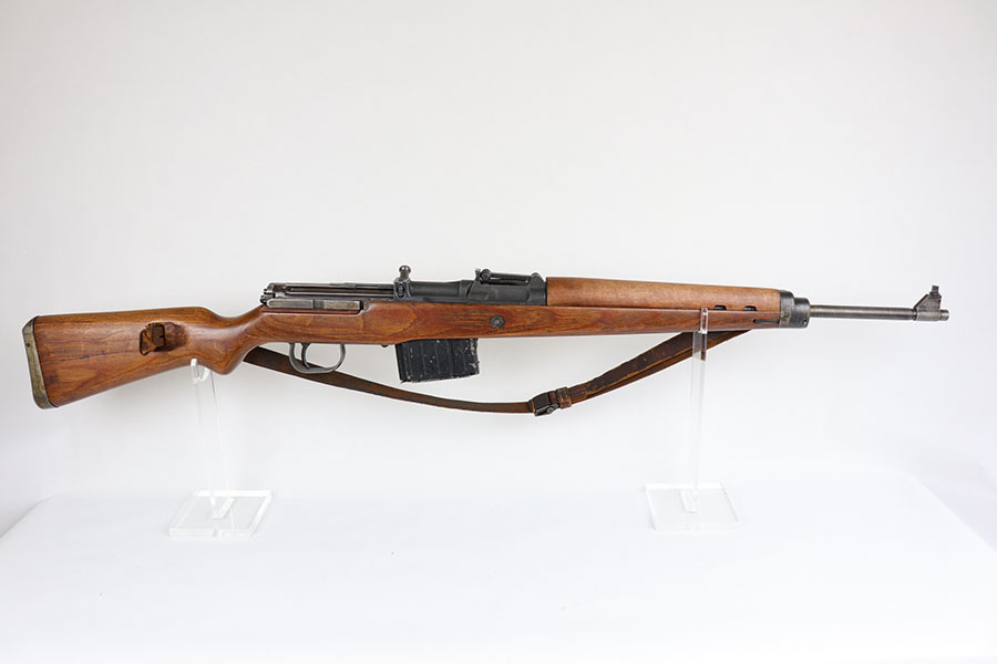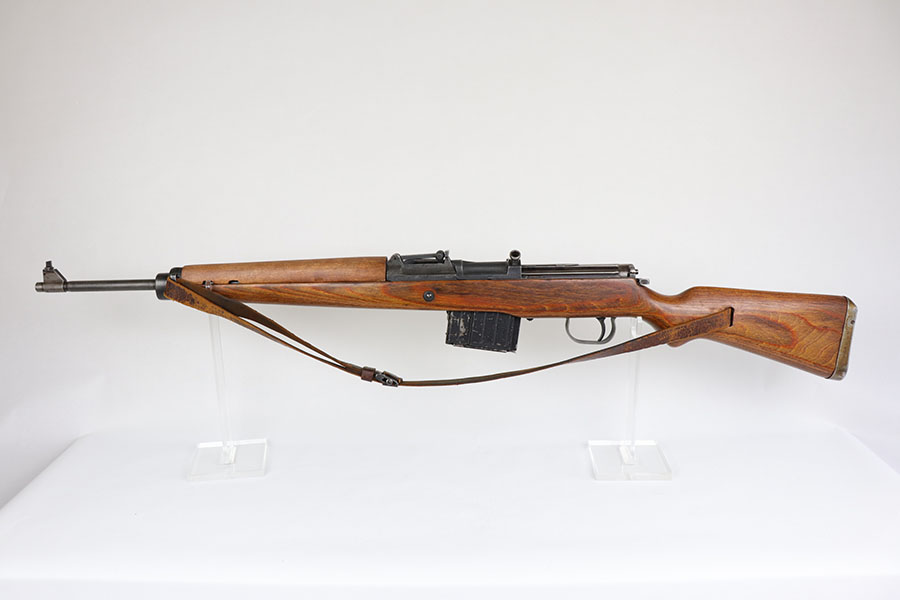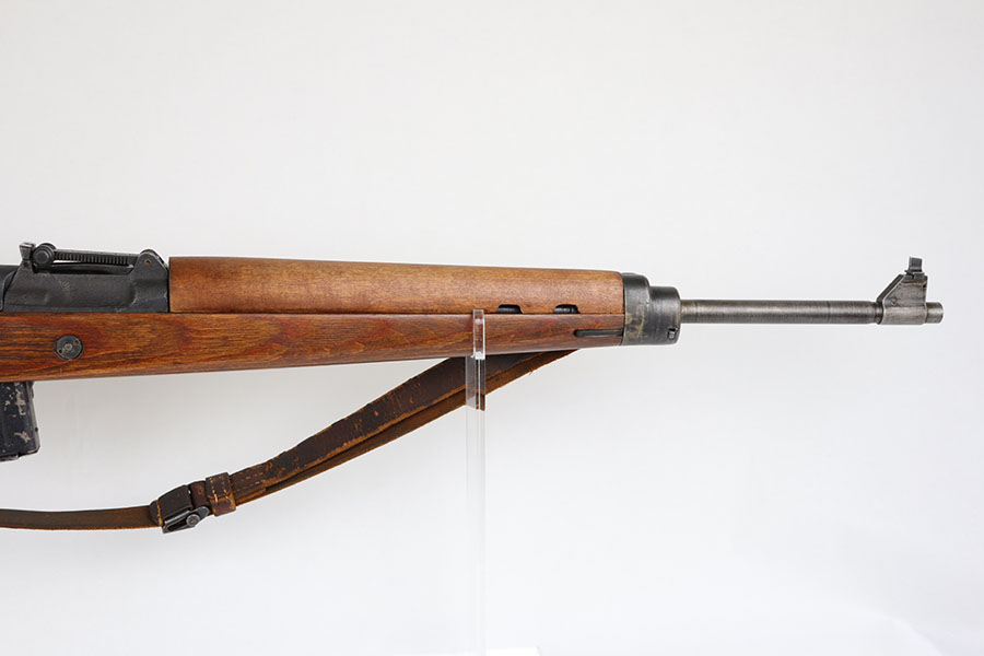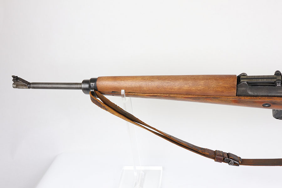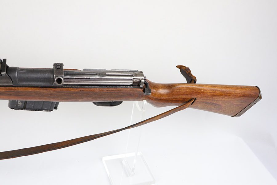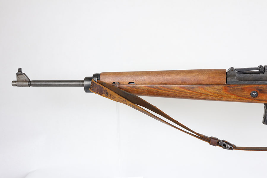 6/17/20 – This is a nice example of a scarce Nazi G.43 rifle as produced in 1944 at the Berlin Lubecker factory. All numbered parts are matching, but the handguard has been replaced and the stock was sanded so the serial is not completely legible. It does appear to show the middle two digits of the receiver (70) serial but blurs at the edges, which is common when these stocks are sanded. The metal parts show original blue that is fairly clean but has general thinning, and the wear is most pronounced around the muzzle and front sight band. Original magazine with ‘gcb’ maker mark. Original sling, too. Bore is very shiny with strong rifling but there is some freckling in the grooves.