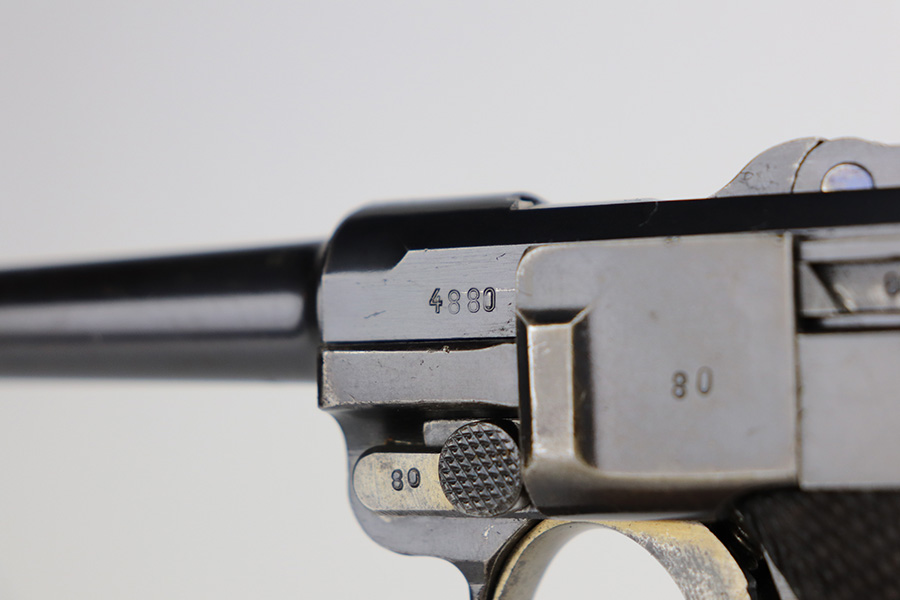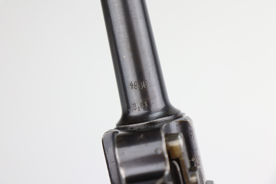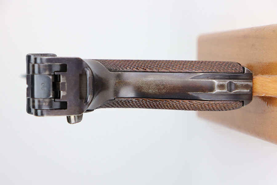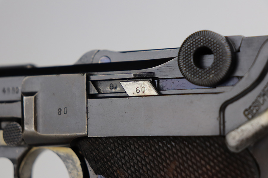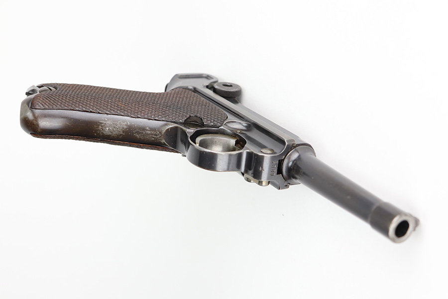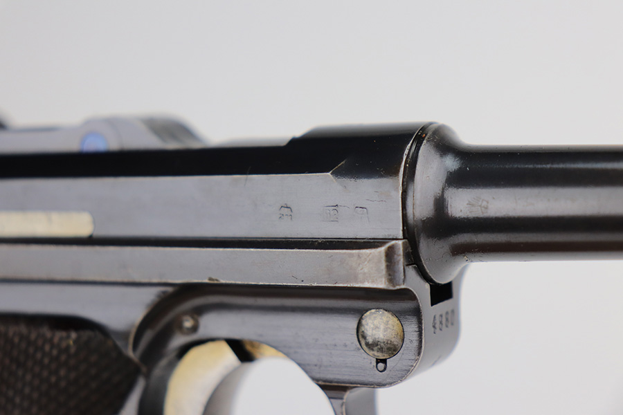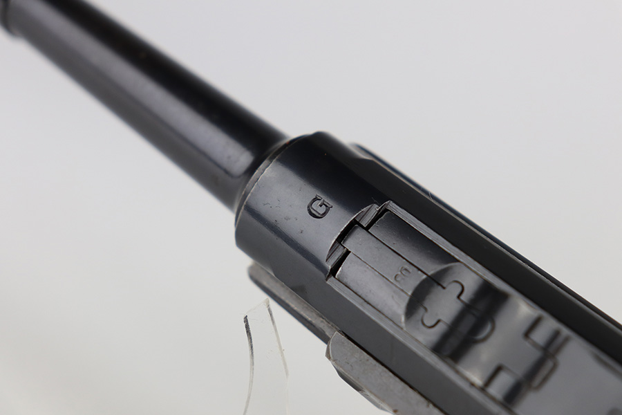5/3/21 – This is a very nice example of a “G Date” Mauser Luger issued to the Nazi military in 1935. This one is all matching and has the proper “G Date” military proofs. The gun has retained somewhere between 85-90% of its original finish. There is spotty wear and some light dings on the straps. Minor wear on the side plate, around the muzzle, and on the front edges of the frame. Comes with nice un-numbered grips and a mismatched period-correct magazine. The grips have minor bruising throughout. The bore has good rifling with pin-pricking throughout.