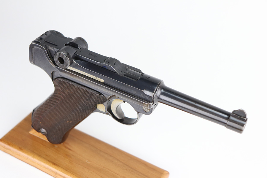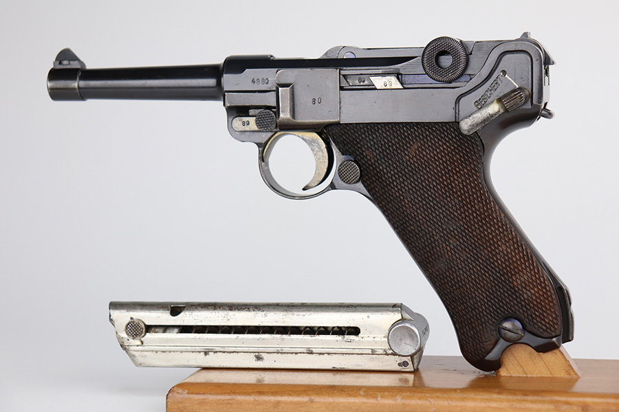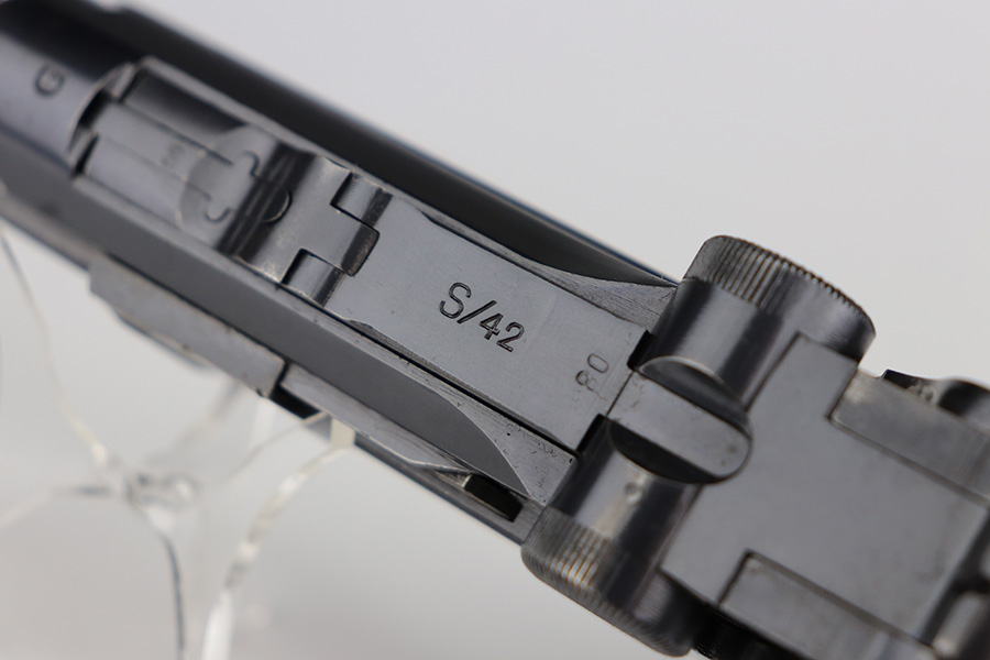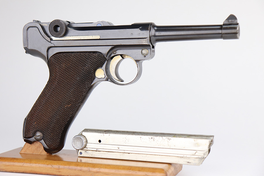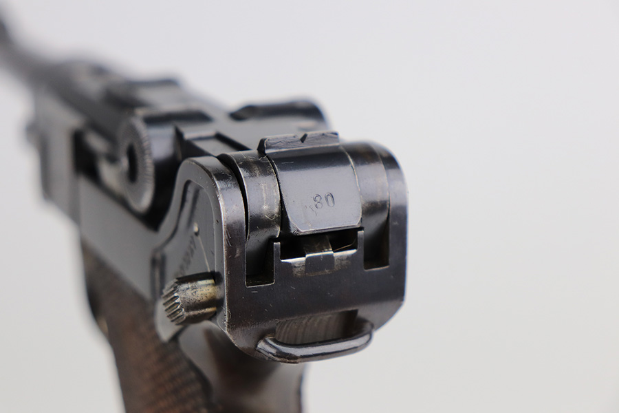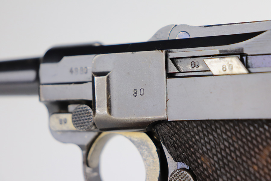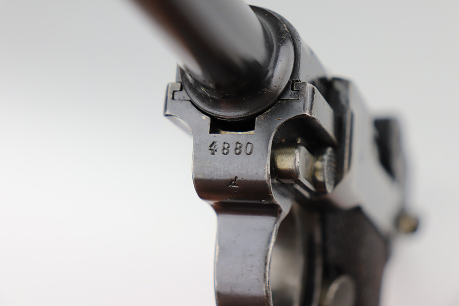 5/3/21 – This is a very nice example of a “G Date” Mauser Luger issued to the Nazi military in 1935. This one is all matching and has the proper “G Date” military proofs. The gun has retained somewhere between 85-90% of its original finish. There is spotty wear and some light dings on the straps. Minor wear on the side plate, around the muzzle, and on the front edges of the frame. Comes with nice un-numbered grips and a mismatched period-correct magazine. The grips have minor bruising throughout. The bore has good rifling with pin-pricking throughout.
