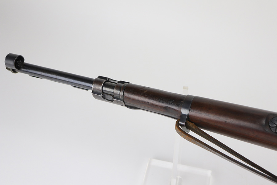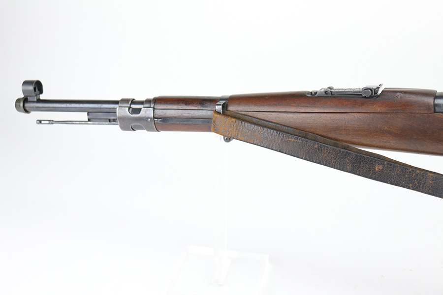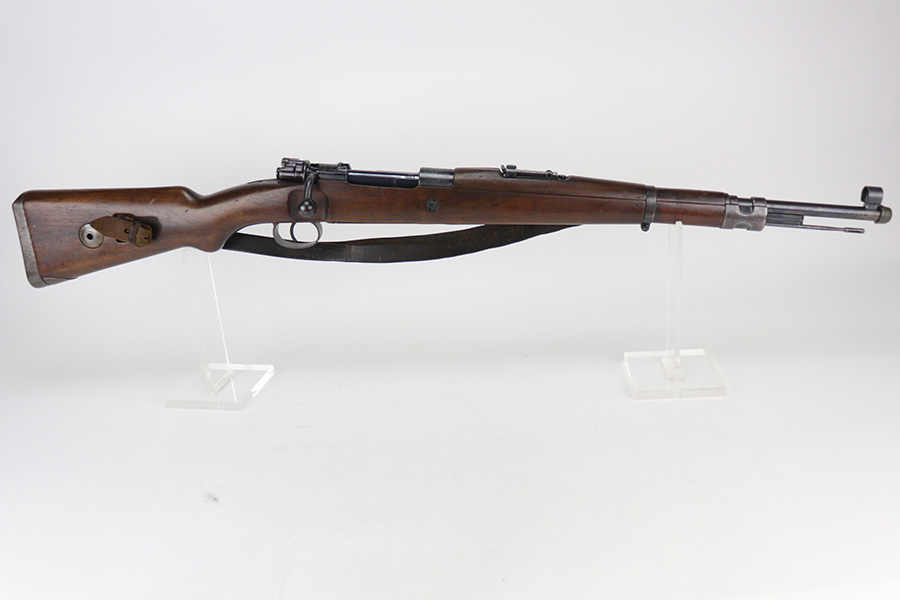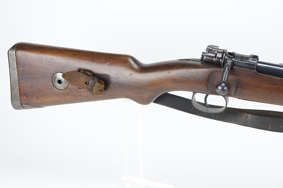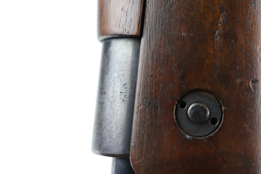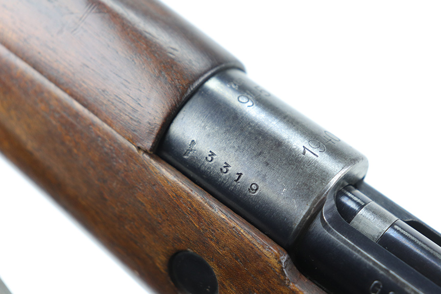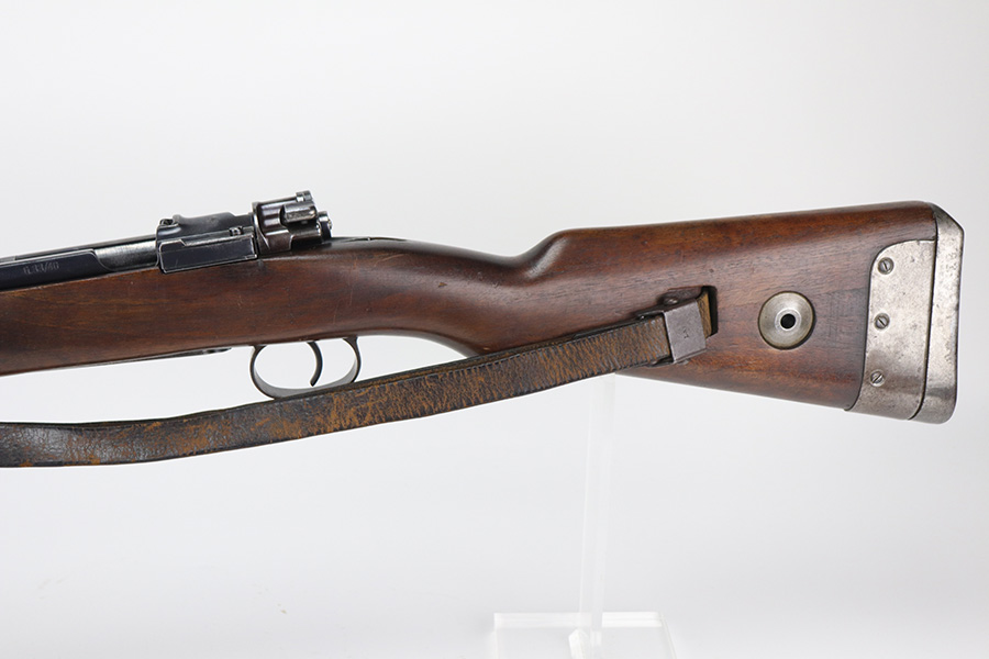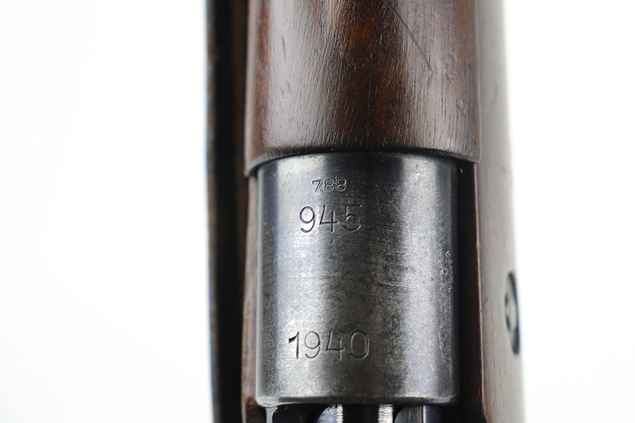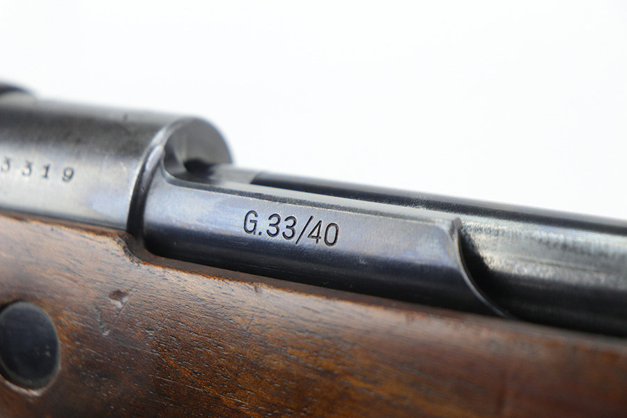 10/27/21 – This is a rare German G33/40 Mountain carbine from World War II. They were only built at the Brno factory in Czechoslovakia and they are patterned after the Czech VZ 33. This is anearly example that was made in 1940 and has 945 factory code on receiver. Many of the G 33/40 carbines were issued to the German “Gebirgstruppen”, or Mountain Infantry, where the metal plate on the left side of the butt was used to keep the stock from harm while using the rifle for assistance in climbing. Everything is correct and matching on the rifle, but the stock was lightly sanded at some point.  Serial number and waffenamt on wrist are still visible but they are faint.  The bluing on the metal parts is all original but shows some thinning on trigger group and top of receiver. All numbered parts are matching. Excellent, shiny bore. Comes with cleaning rod, sling and sight hood.