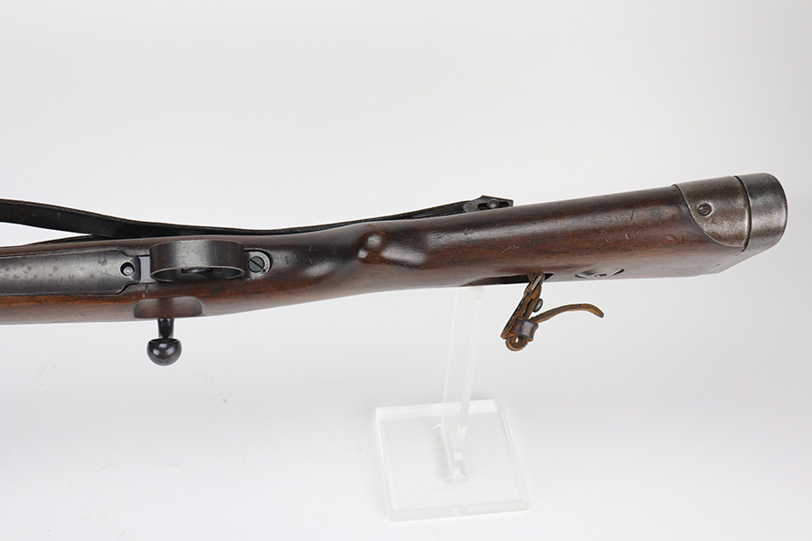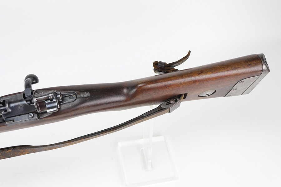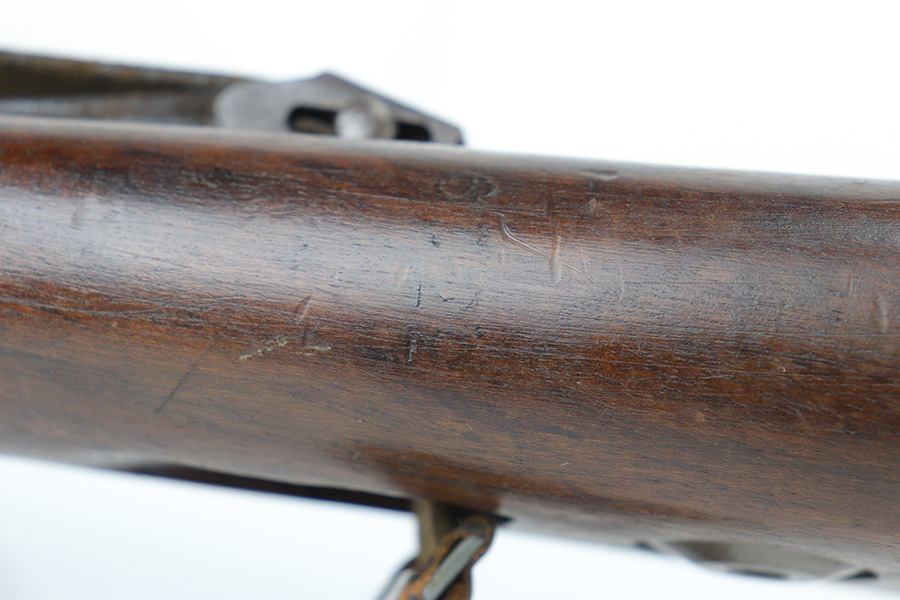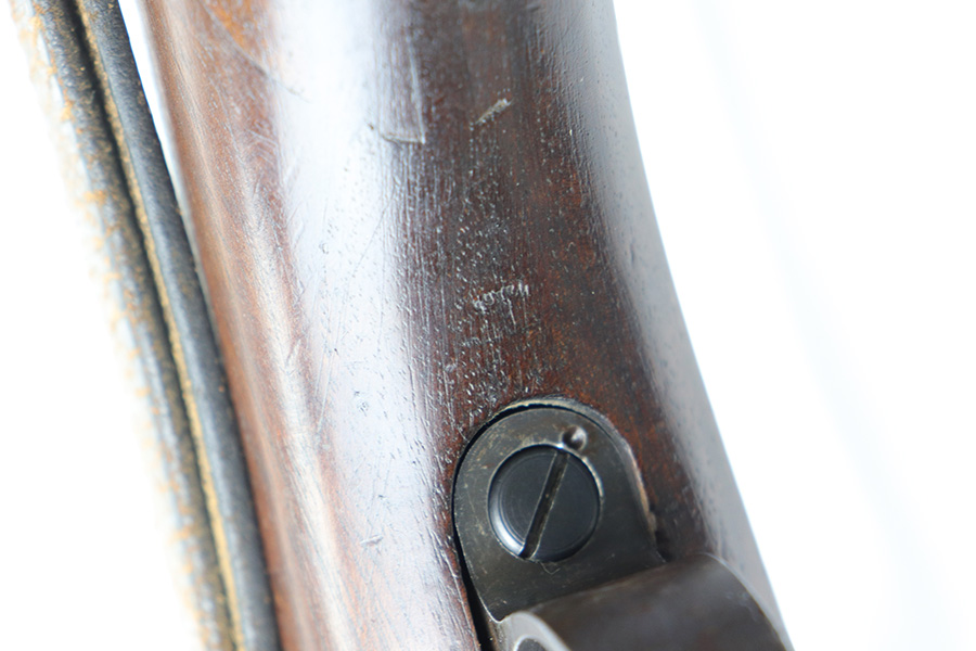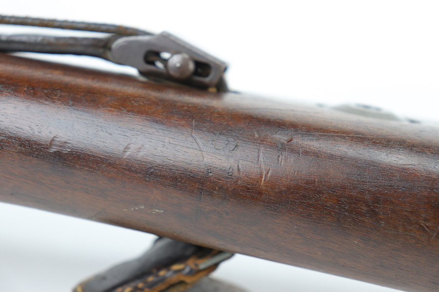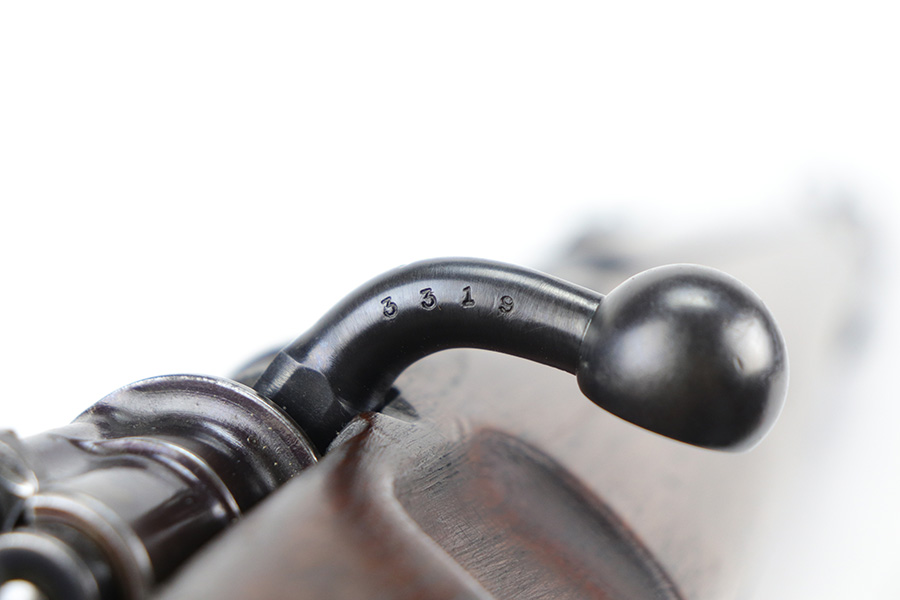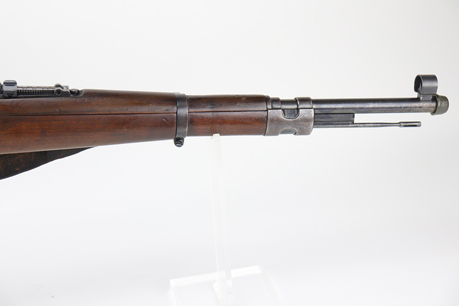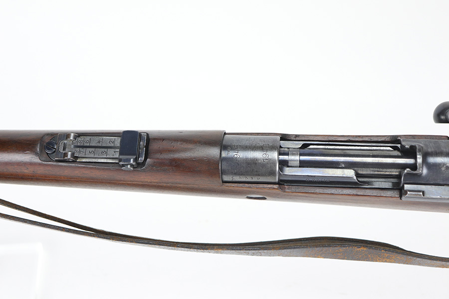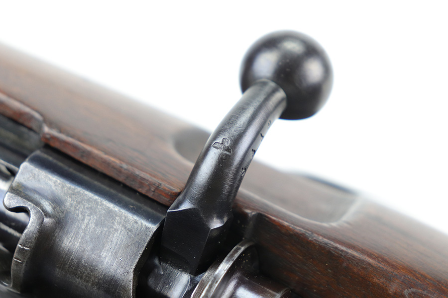 10/27/21 – This is a rare German G33/40 Mountain carbine from World War II. They were only built at the Brno factory in Czechoslovakia and they are patterned after the Czech VZ 33. This is anearly example that was made in 1940 and has 945 factory code on receiver. Many of the G 33/40 carbines were issued to the German “Gebirgstruppen”, or Mountain Infantry, where the metal plate on the left side of the butt was used to keep the stock from harm while using the rifle for assistance in climbing. Everything is correct and matching on the rifle, but the stock was lightly sanded at some point.  Serial number and waffenamt on wrist are still visible but they are faint.  The bluing on the metal parts is all original but shows some thinning on trigger group and top of receiver. All numbered parts are matching. Excellent, shiny bore. Comes with cleaning rod, sling and sight hood.