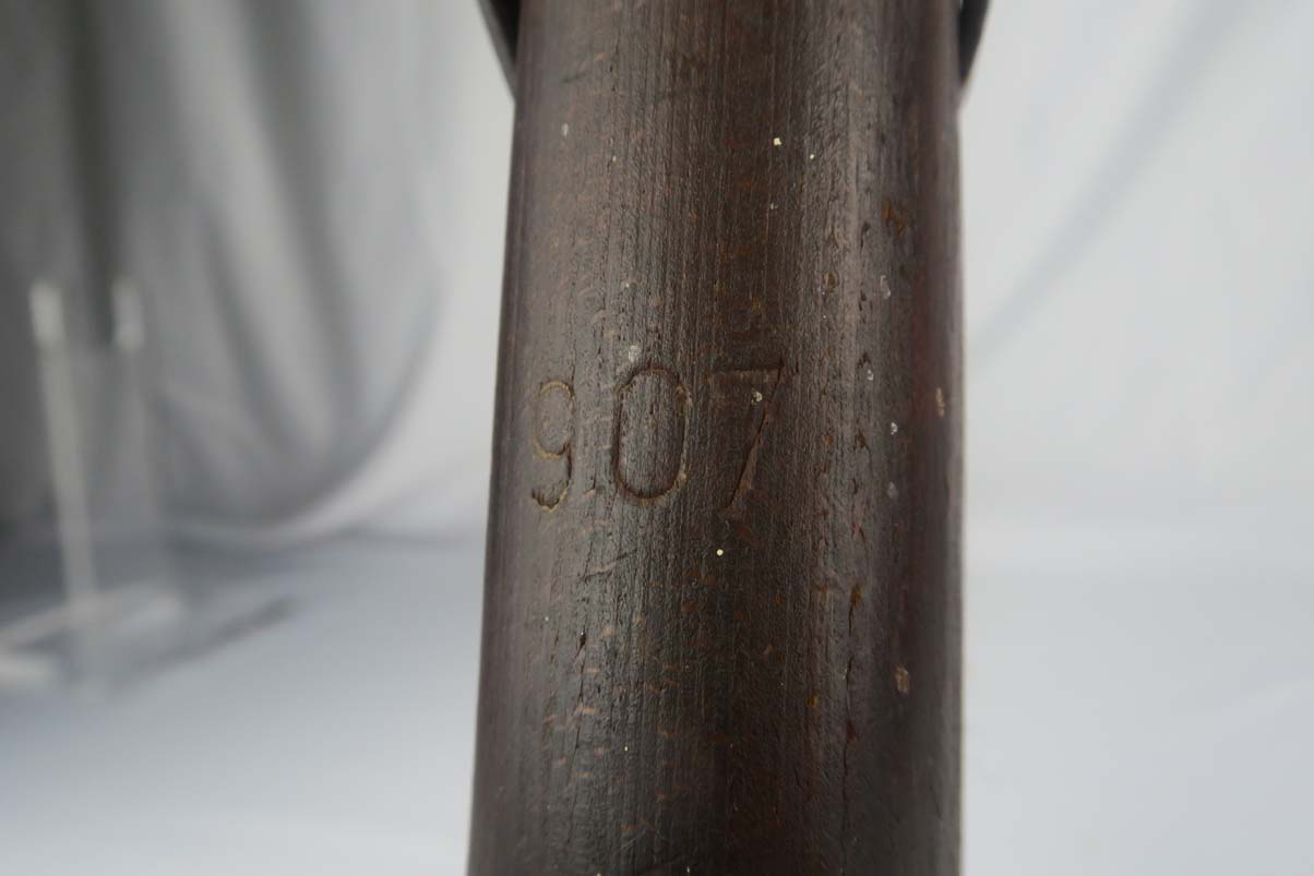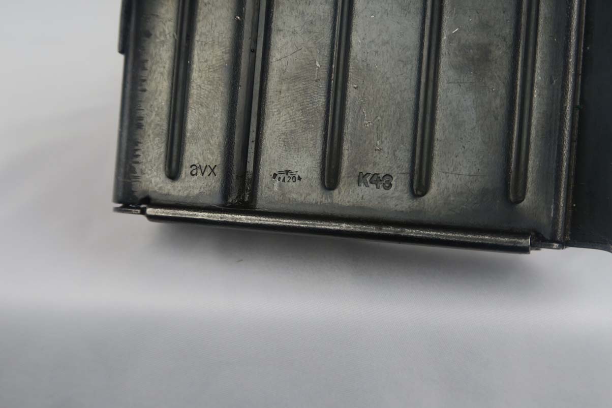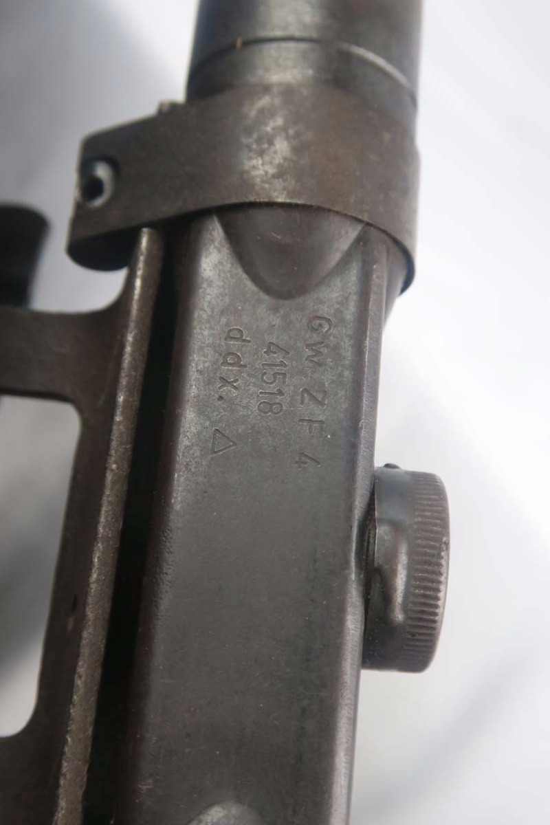 6/28/17 – This is a Walther G43 sniper rifle, marked ac 44 on the receiver.  All visible numbered parts are matching, including the stock.  The rifle appears to be all original and correct, with multiple proper waffen proofs on the stock, receiver and scope mount.  Rifle has proper cleaning rod and site hood present.  Front of muzzle is threaded.  Original magazine is K43 marked with maker AVX and WaA204 markings on left side.  The mount is original and has Walther WaA359 proofs.  Scope is WW2 original, with decent optics.  Marked GW  ZF 4, then ddx.  Lens cap covers included.   The stock does have some dings and chips in it but no major cracks.  The bore has strong rifling but could use a good cleaning.  There may be some freckling but it should still shoot great.