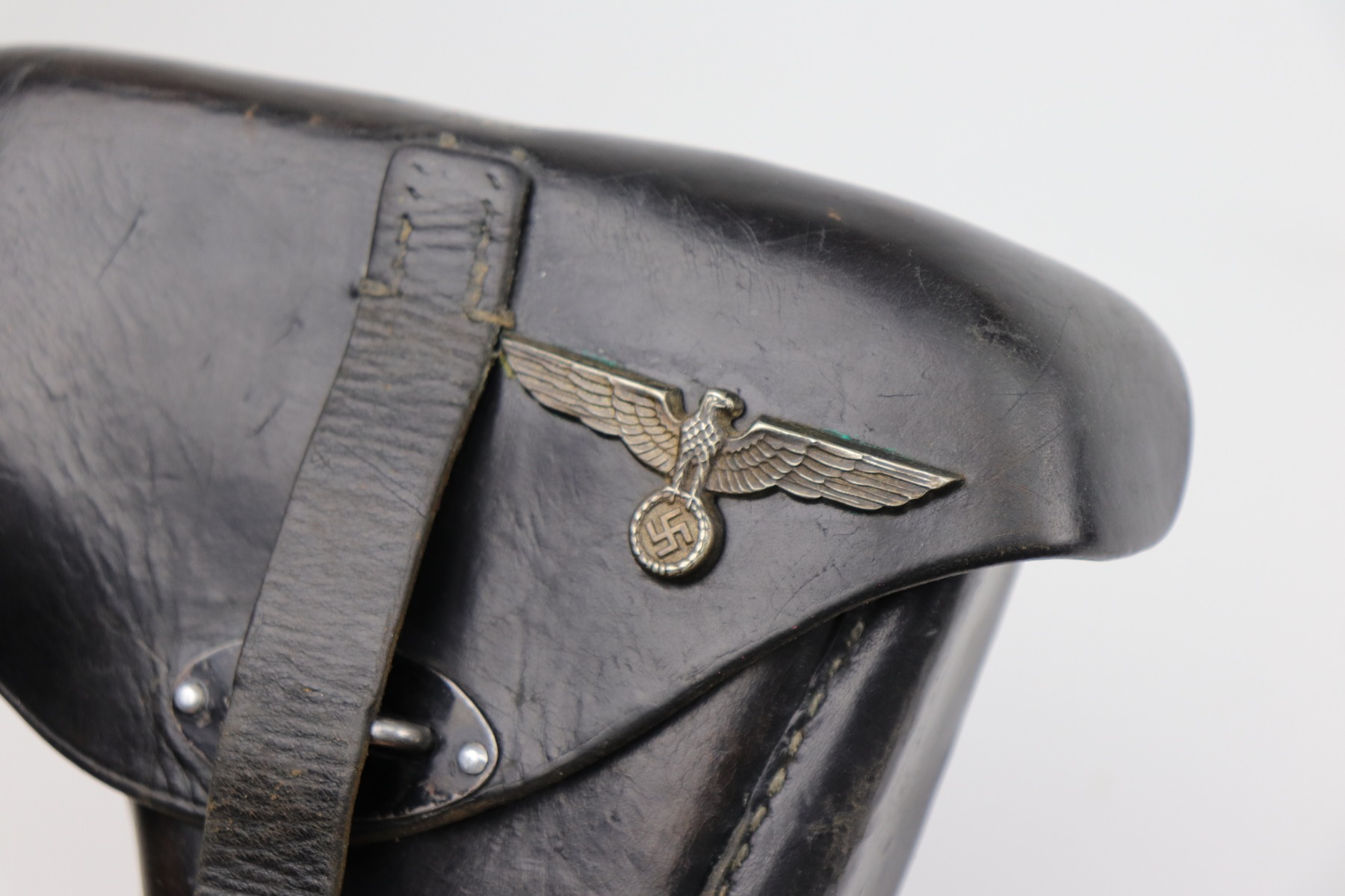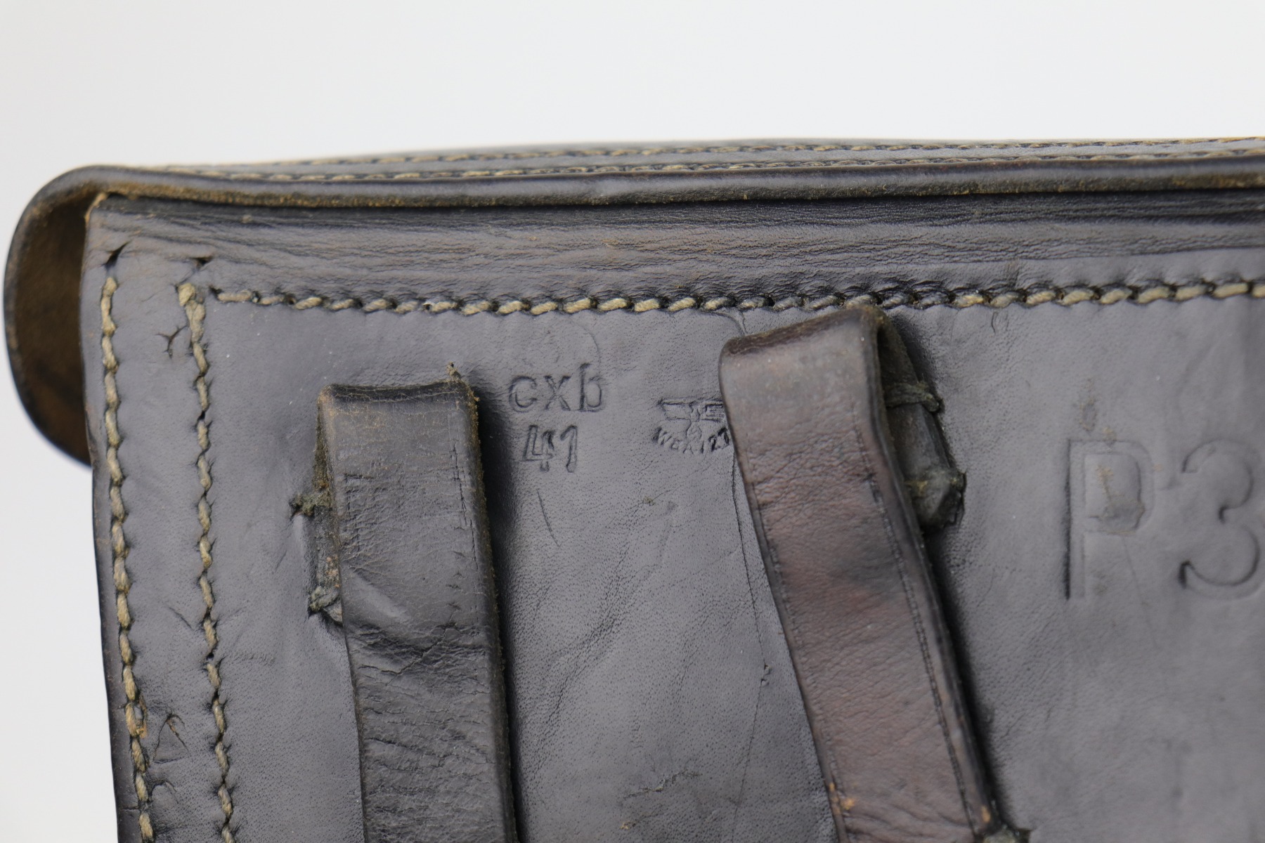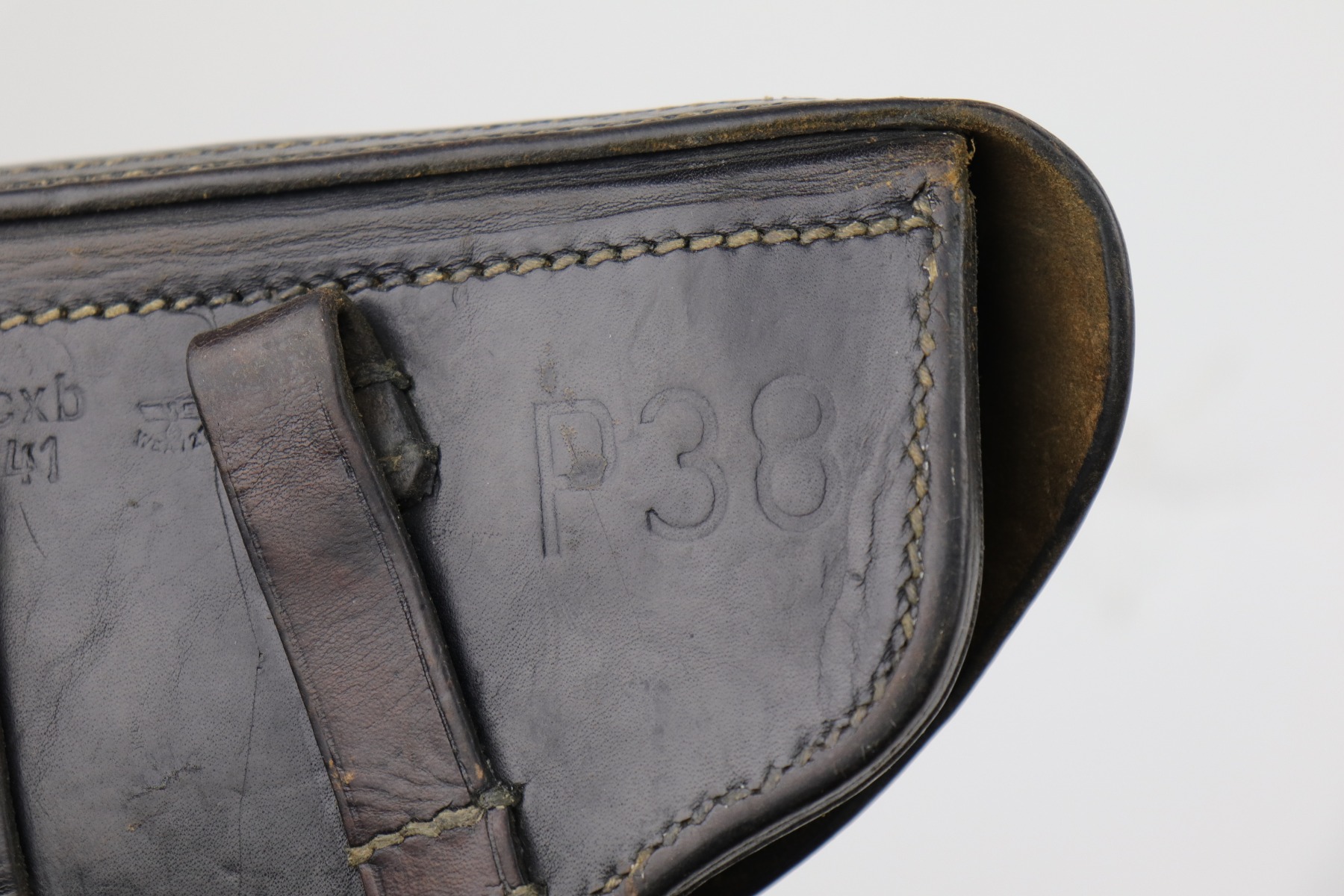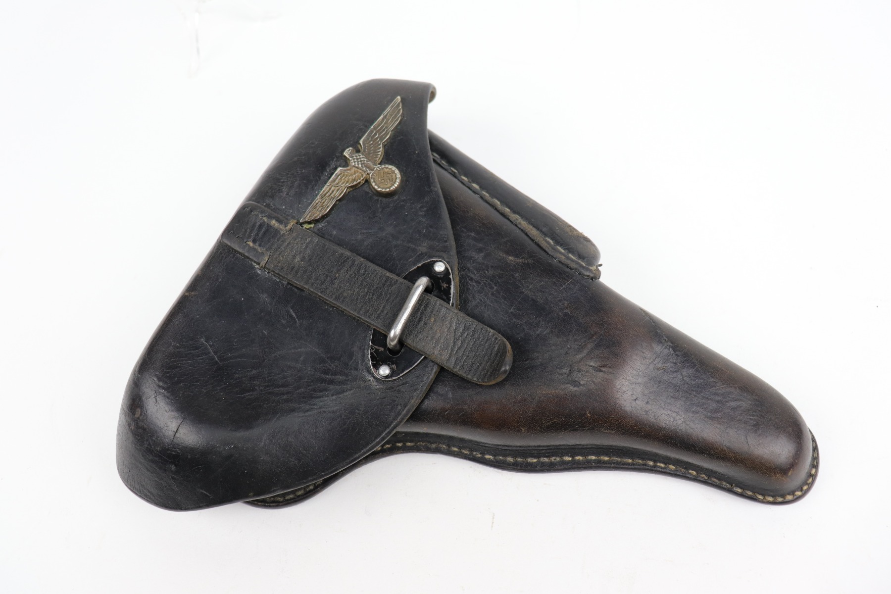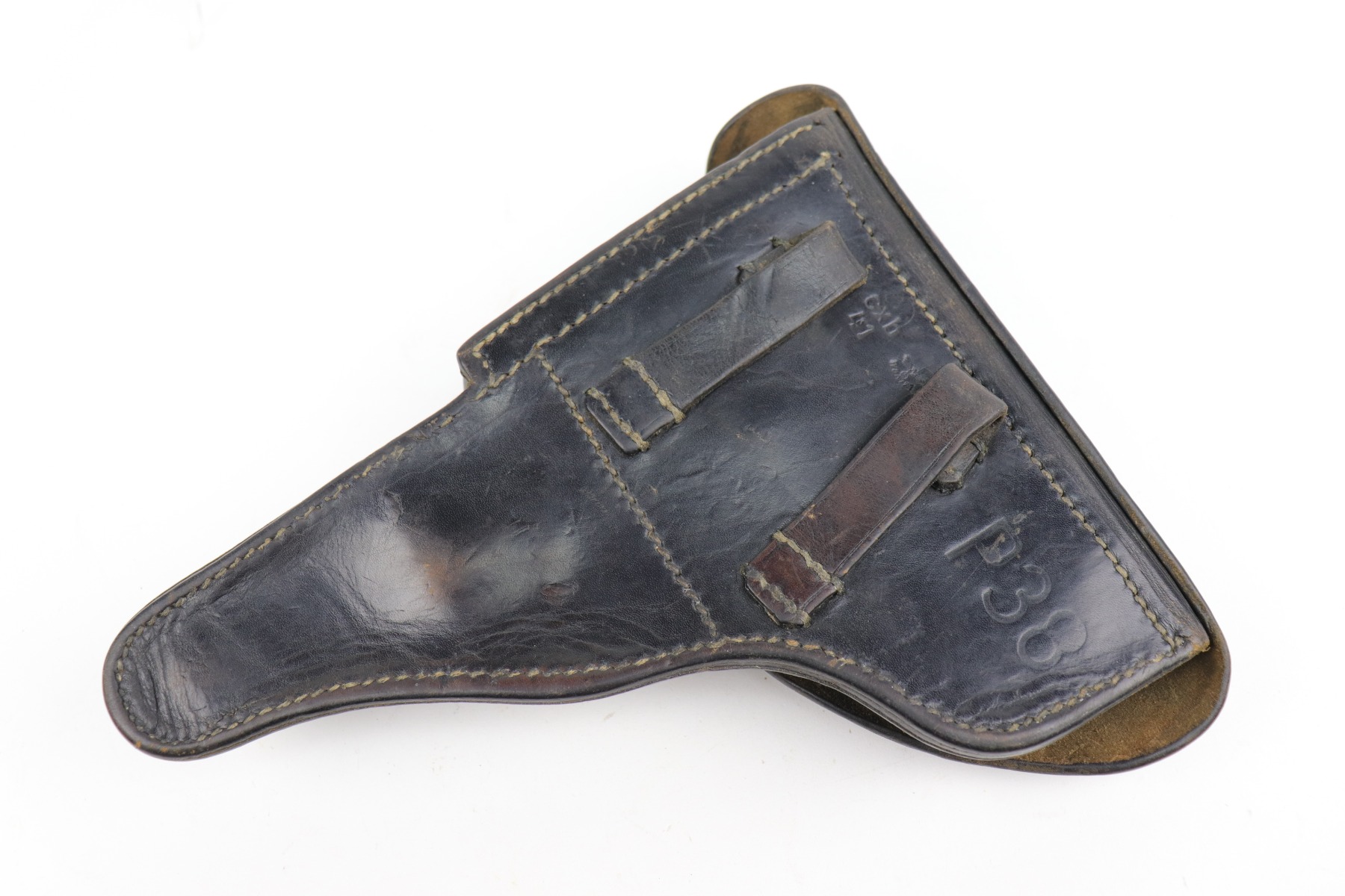 11/21/20 – This is a nice hardshell P.38 holster dated 1941. The leather is soft and pliable, and the stitching is mostly intact. There is an original Nazi eagle – likely a hat ornament that is added to the top flap. This was often done by the GIs to embellish their souvenirs. Closure strap and lift up strap are good. Waffen stamped on reverse side.