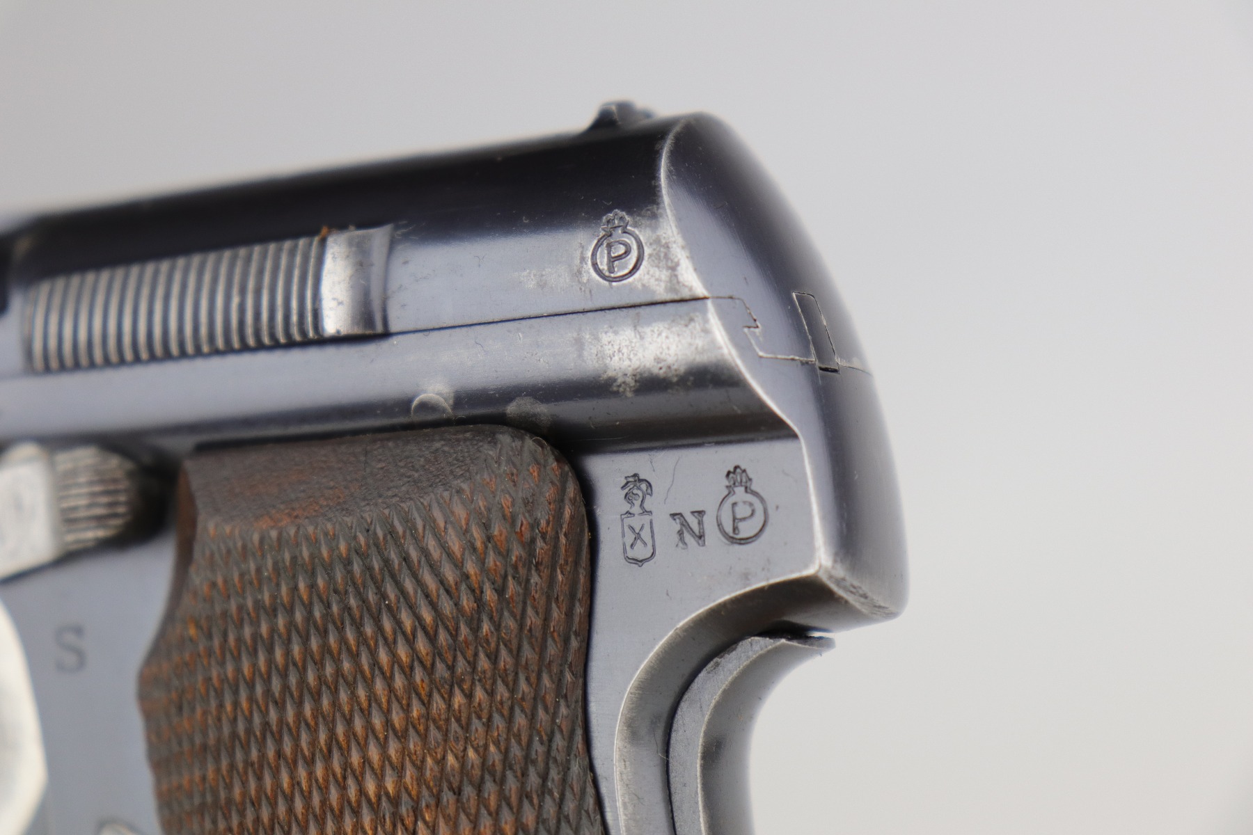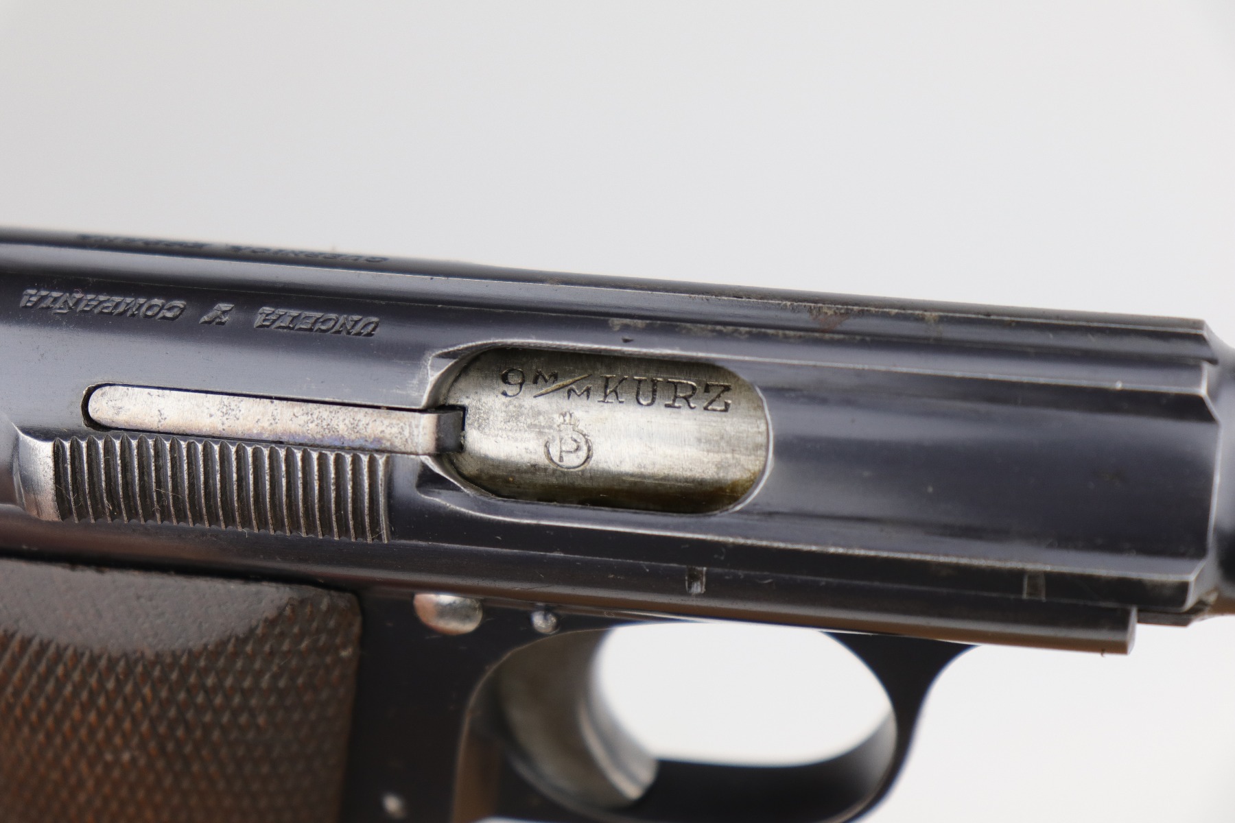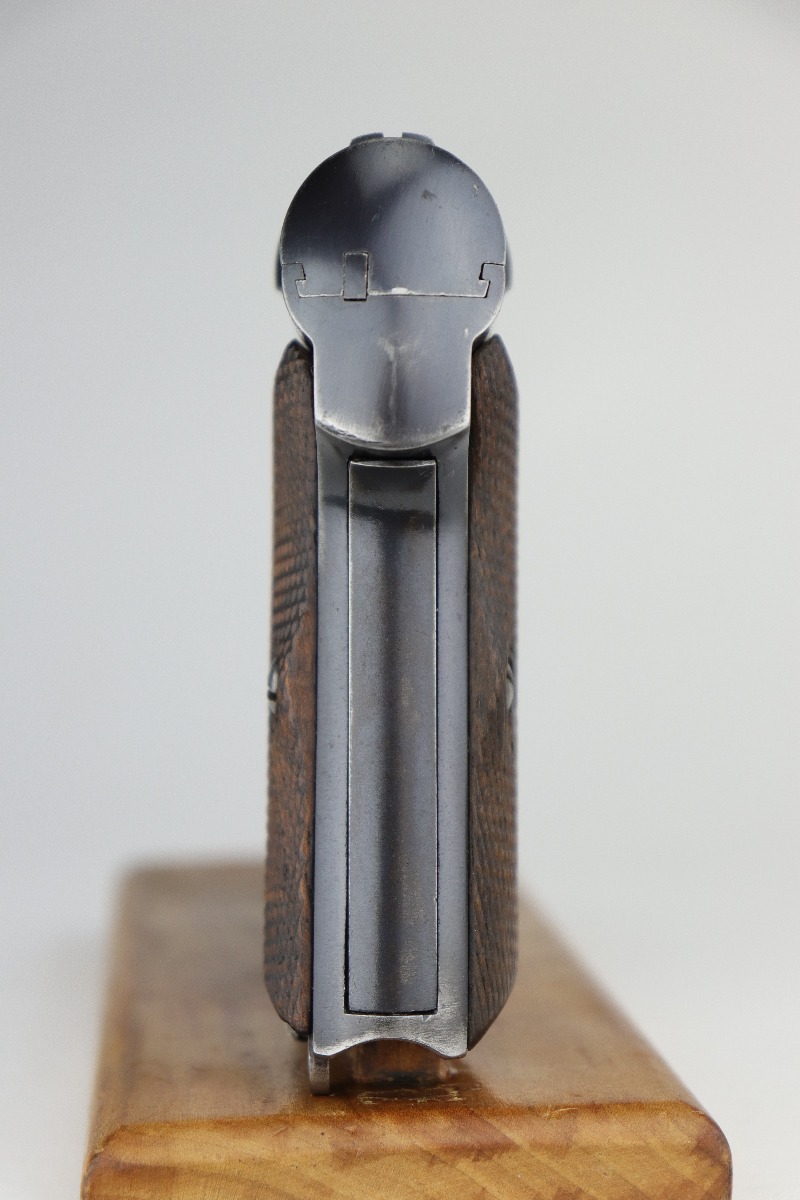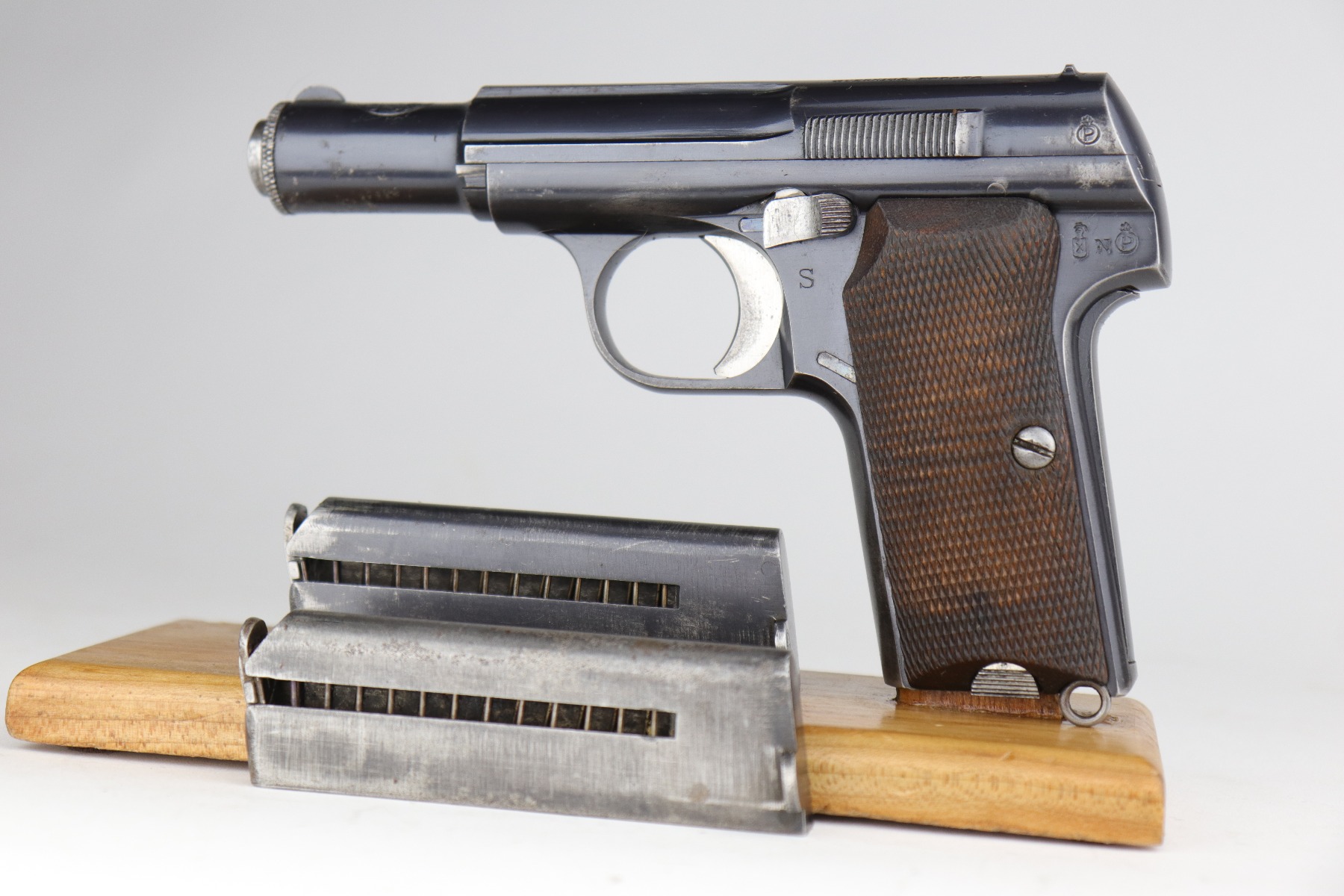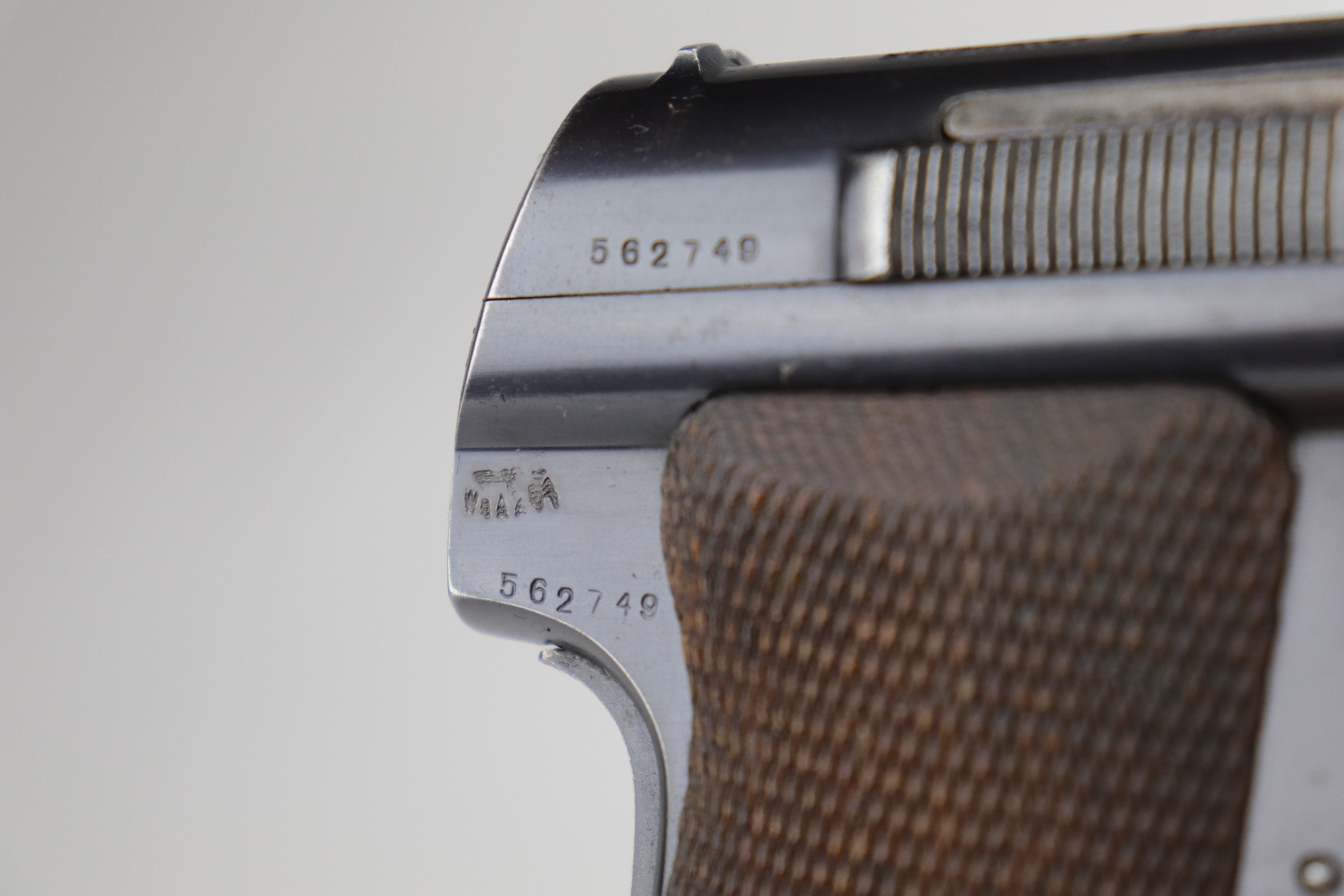 8/12/20 – This is an original Spanish-made Astra 300 rig issued to the Nazi Army in February of 1943. The gun is all matching and has the proper “Waffen 251” Nazi military acceptance proof on the tang. This rig also comes with a holster and two magazines. This particular pistol has retained about 85% of its original bluing. There is thinning on both of the straps and areas of spotty wear and minor freckling on the underside of the slide and left rear of the slide. There is also some minor thinning on the left side of the gun toward the center. Very nice original grips. The holster is in decent shape, but there is light cracking throughout and a small hole in the mag pouch. There is a Nazi waffen ink stamp on the inside. The rig also includes two period-correct magazines. The bore is shiny with nice rifling.